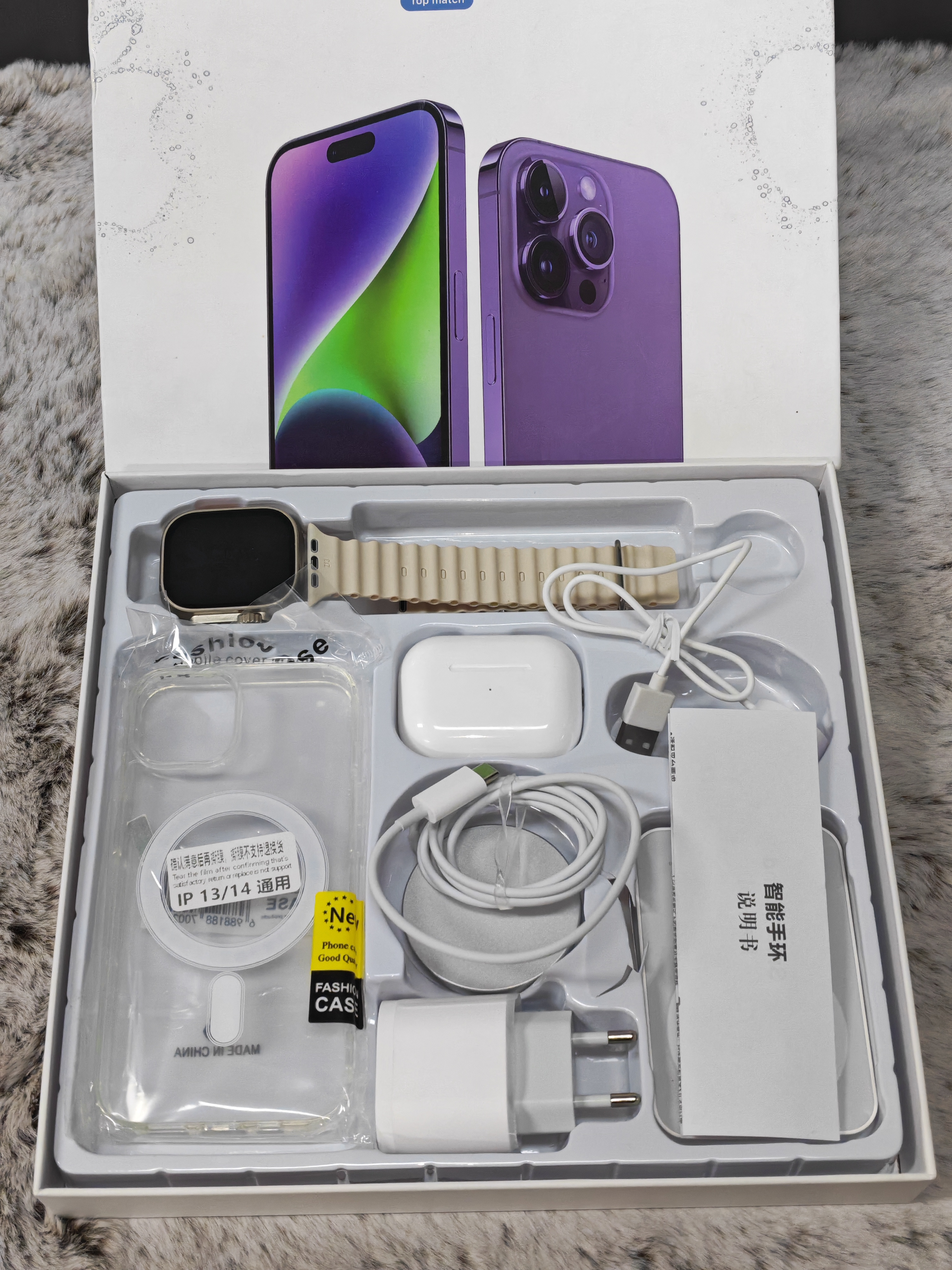 包含:20W充电器+快充线、耳机、磁吸充电板、智能手表