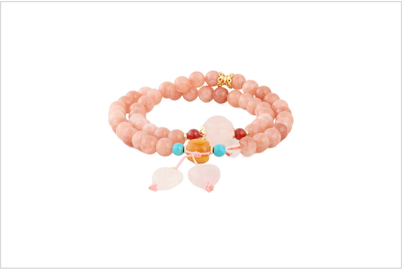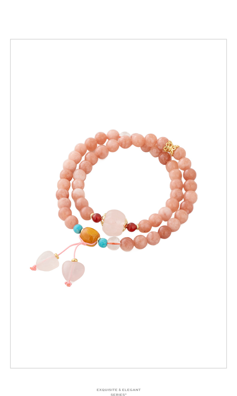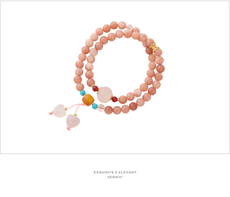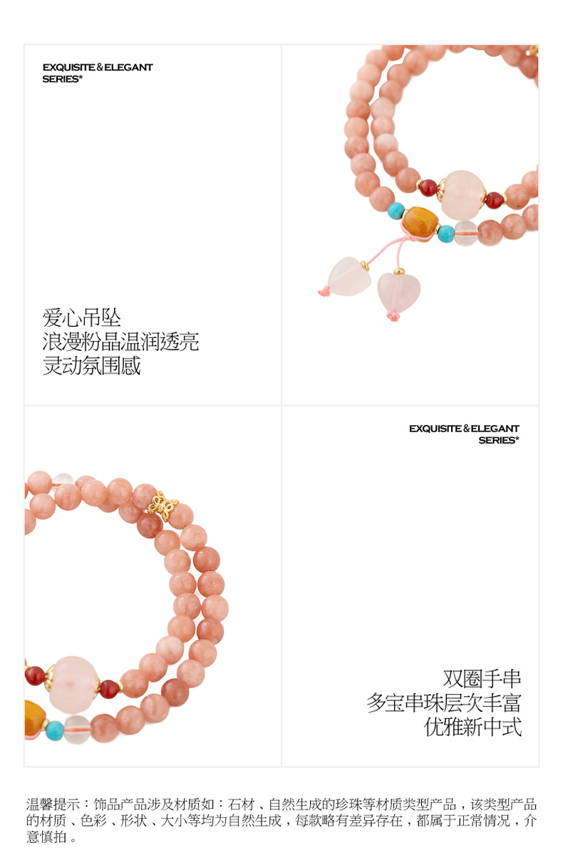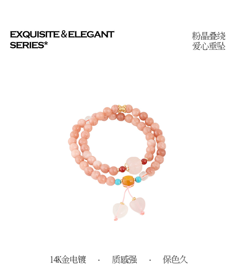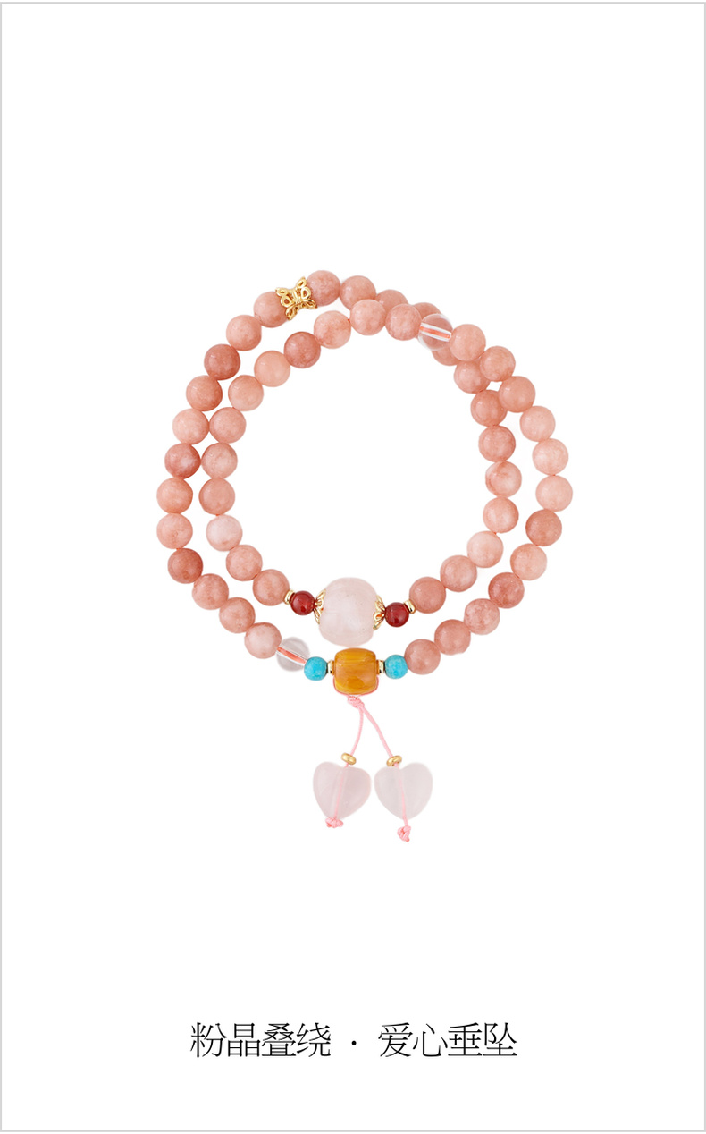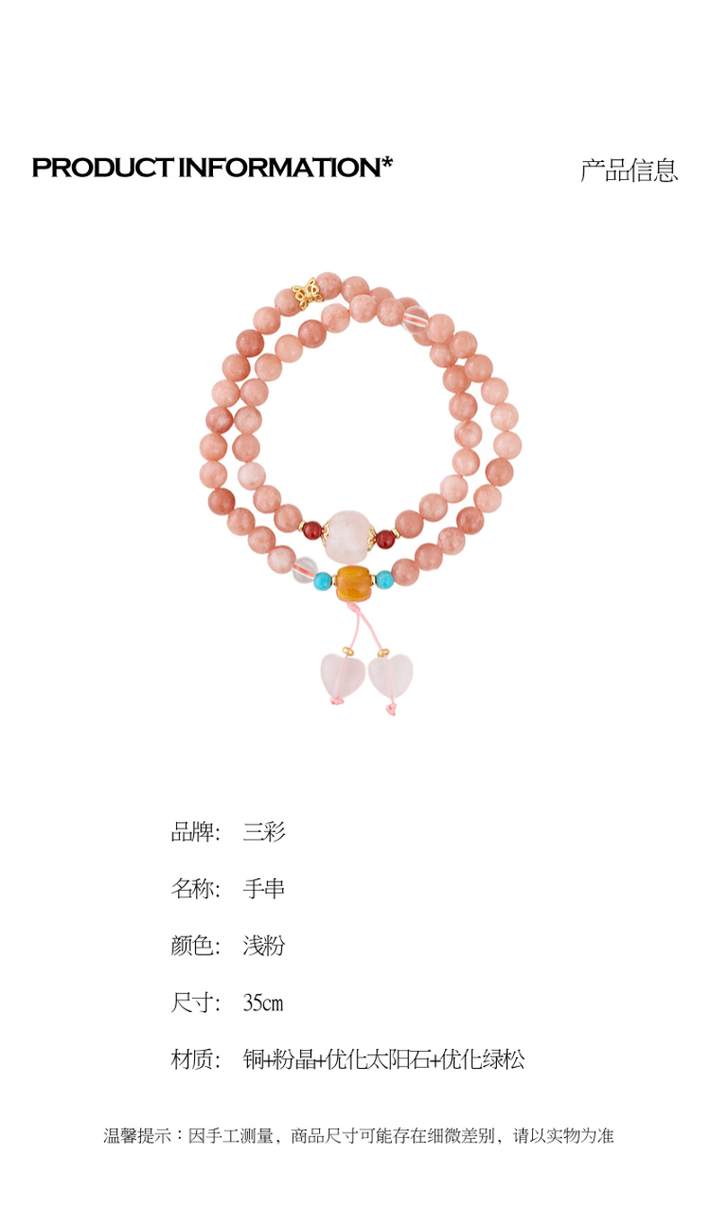 三彩2026新款粉晶太阳石双圈串珠手串国风爱心吊坠通勤出游撞色女