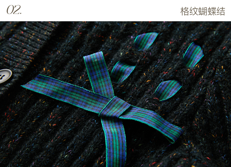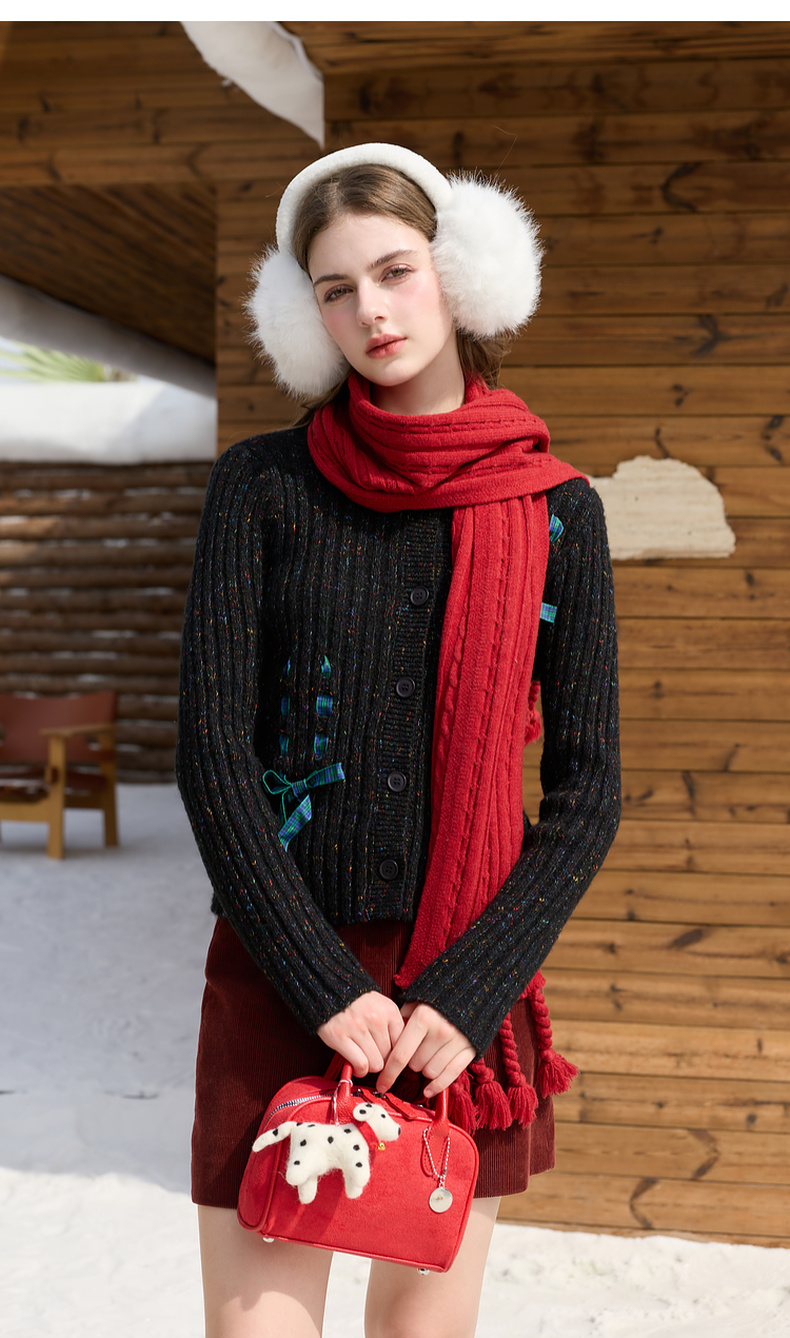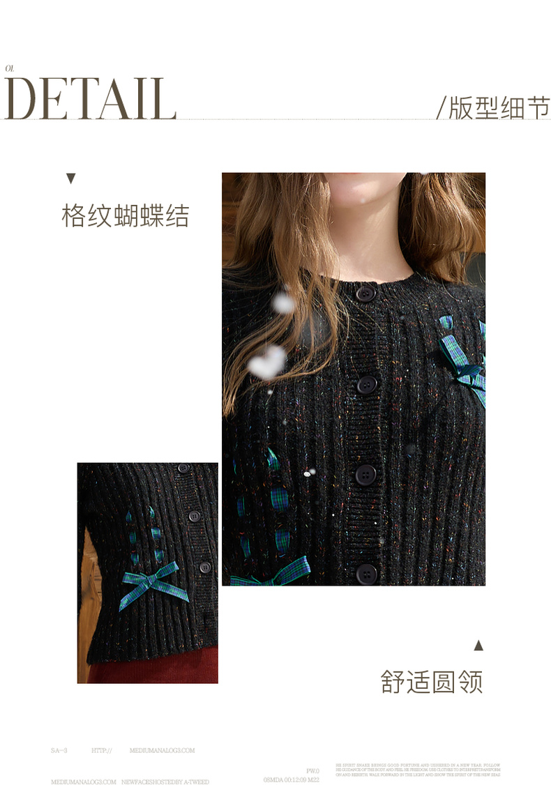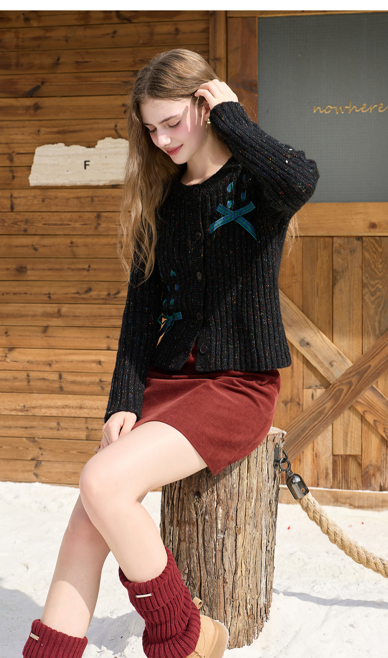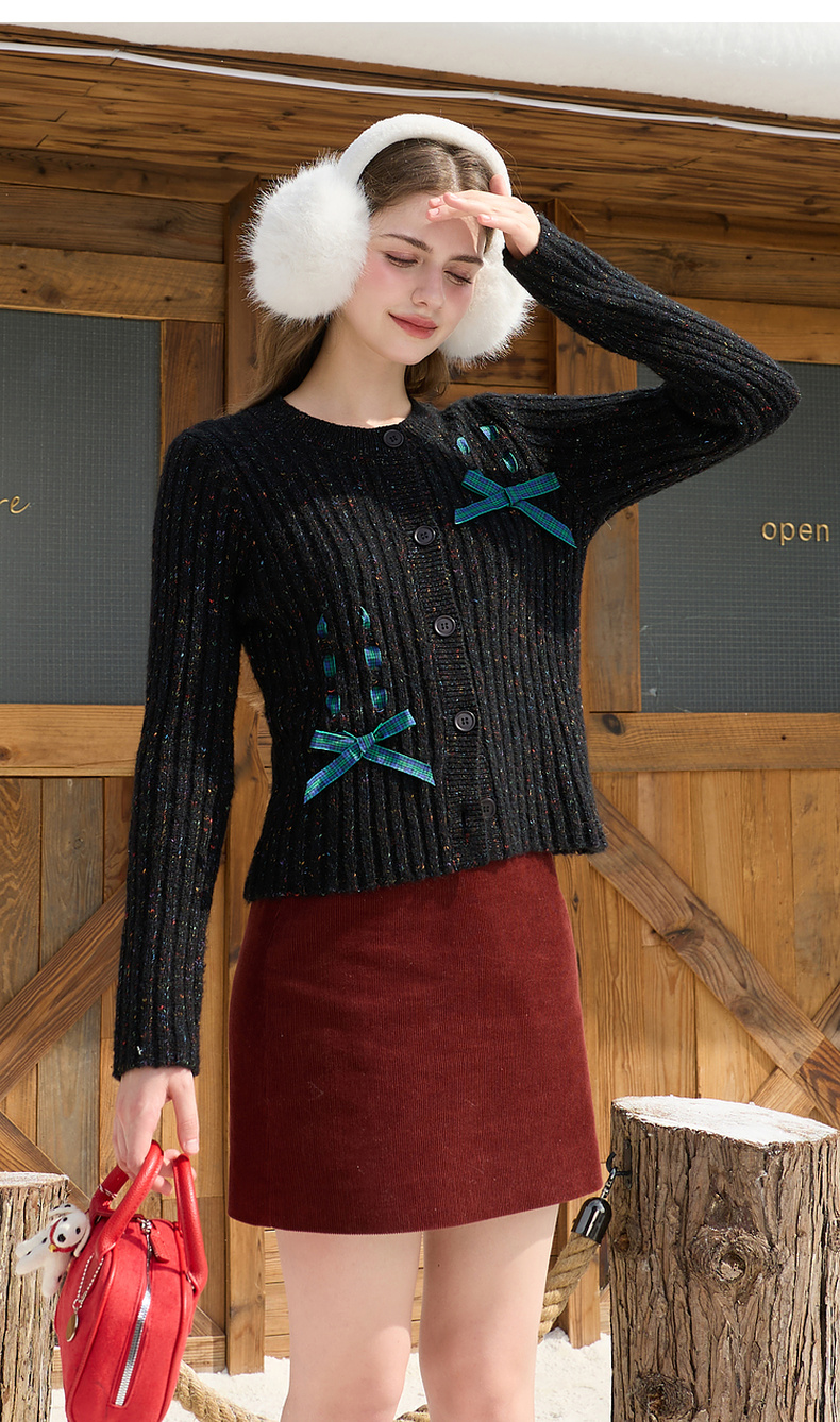 三彩2025冬季新款蝴蝶结针织衫开衫毛衫外套短款圆领修身显瘦M