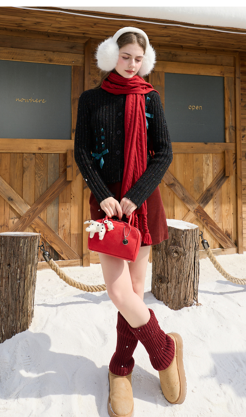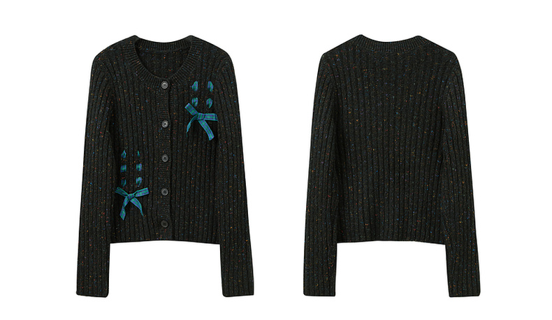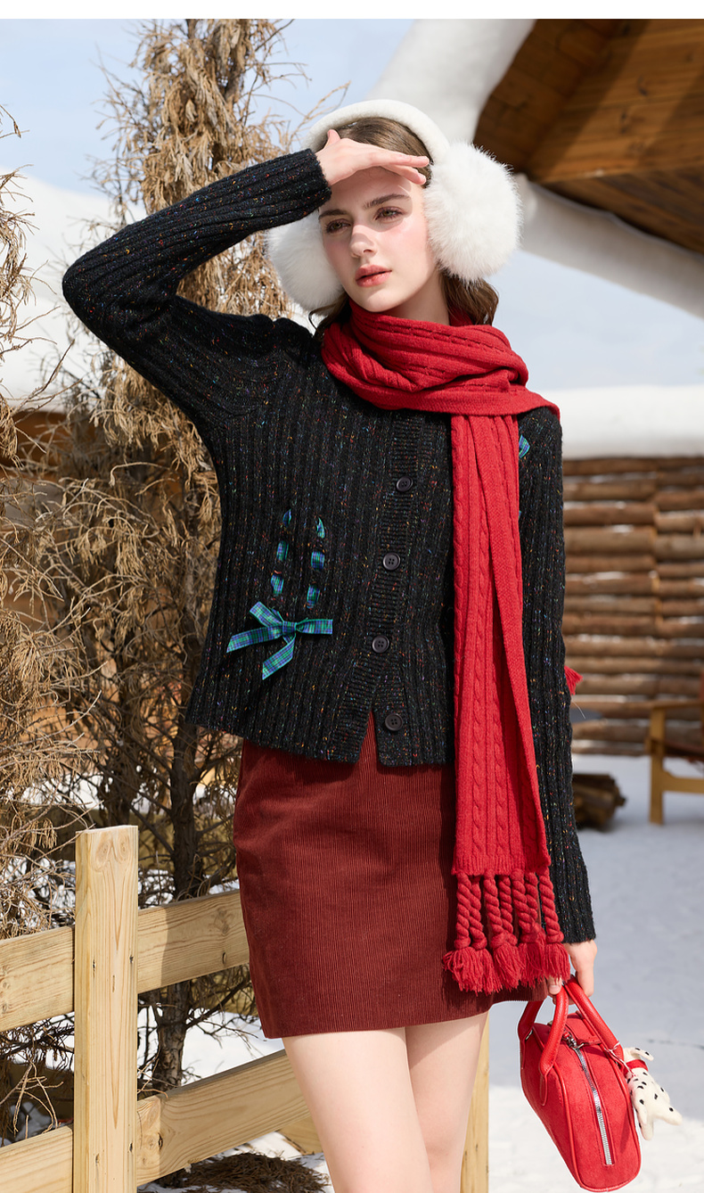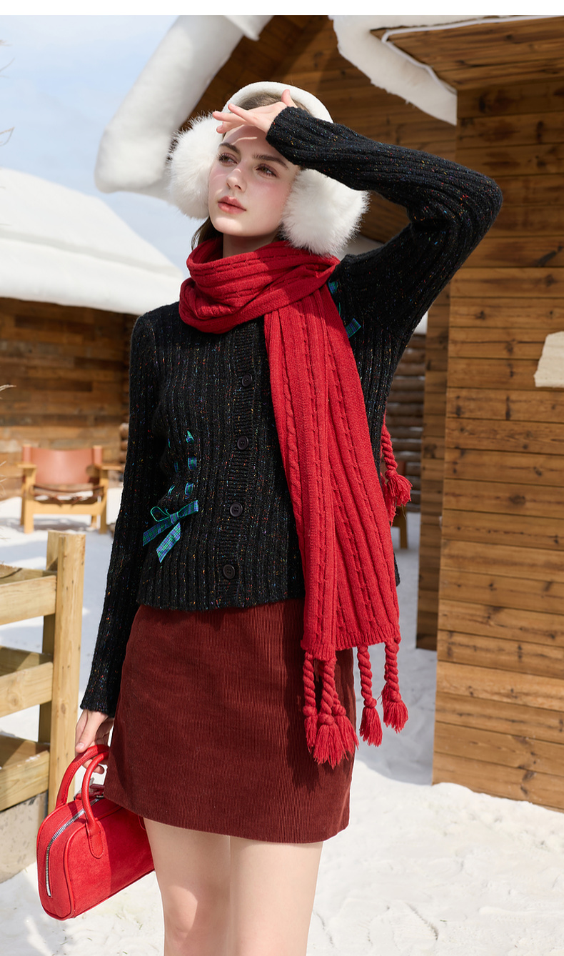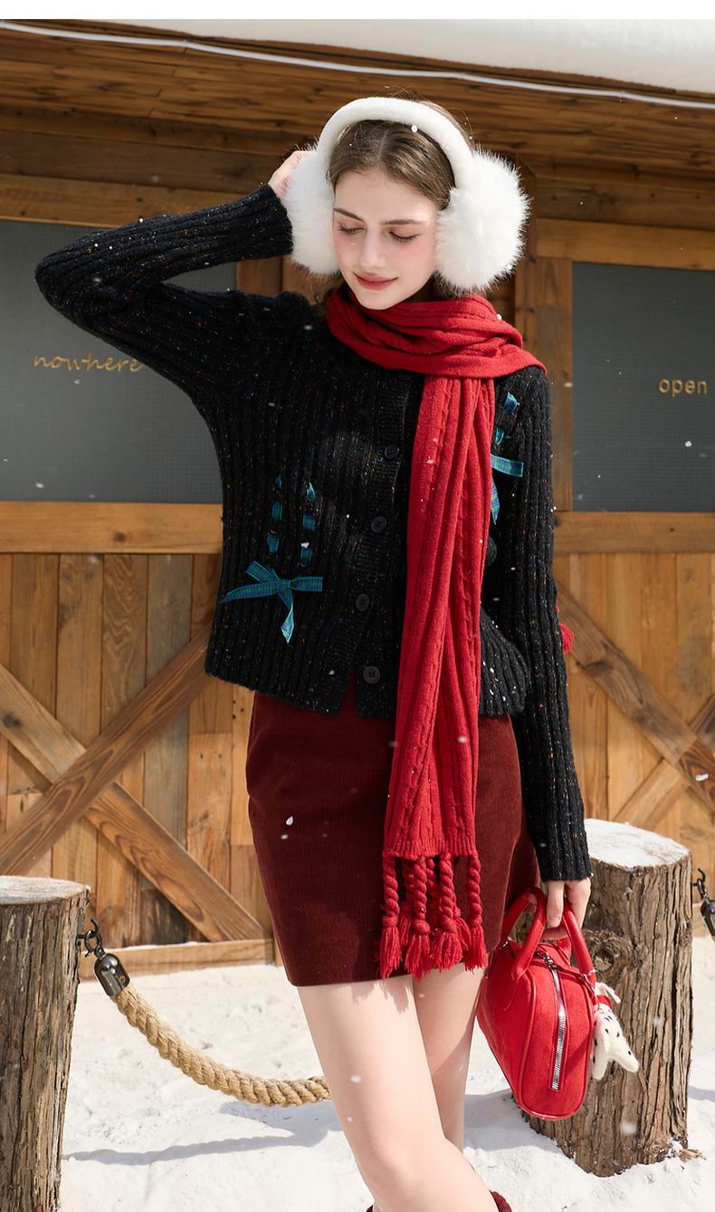 三彩2025冬季新款蝴蝶结针织衫开衫毛衫外套短款圆领修身显瘦M