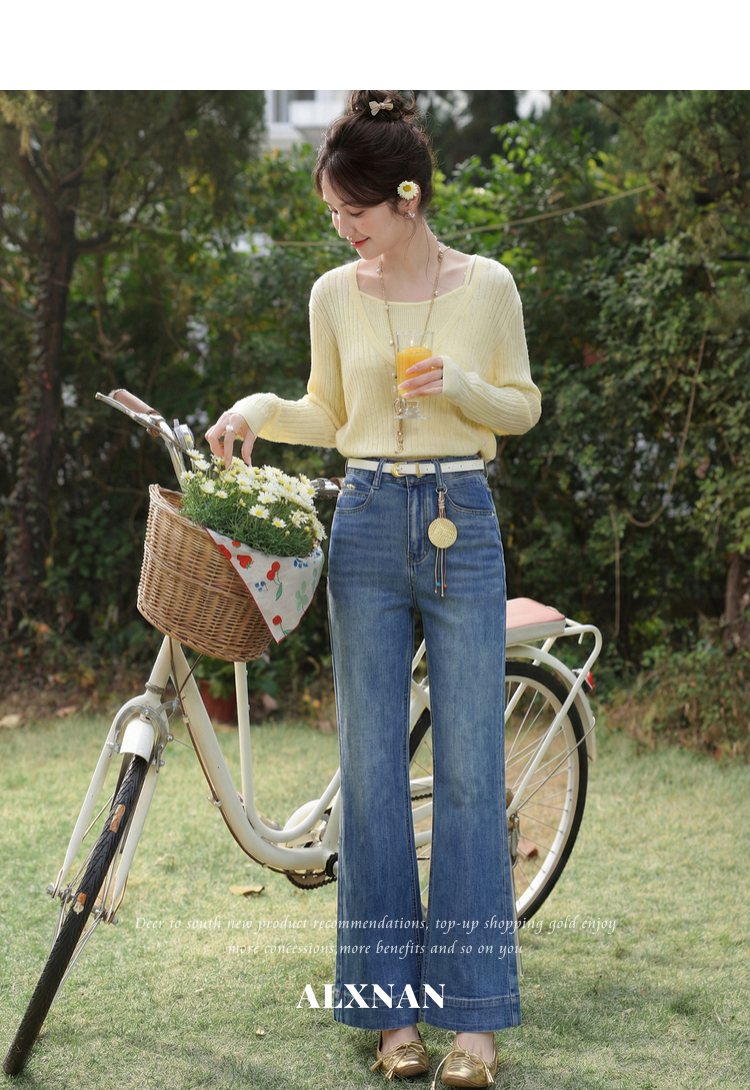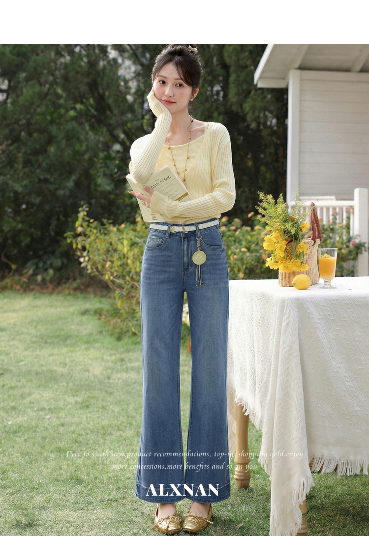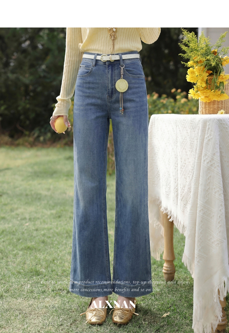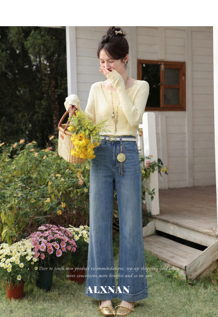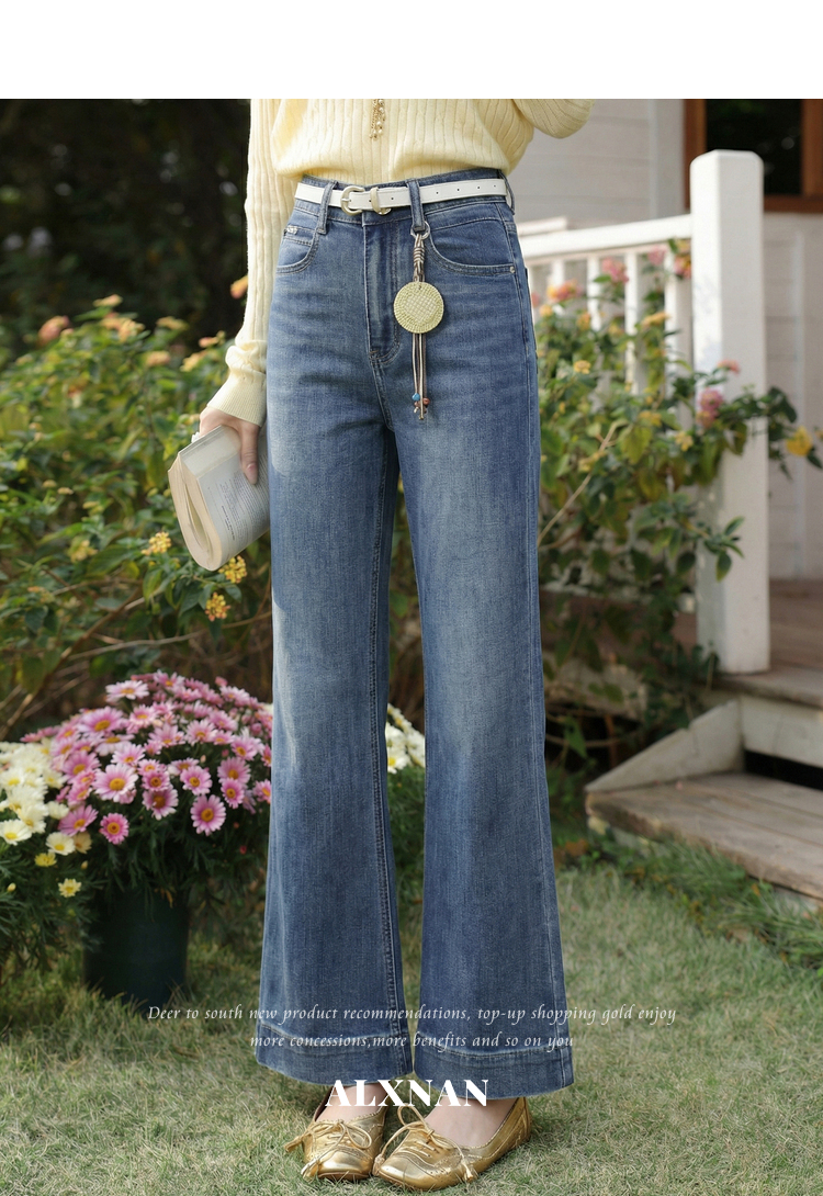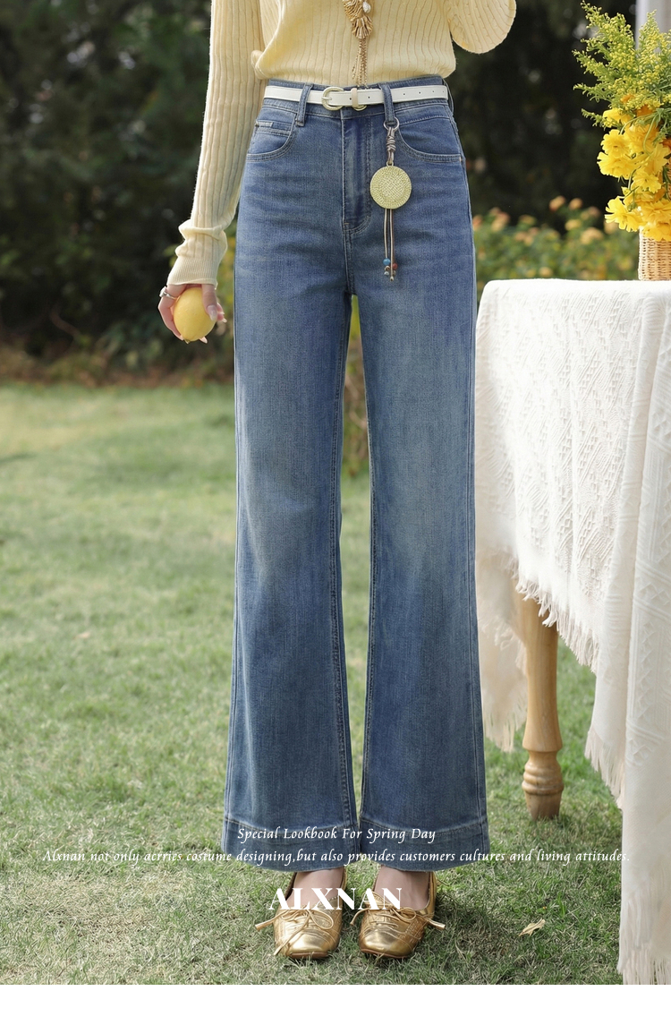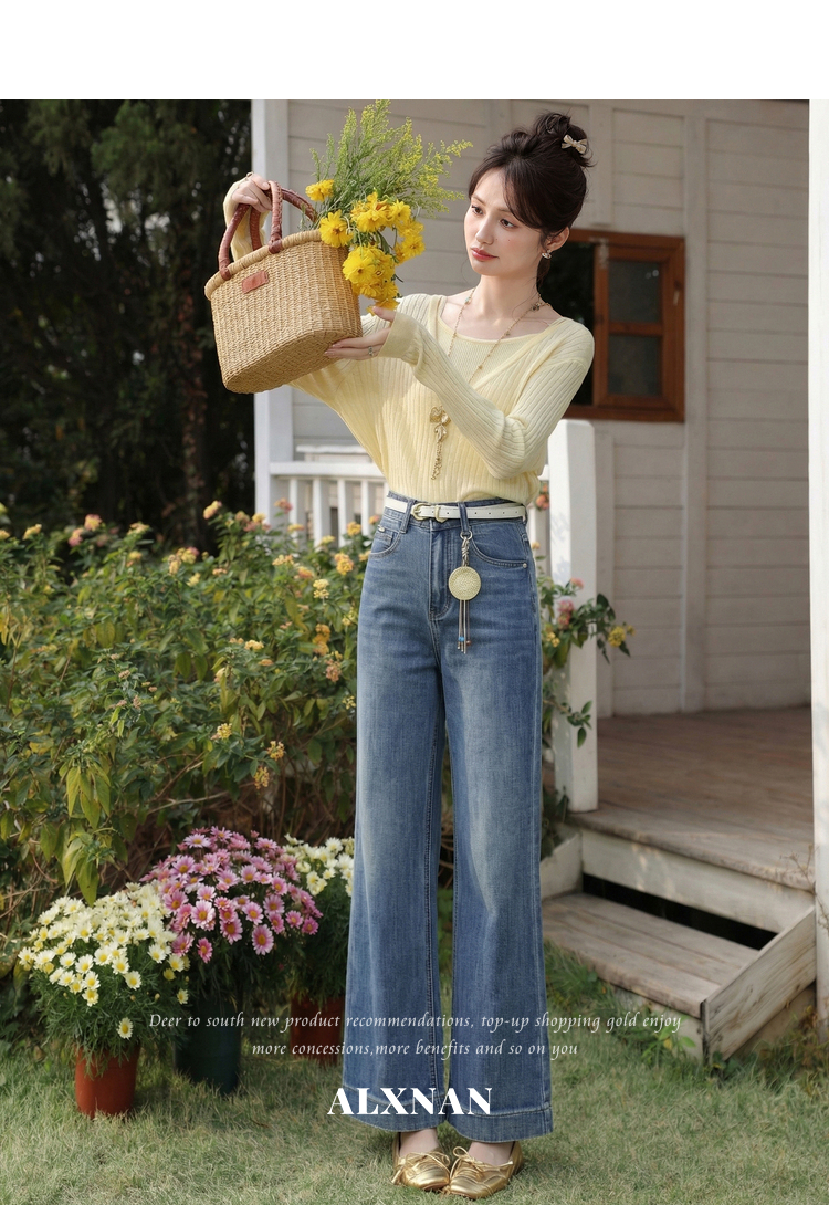 鹿向南「海隅闲行」蓝色牛仔裤春季新款时尚高腰修身直筒长裤女