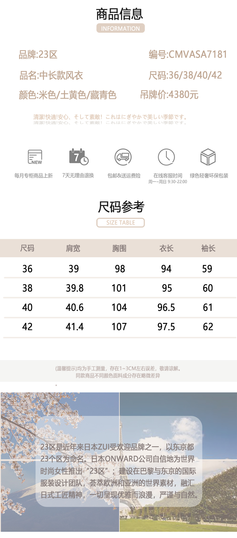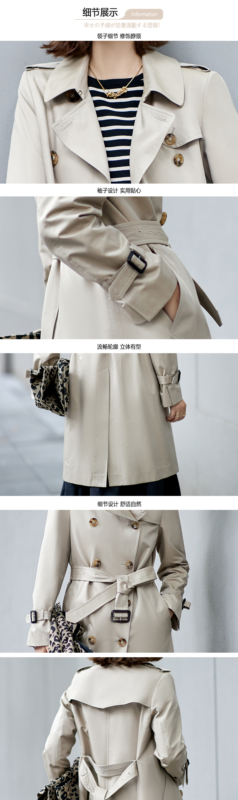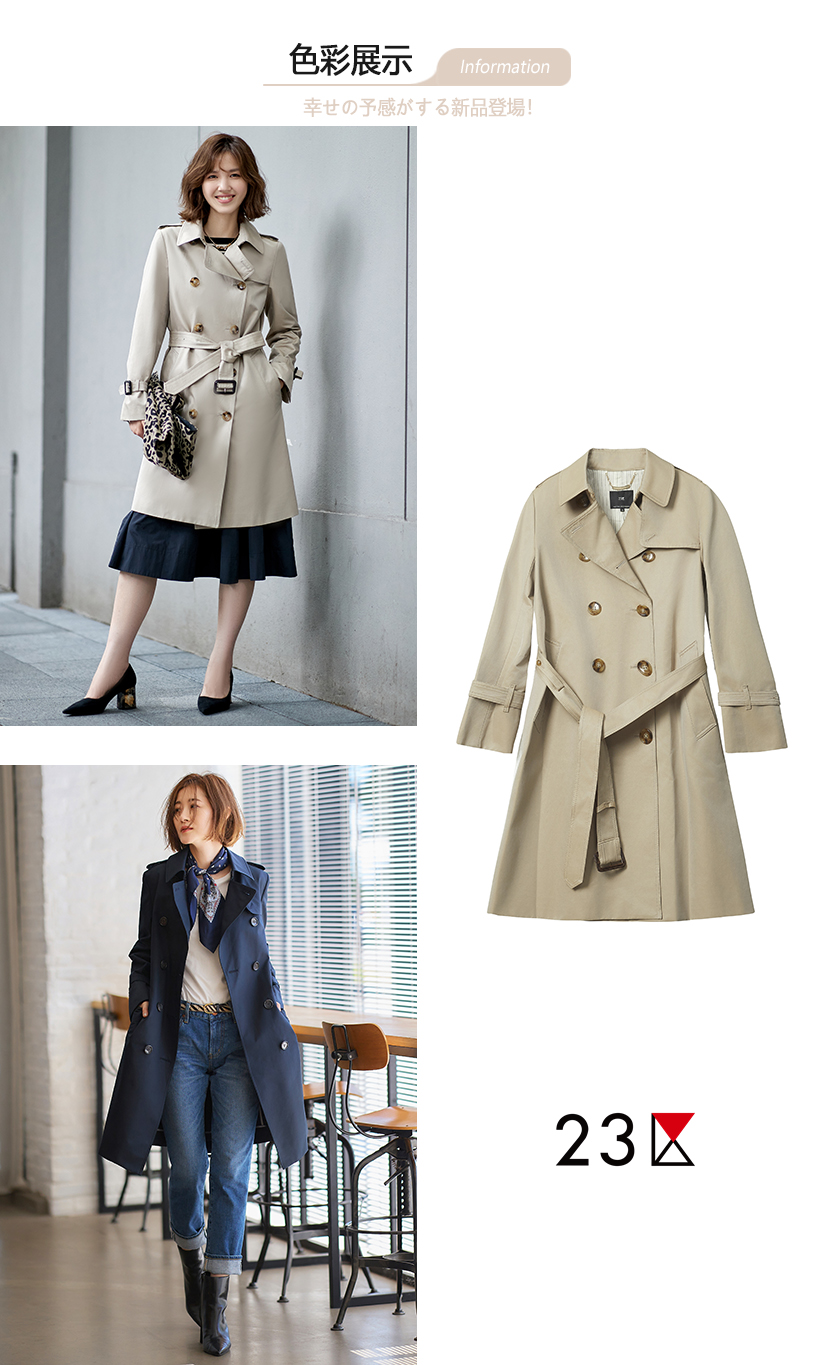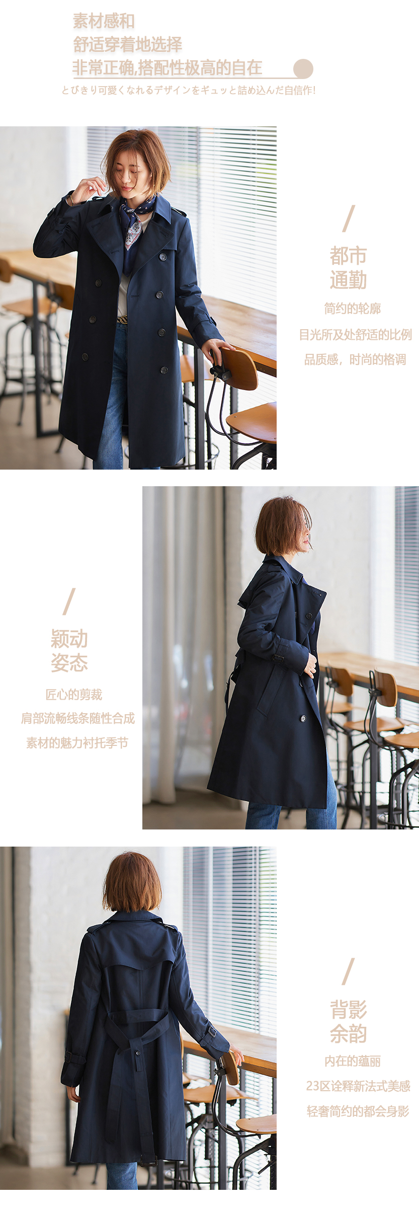 23区日系春季通勤直筒棉混纺双排扣中长款风衣腰带长外套商场同款