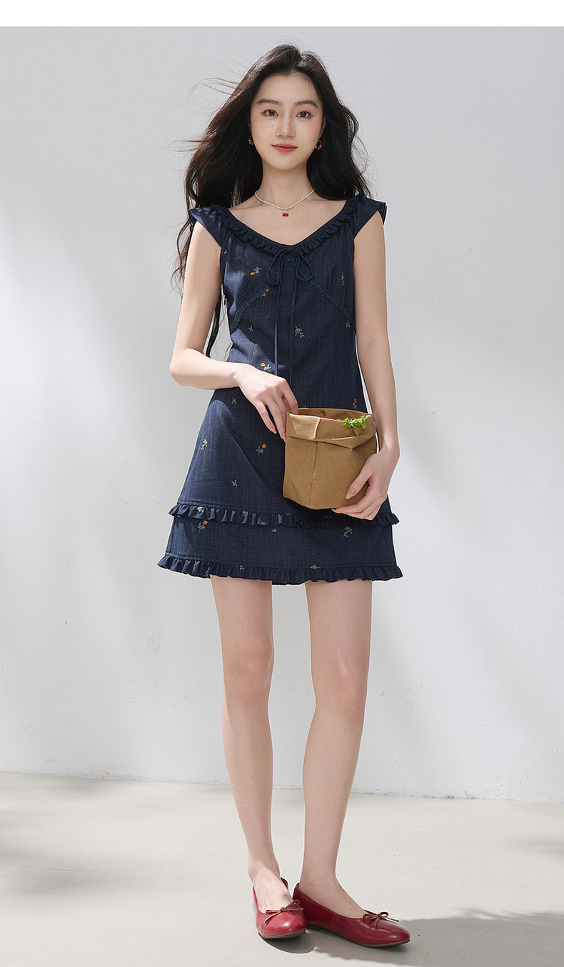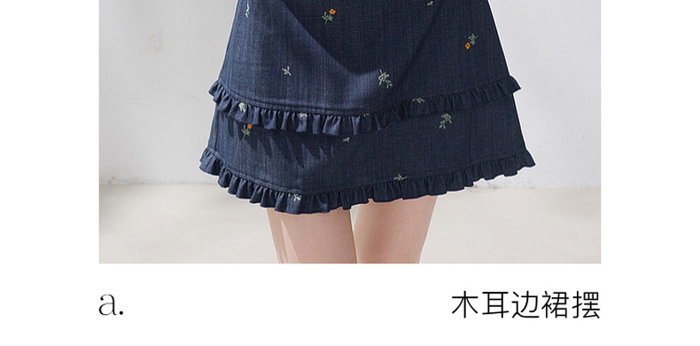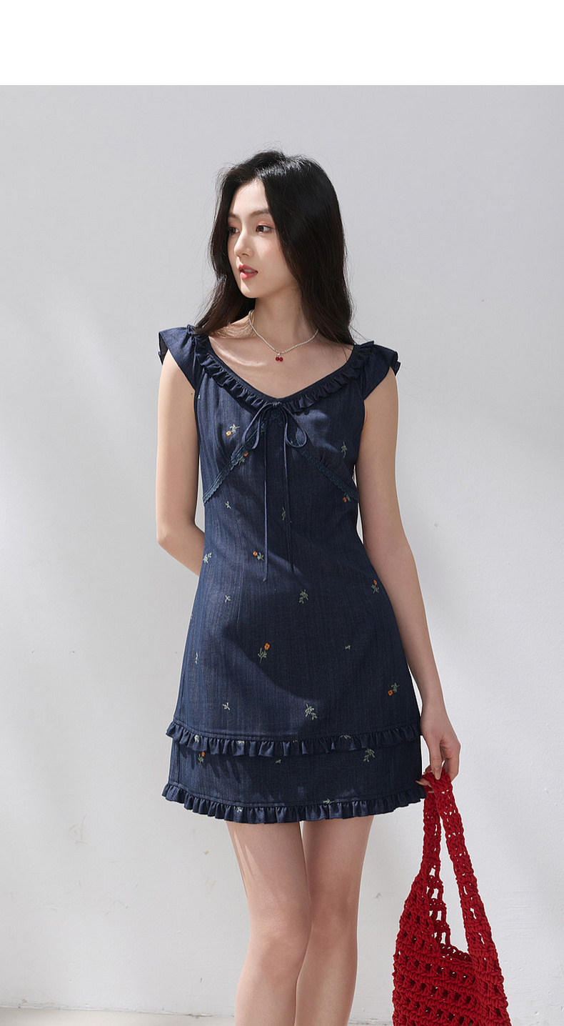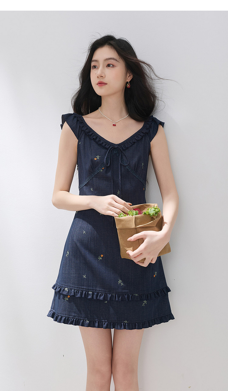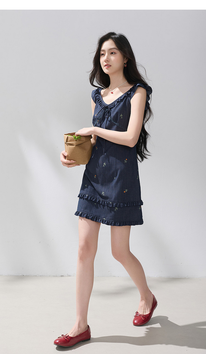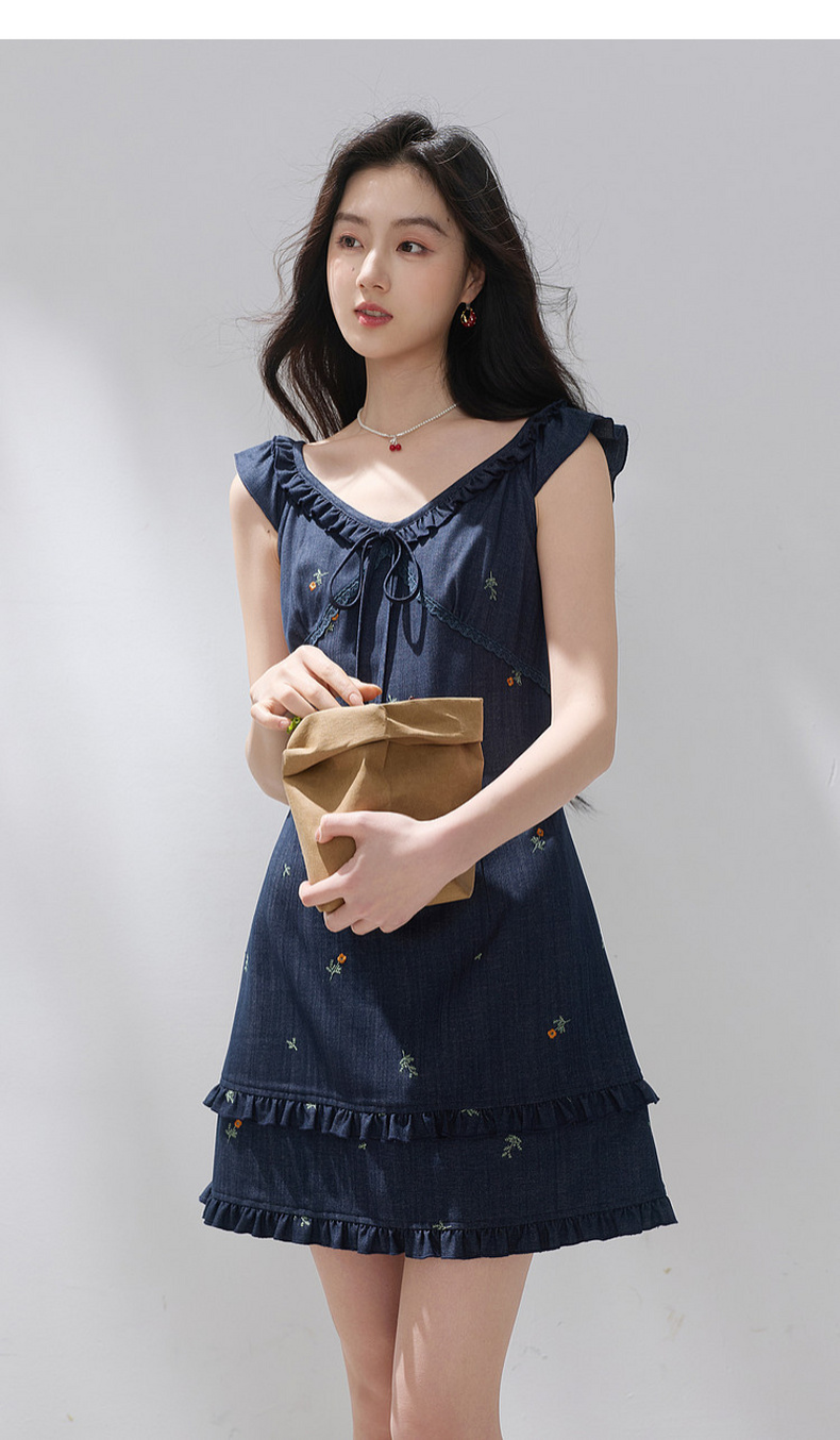 三彩2026夏季新款仿牛仔连衣裙木耳边收腰A字裙短裙M