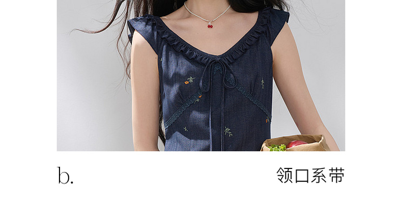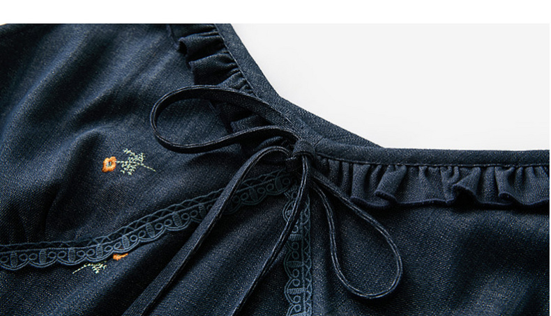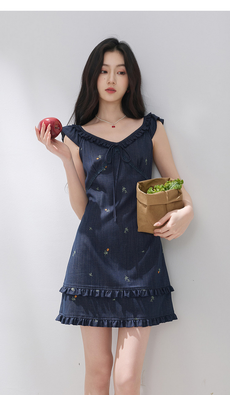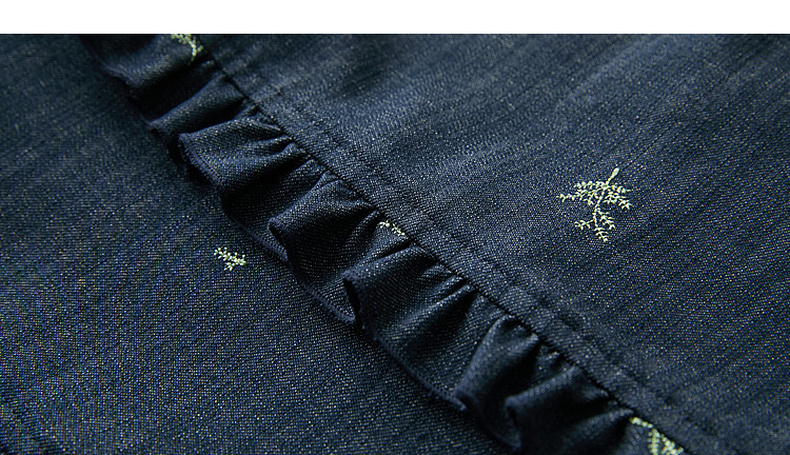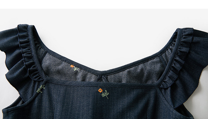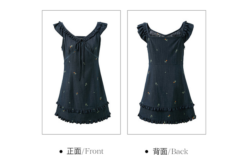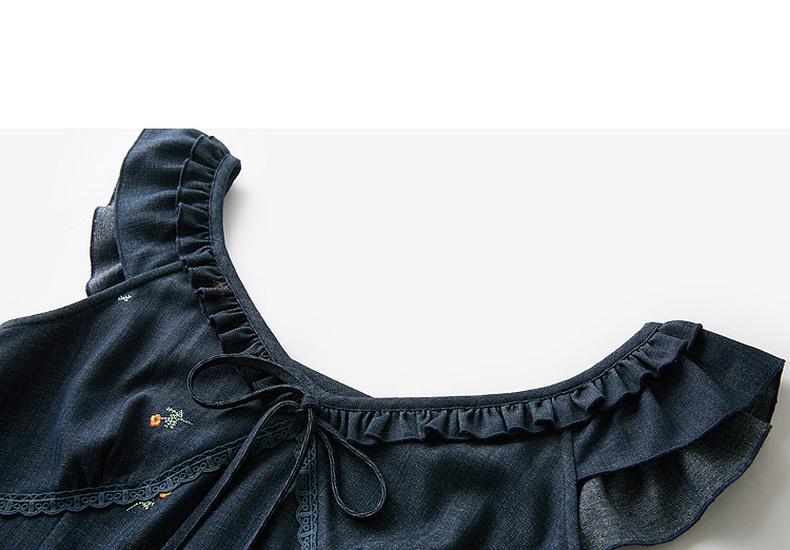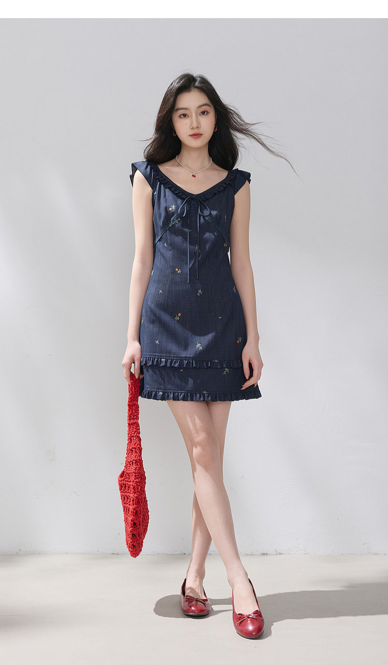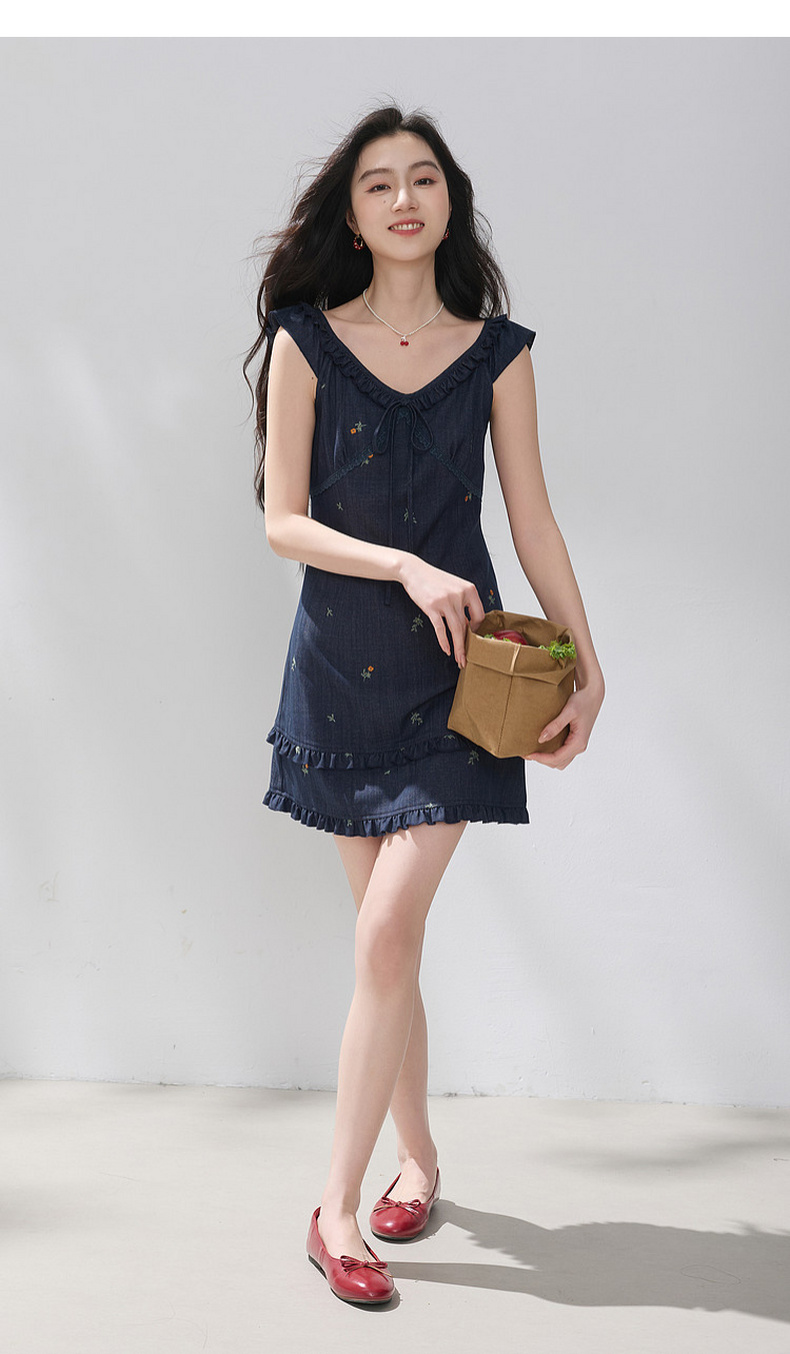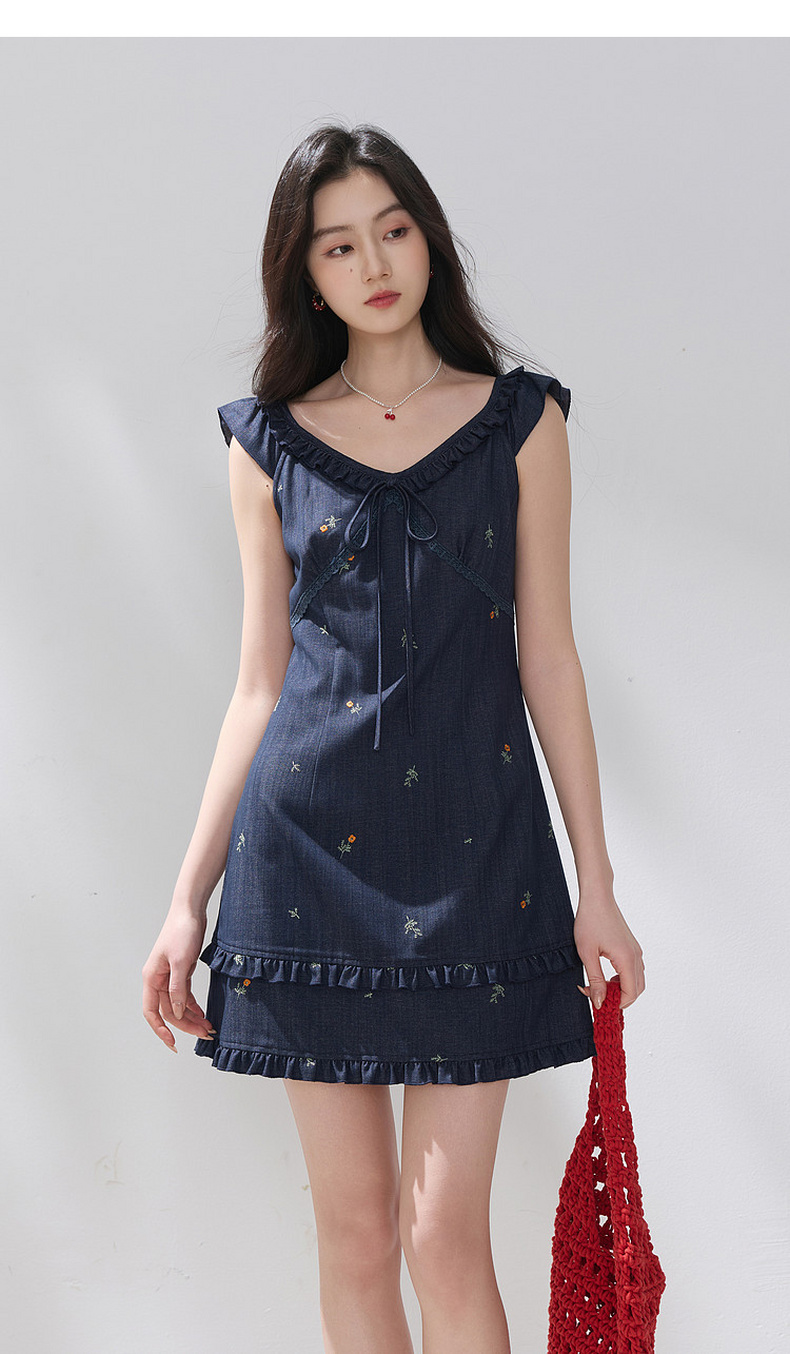 三彩2026夏季新款仿牛仔连衣裙木耳边收腰A字裙短裙M
