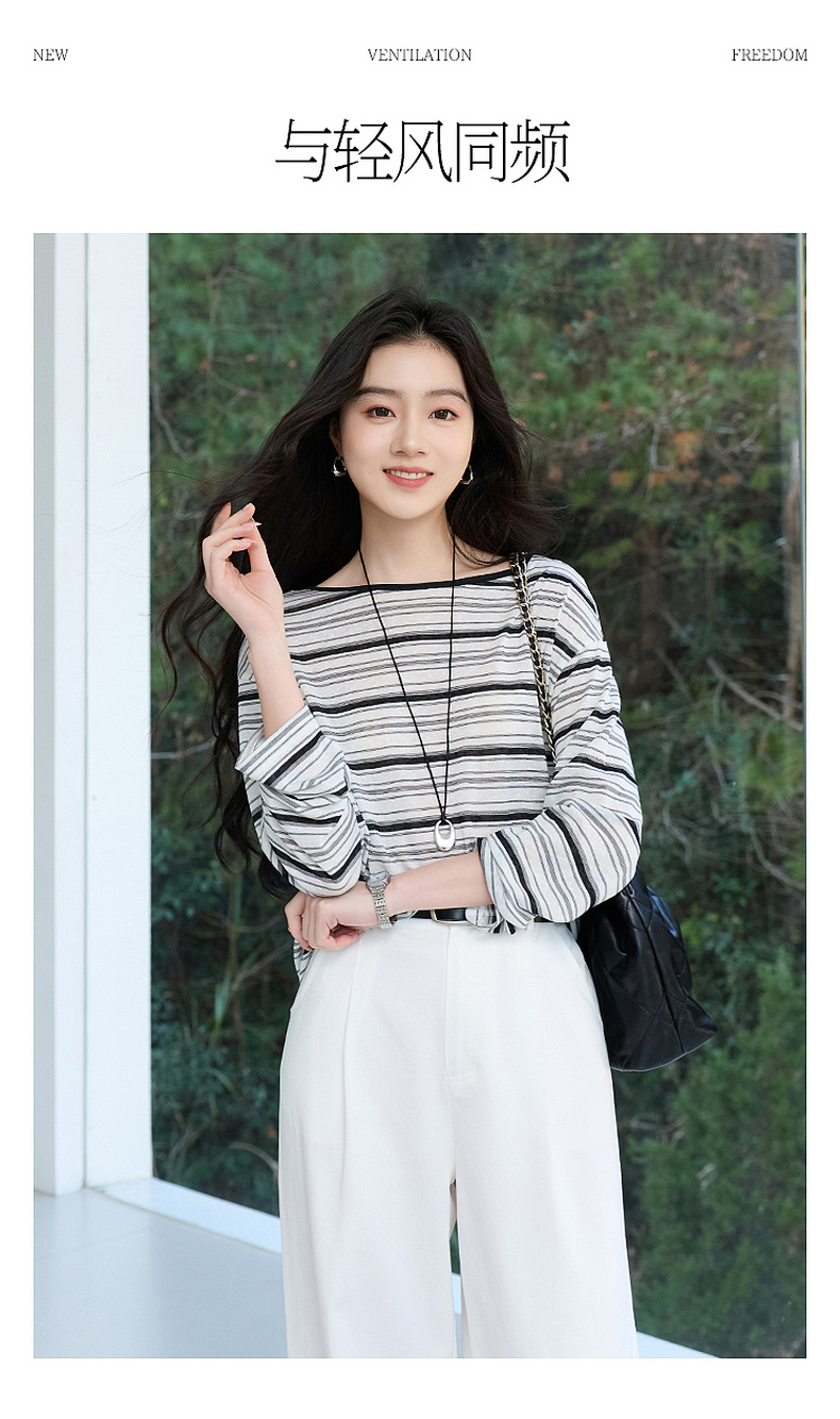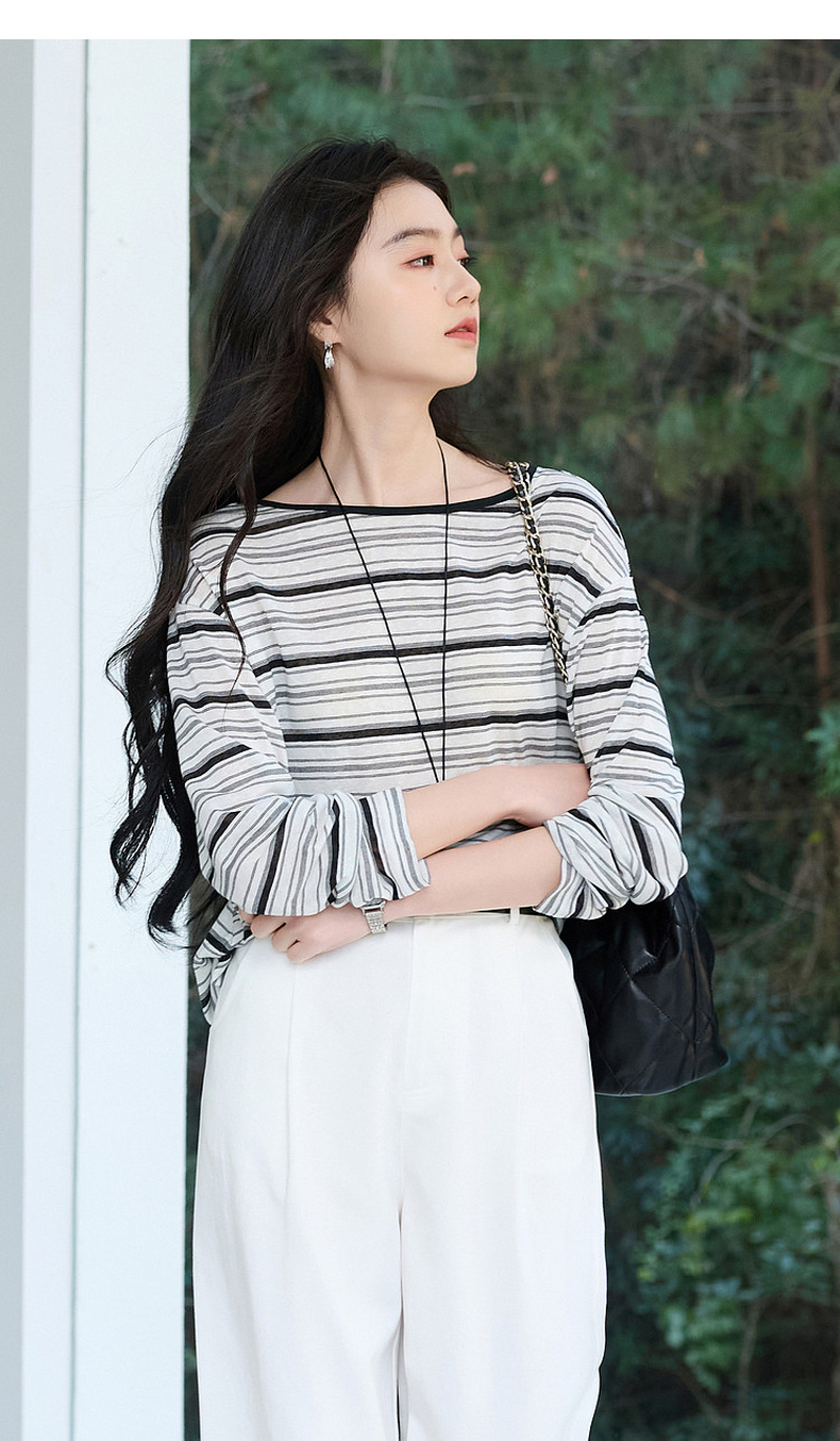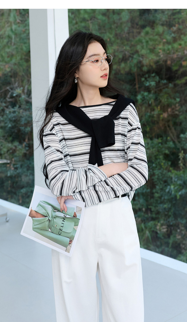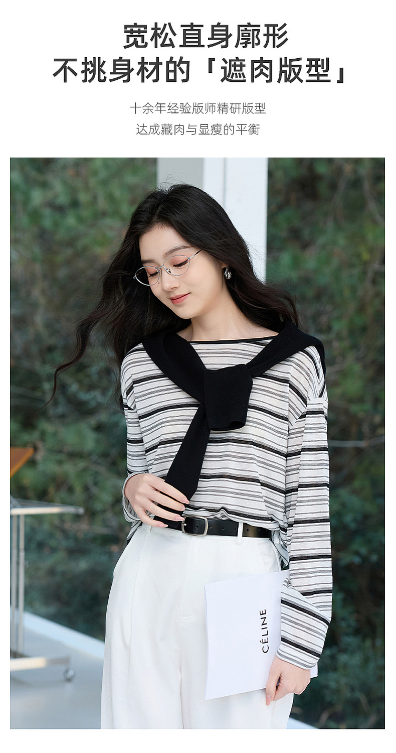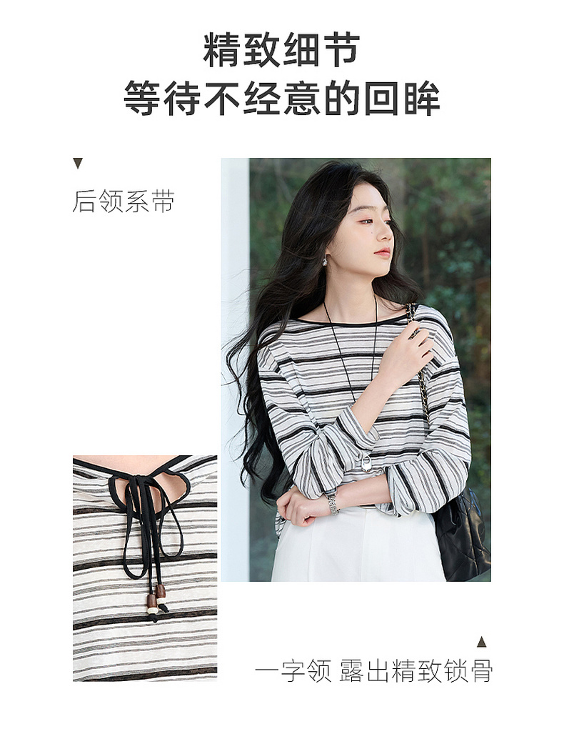 【莱赛尔】三彩2026春季新款一字领条纹T恤长袖上衣宽松罩衫S