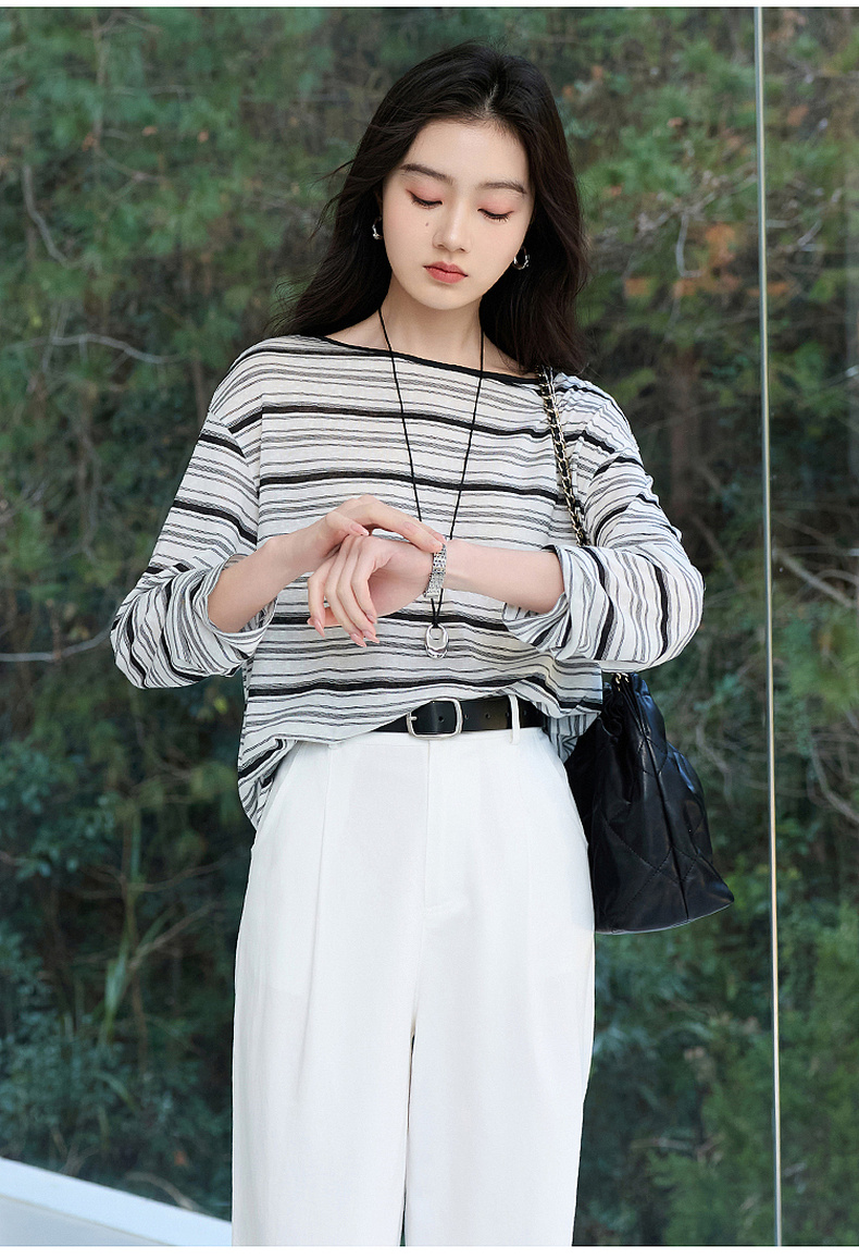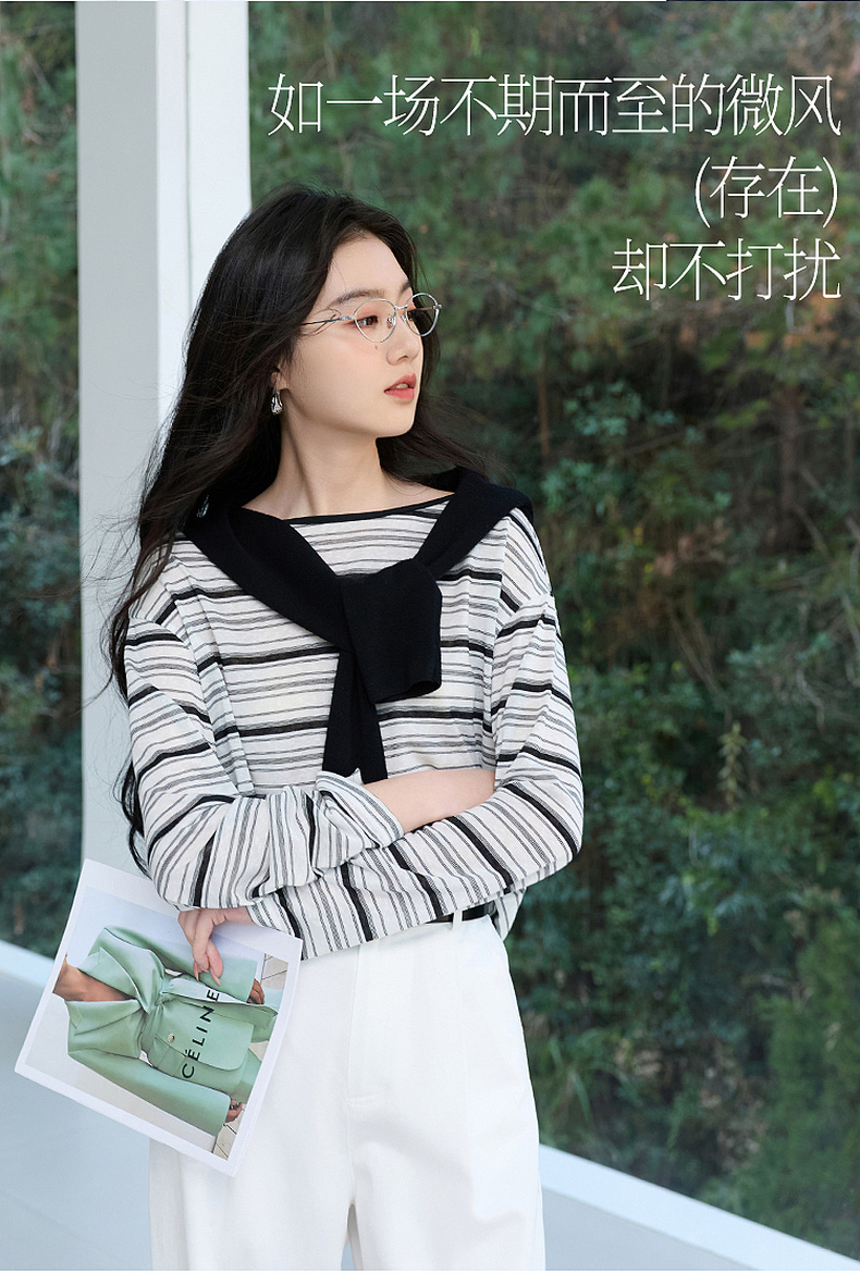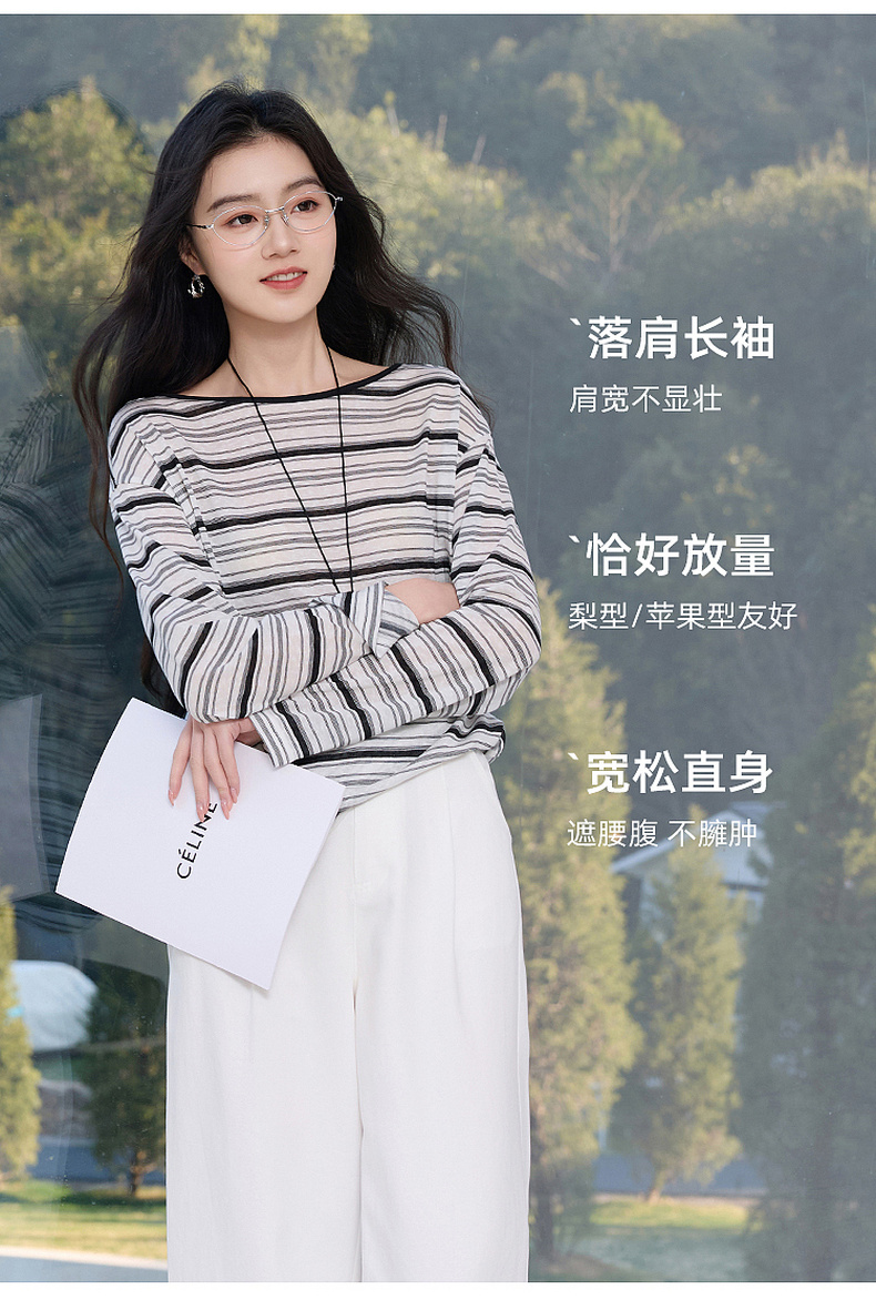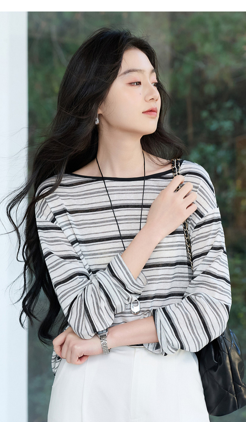 【莱赛尔】三彩2026春季新款一字领条纹T恤长袖上衣宽松罩衫S