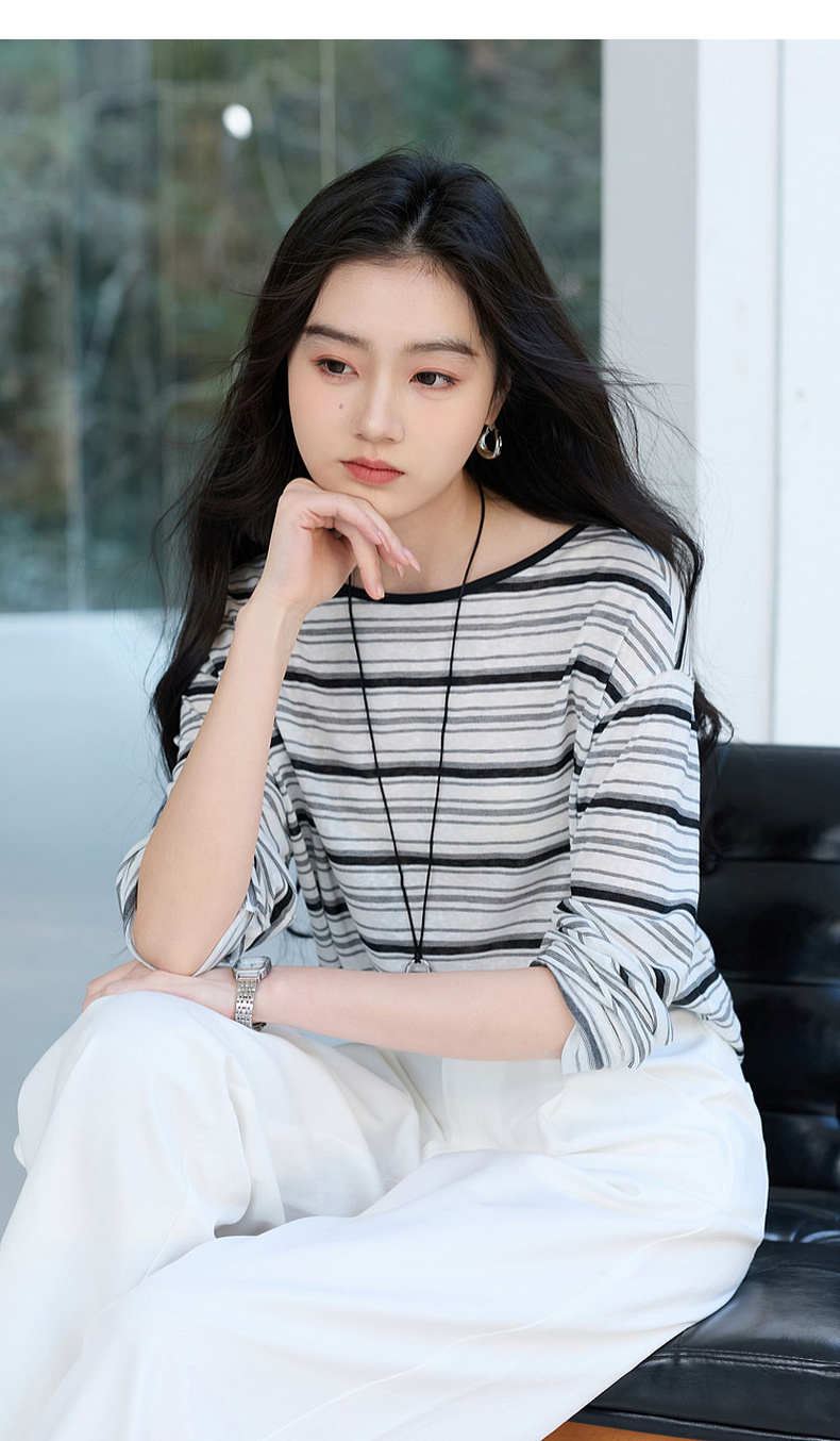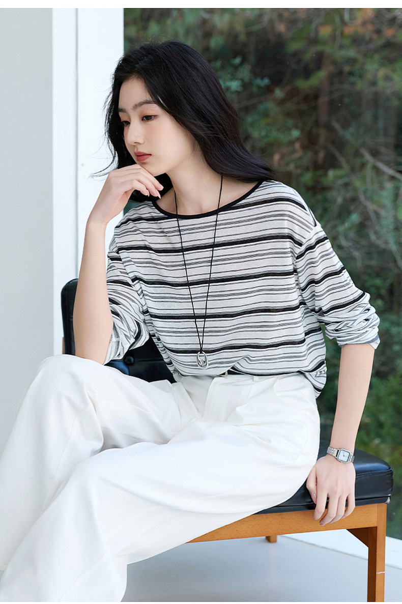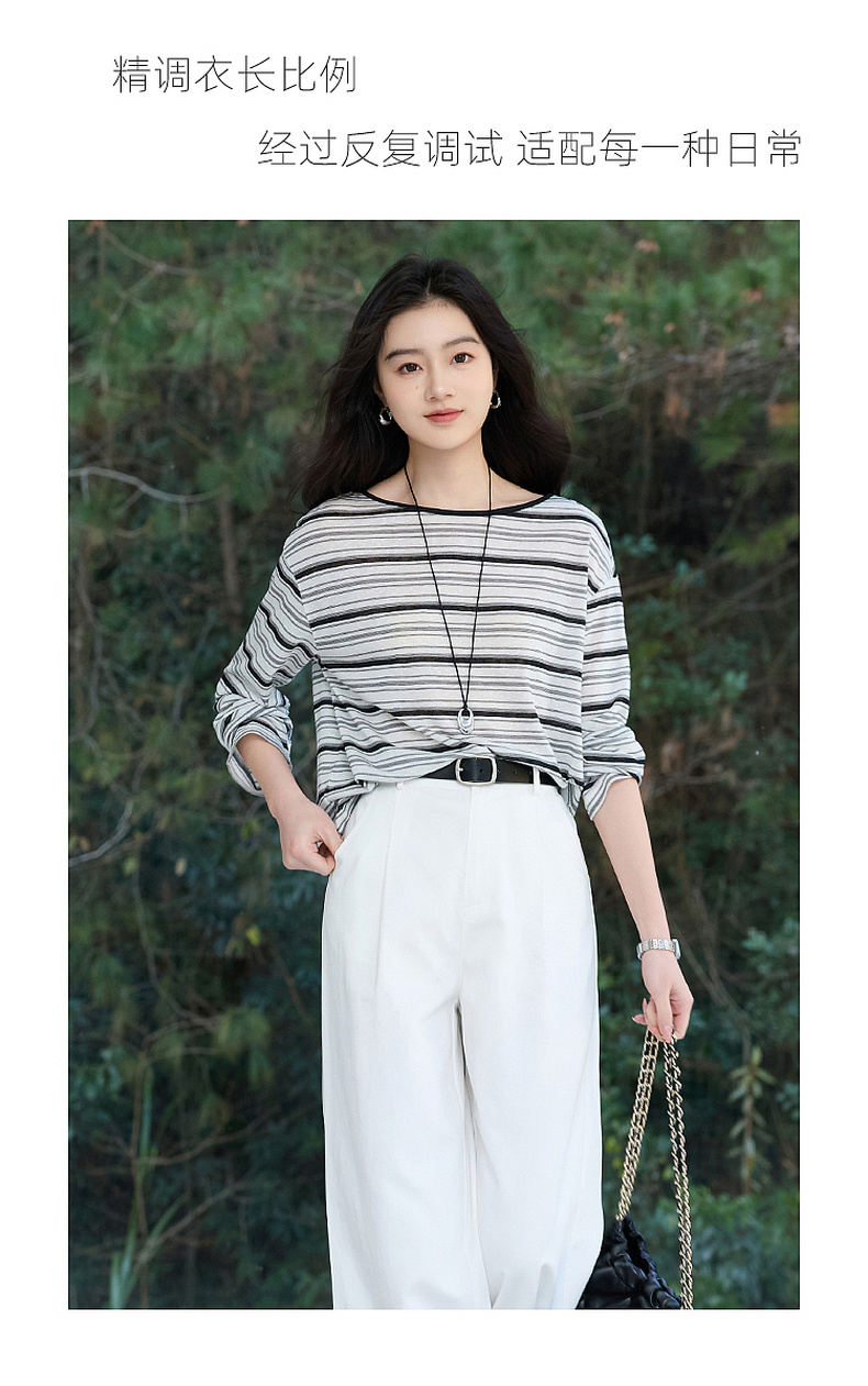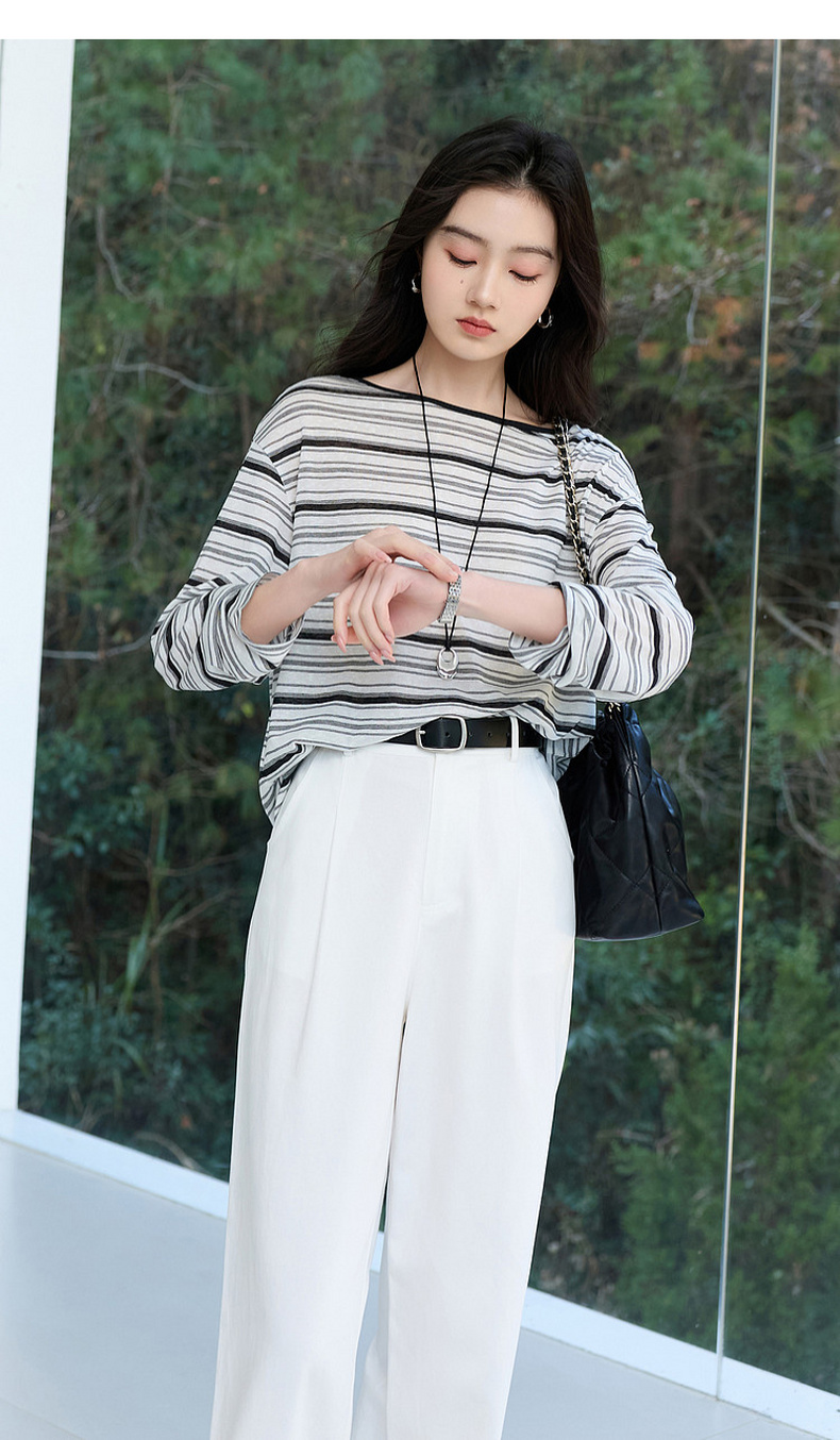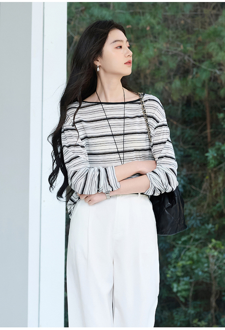 【莱赛尔】三彩2026春季新款一字领条纹T恤长袖上衣宽松罩衫S
