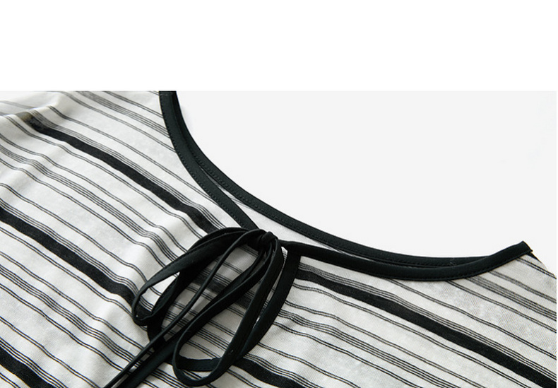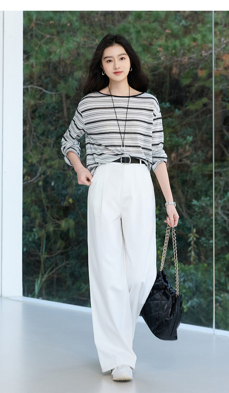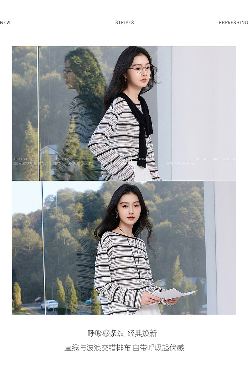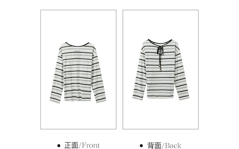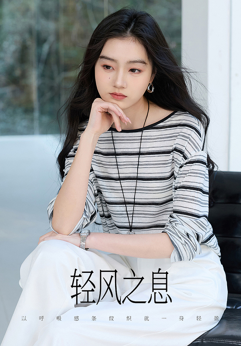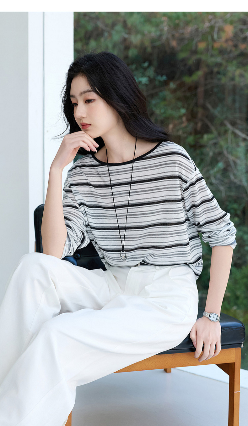 【莱赛尔】三彩2026春季新款一字领条纹T恤长袖上衣宽松罩衫S