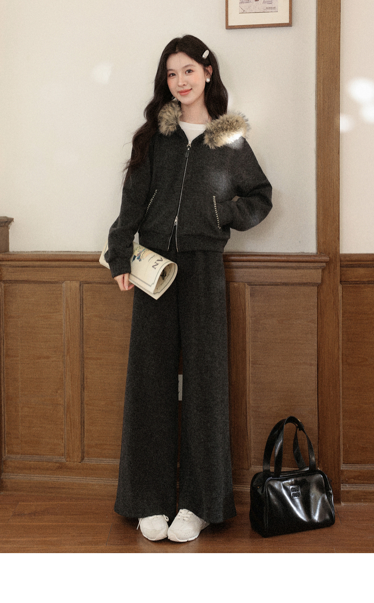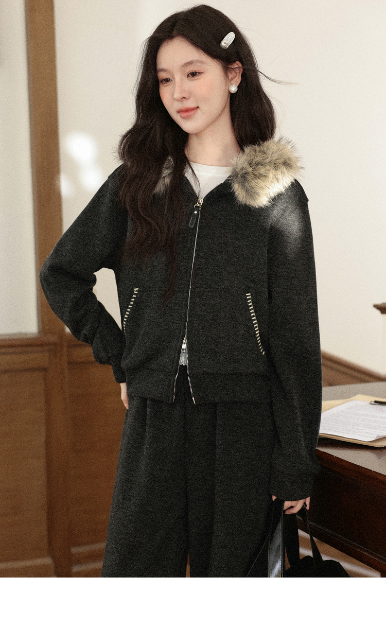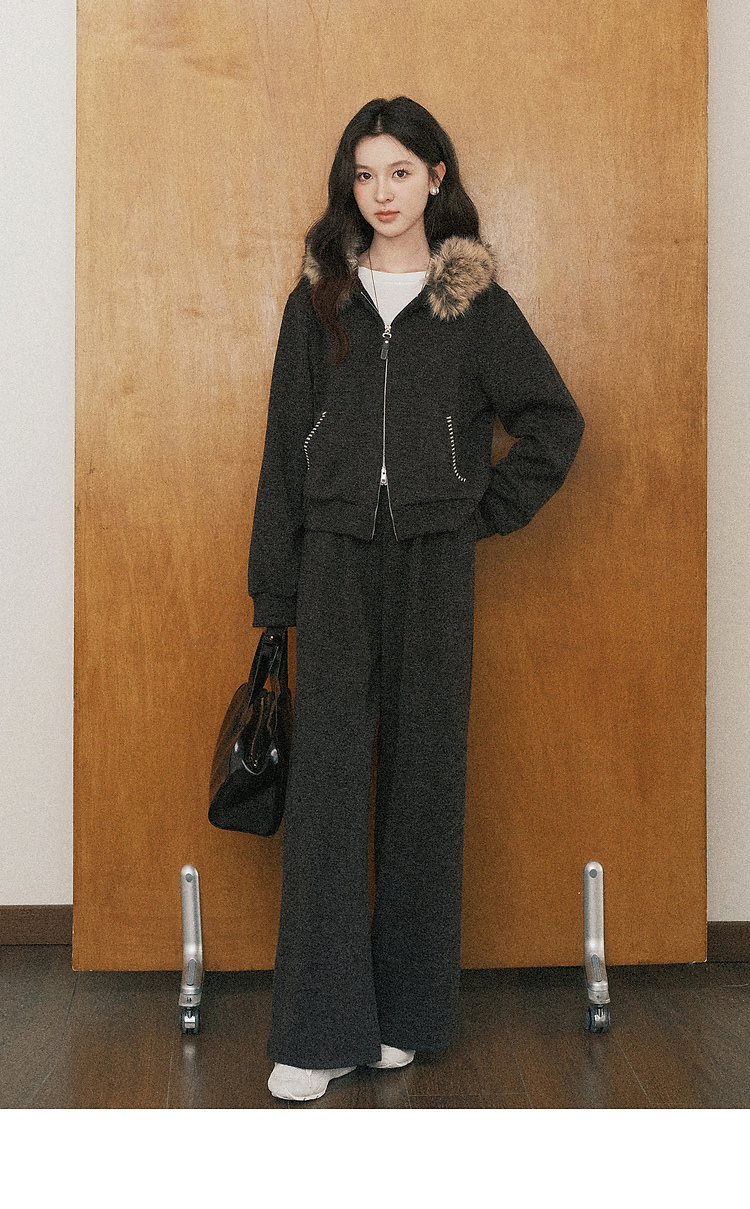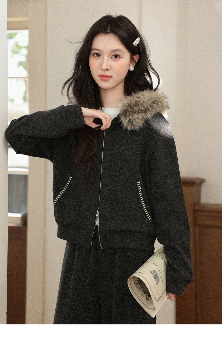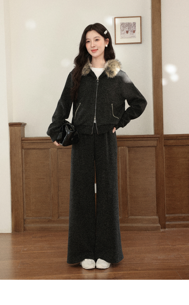 鹿向南「奶霜漩涡」深灰色短外套休闲裤套装女2025秋冬显瘦两件套