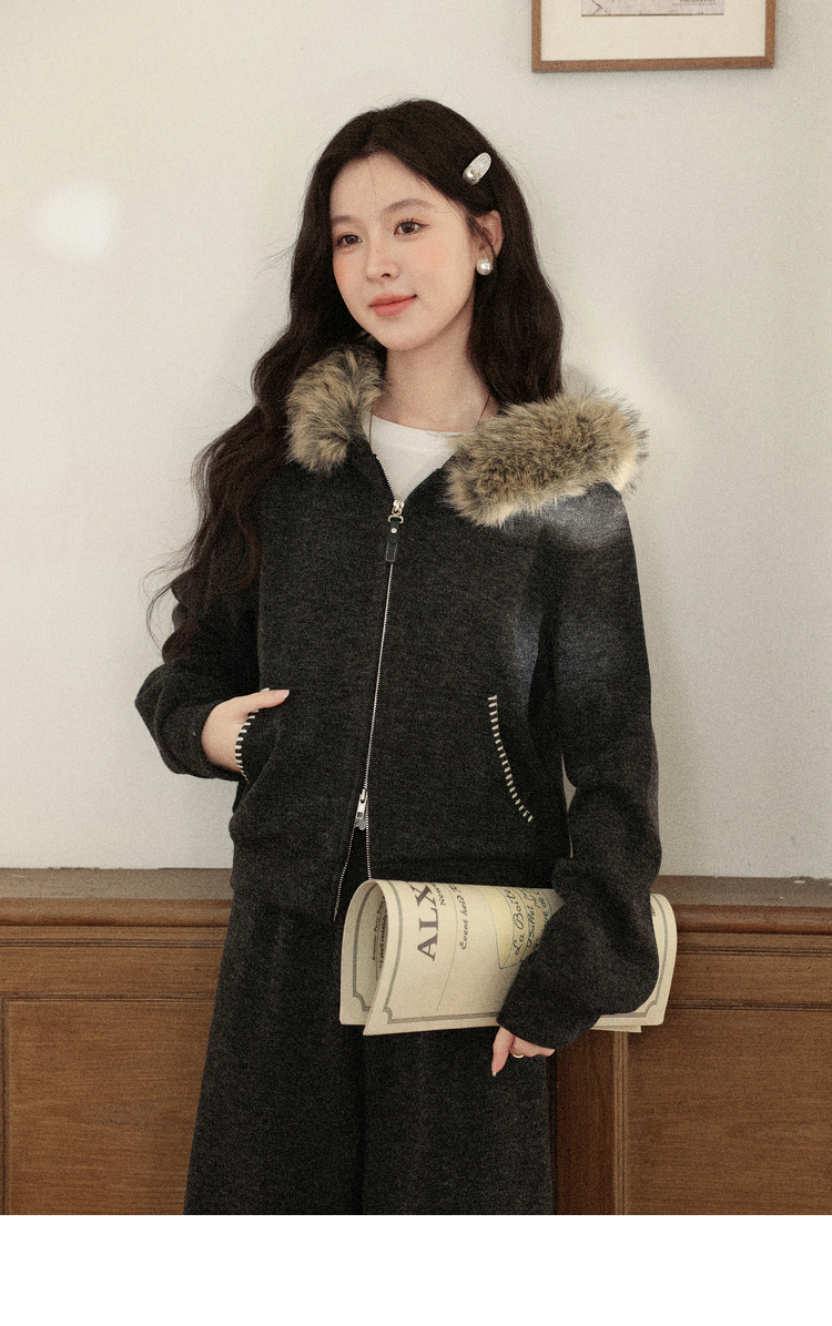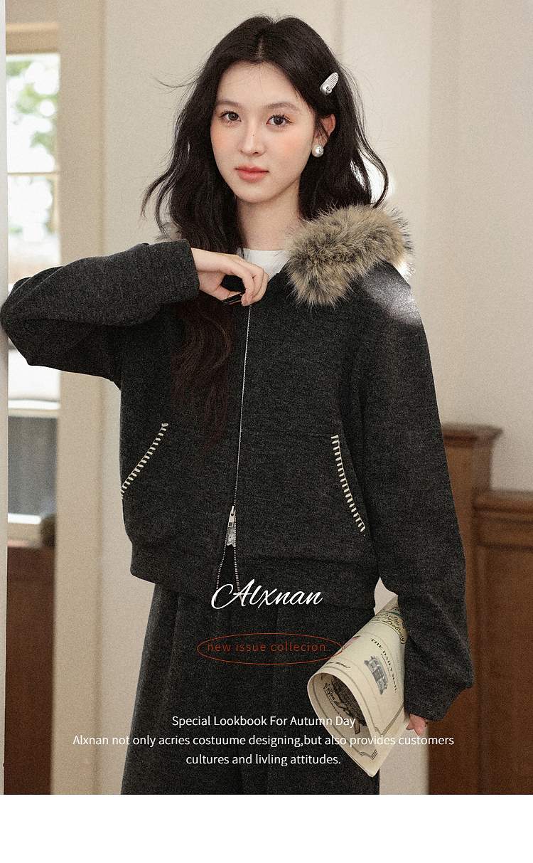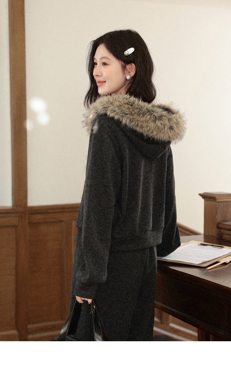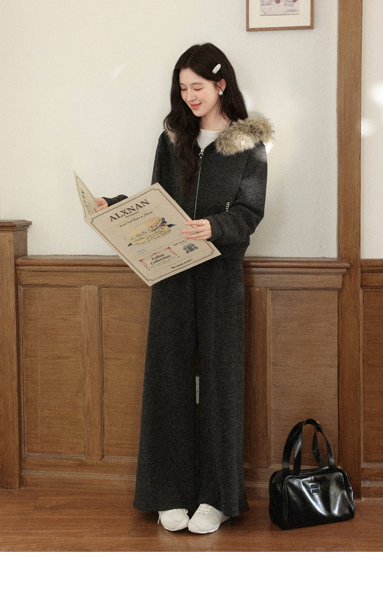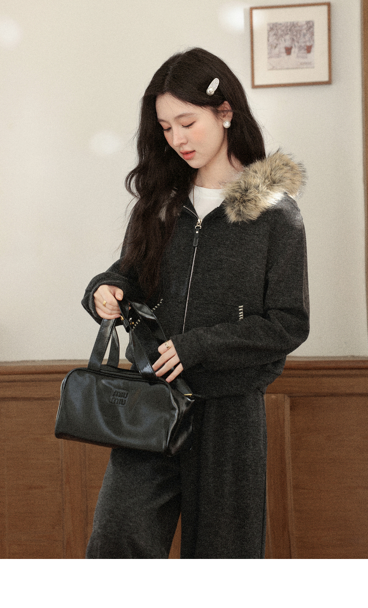 鹿向南「奶霜漩涡」深灰色短外套休闲裤套装女2025秋冬显瘦两件套