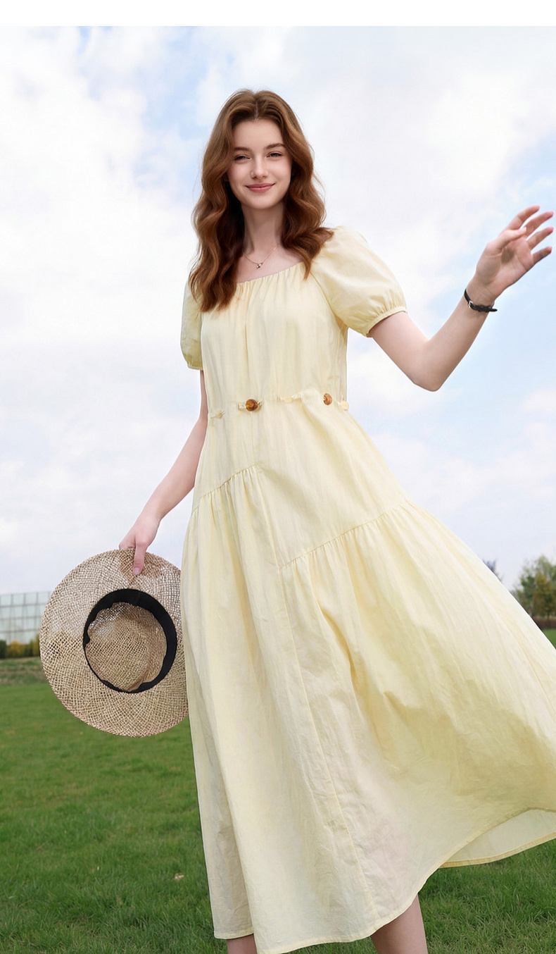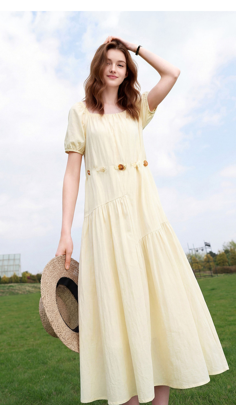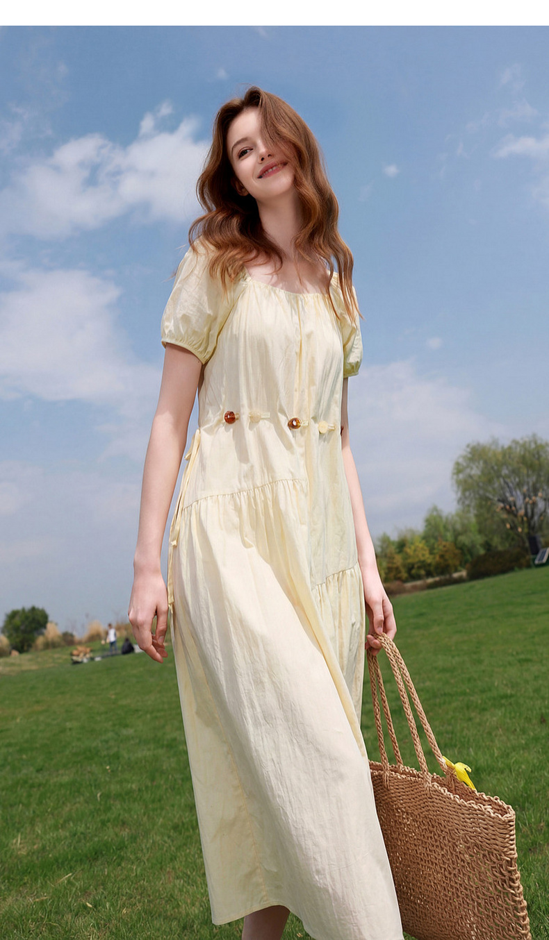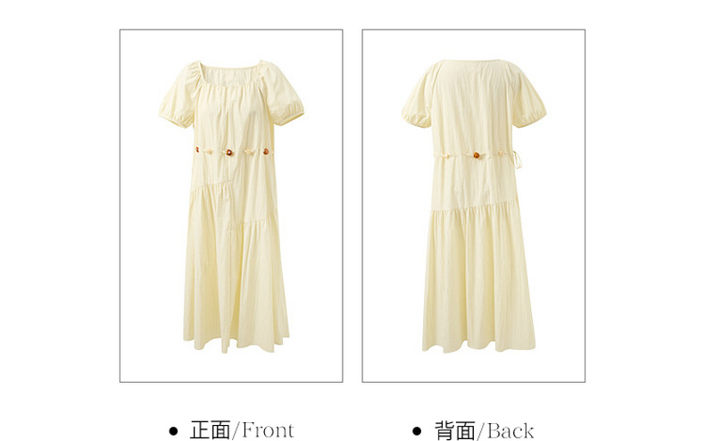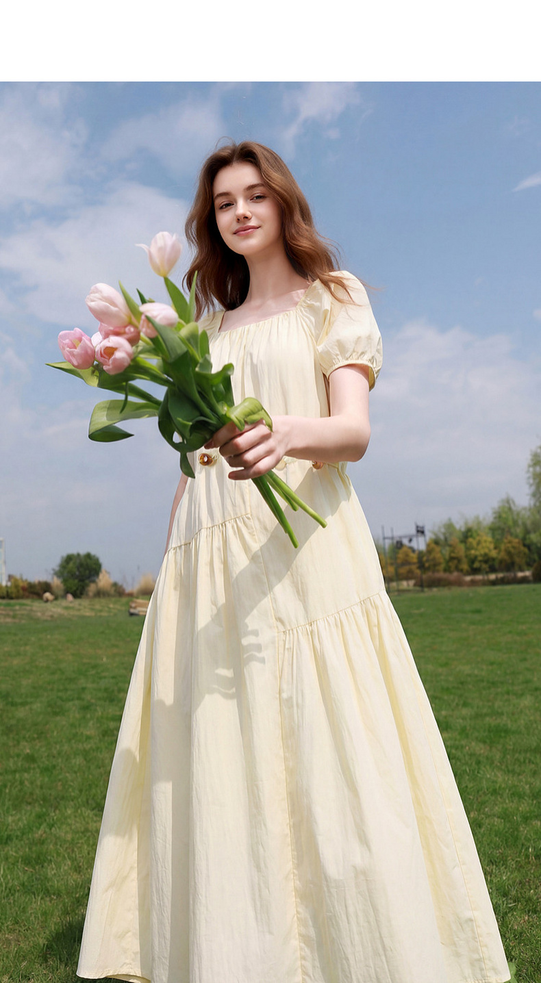 三彩2026夏季新款方领连衣裙短袖A字裙宽松大摆长裙度假M