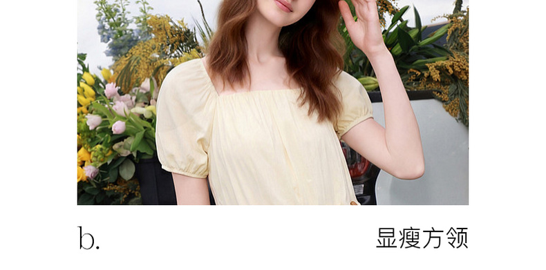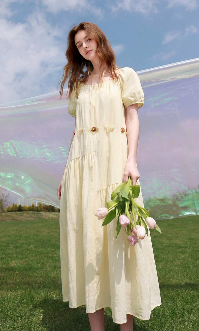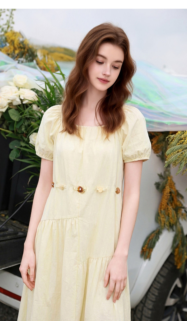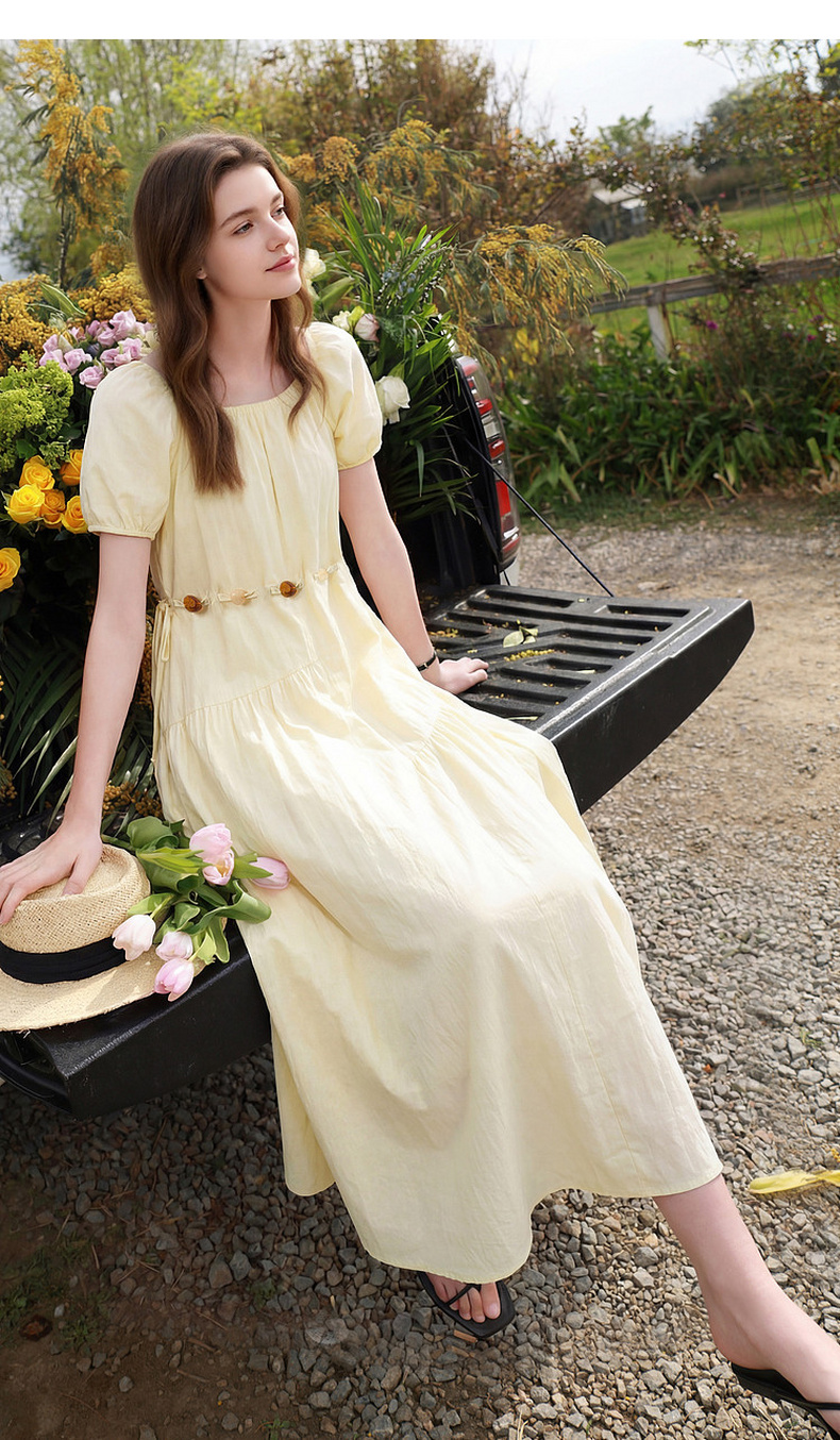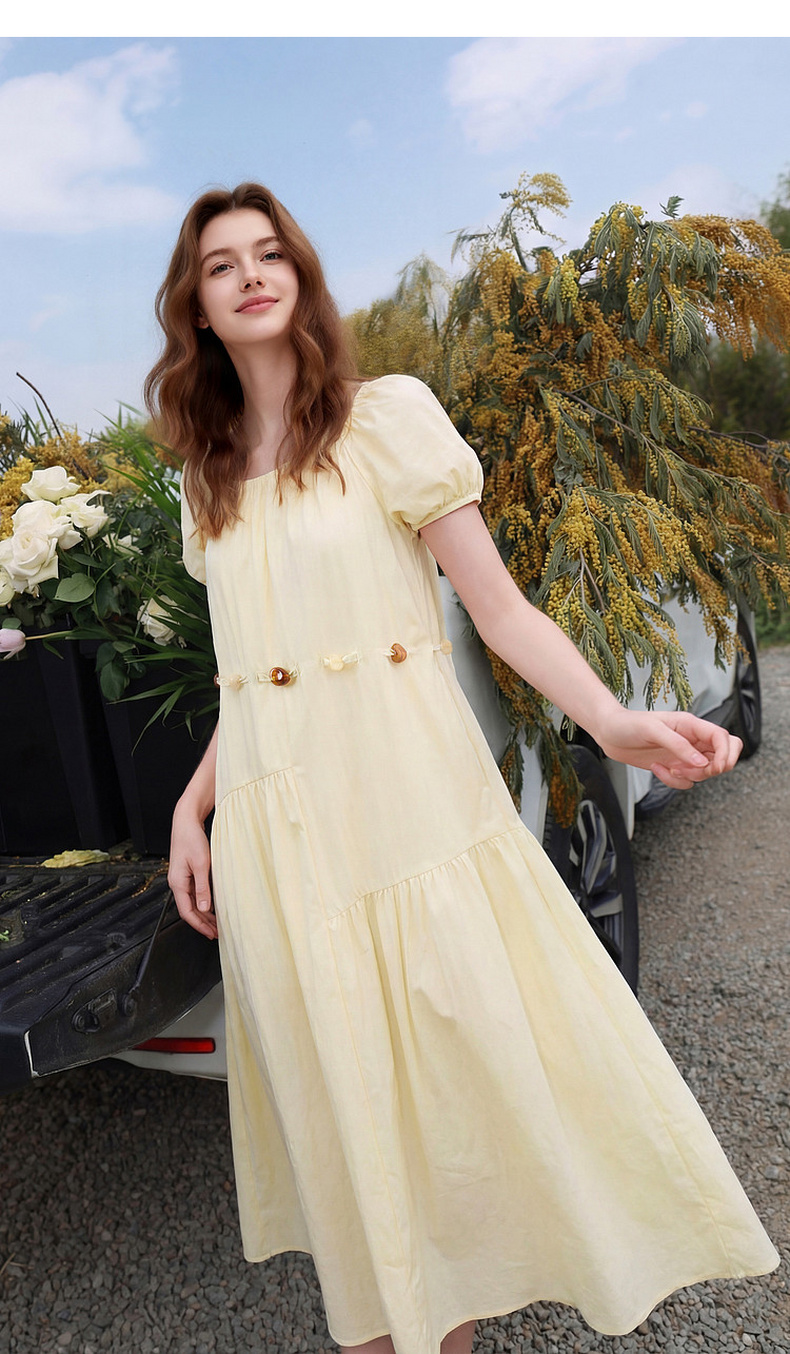 三彩2026夏季新款方领连衣裙短袖A字裙宽松大摆长裙度假M