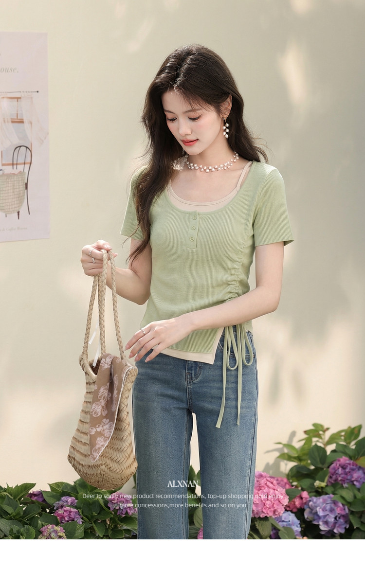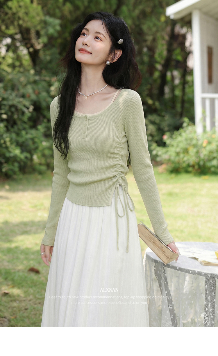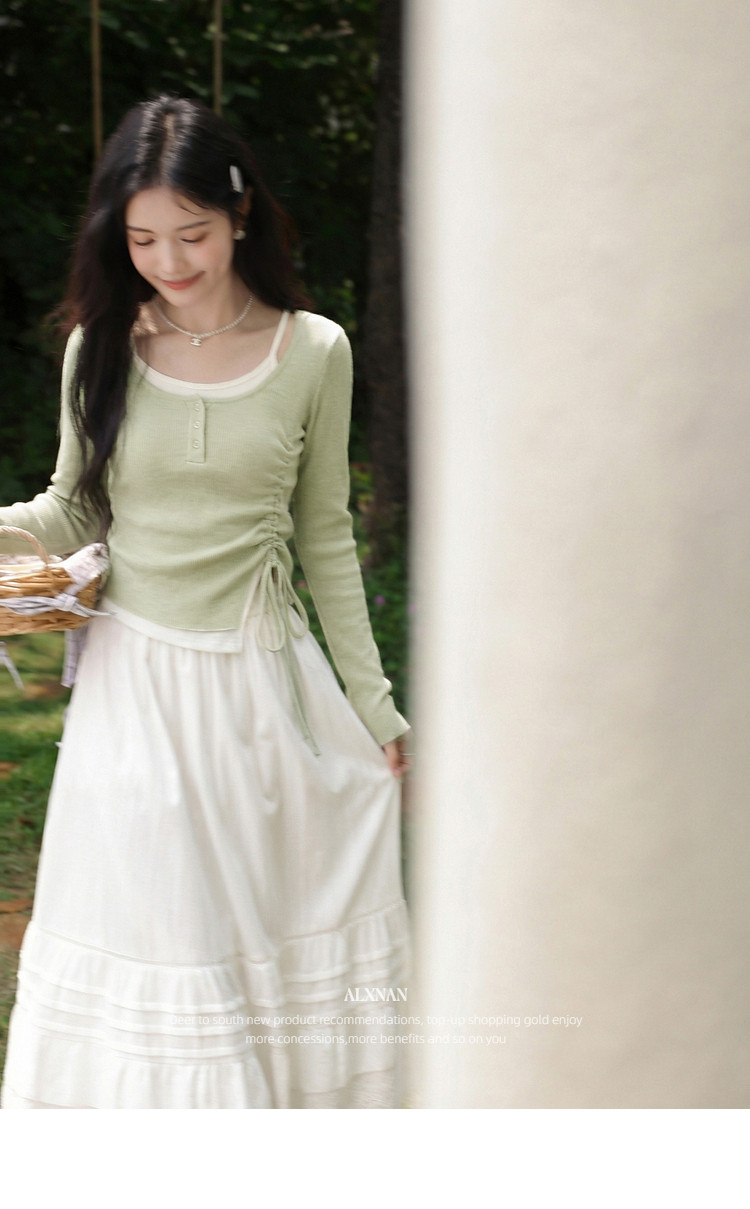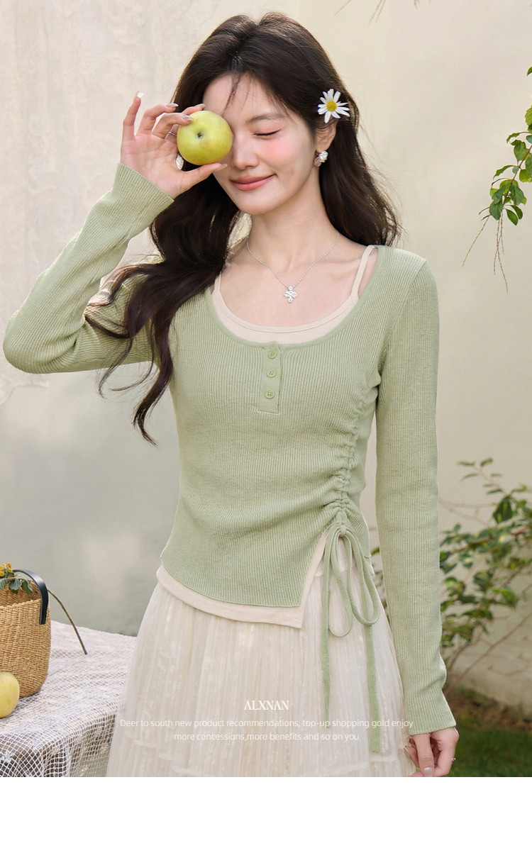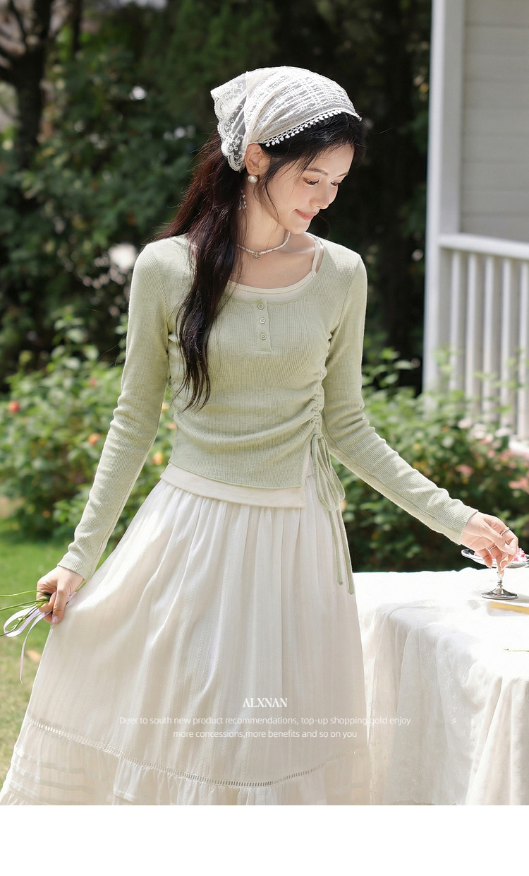 鹿向南「绿野信笺」假两件绿色长袖t恤女夏季巨好看修身打底上衣
