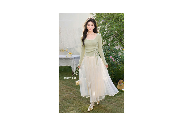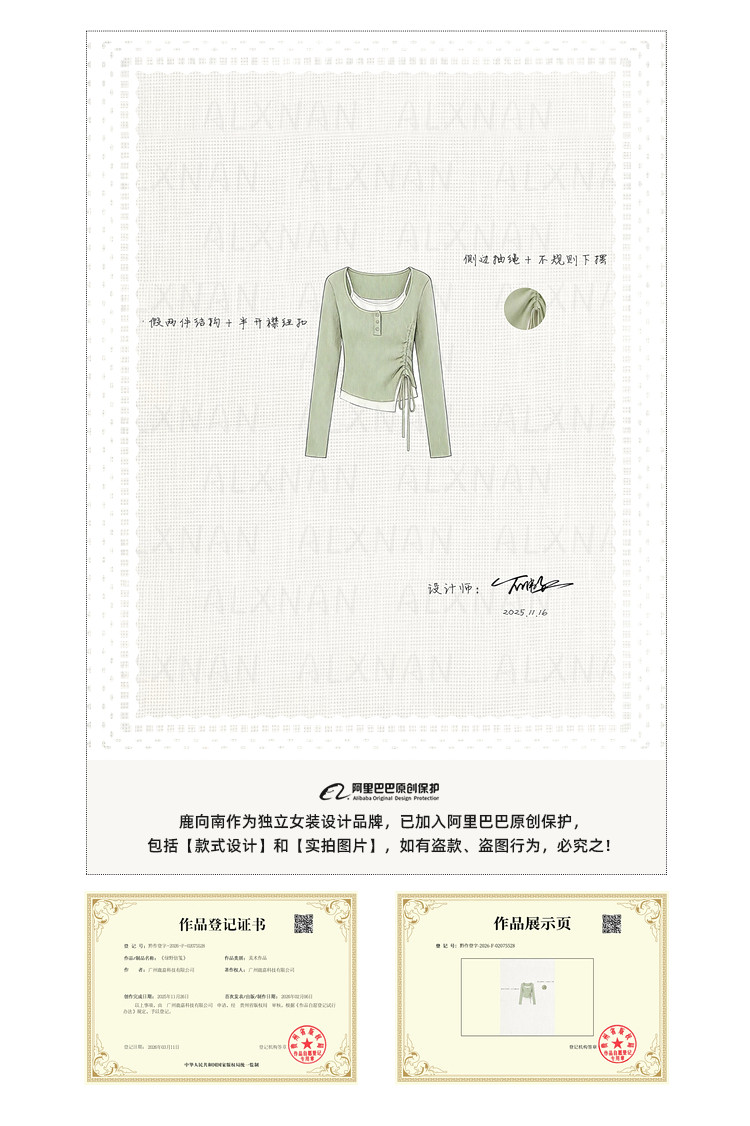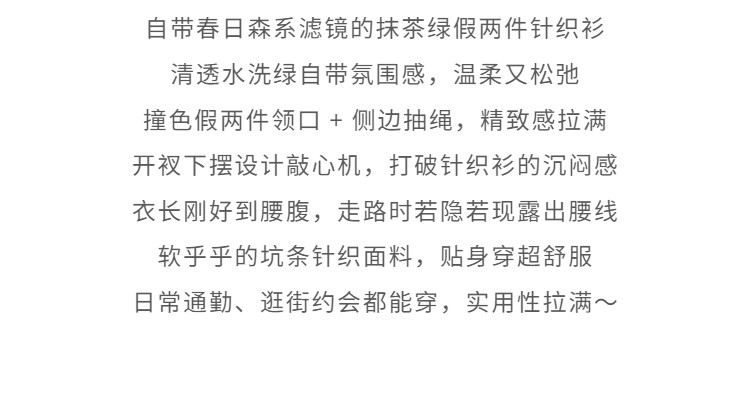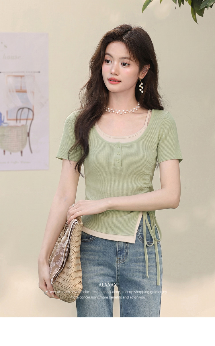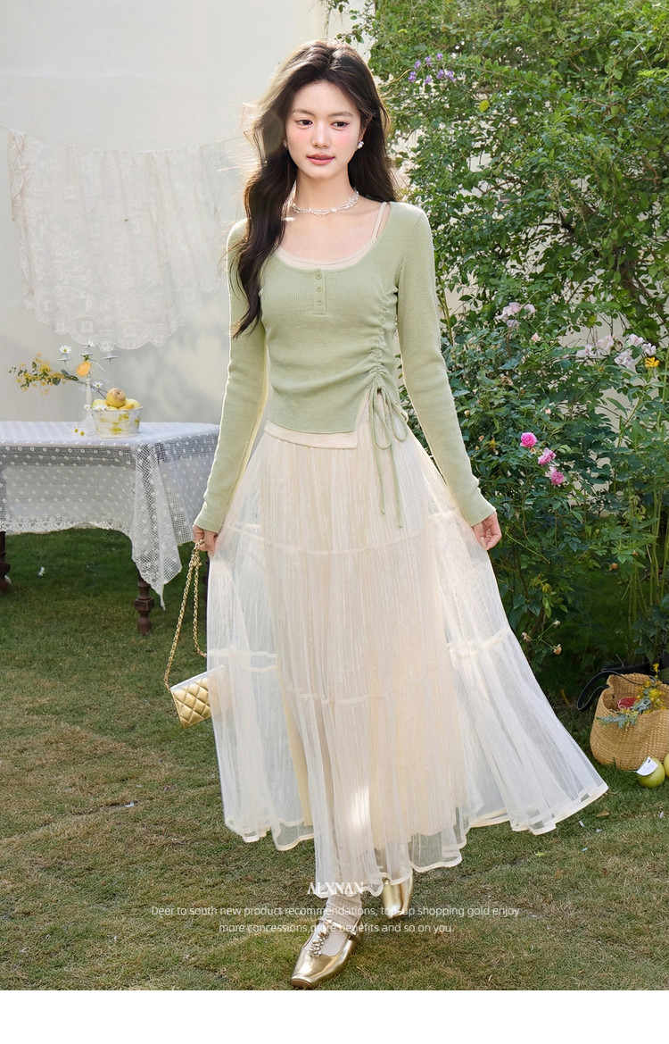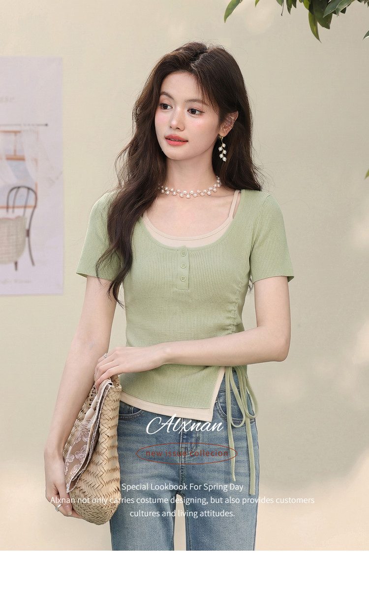 鹿向南「绿野信笺」假两件绿色长袖t恤女夏季巨好看修身打底上衣