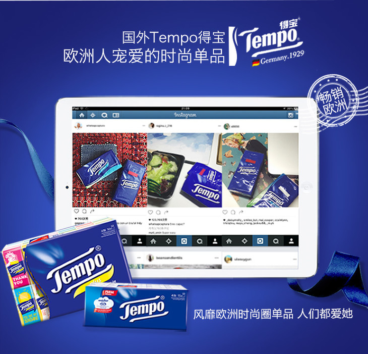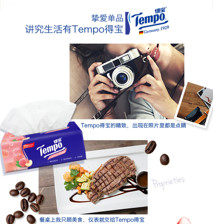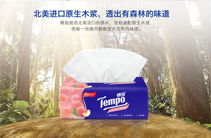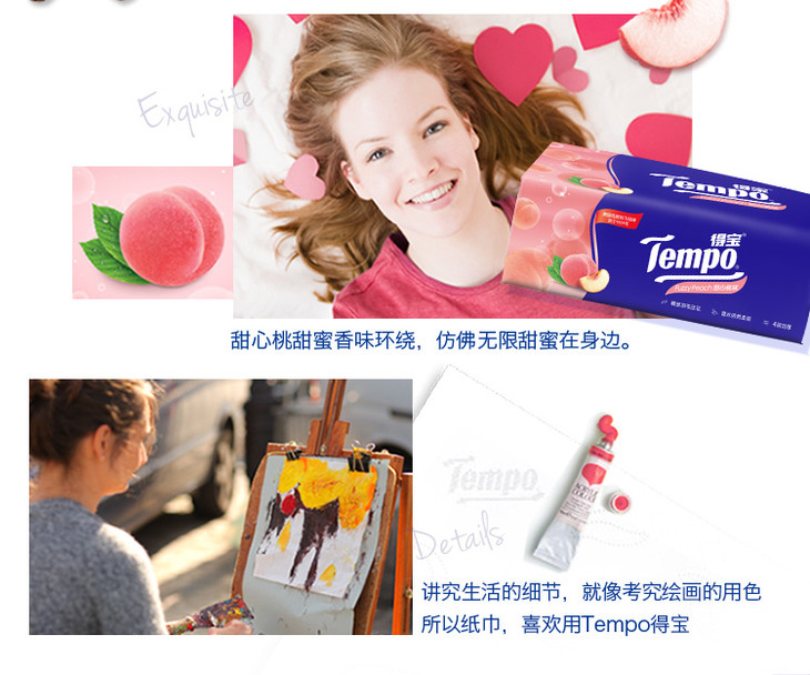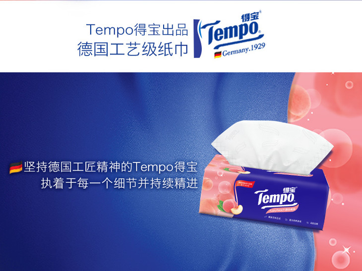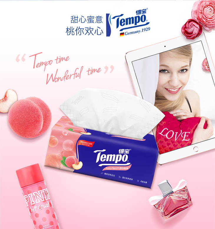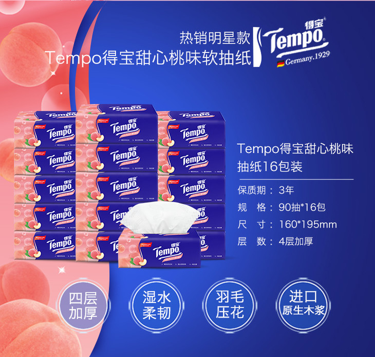 Tempo源自德国1929 甜心桃味抽纸 加厚4层90抽 面巾纸*16包 纸巾 桃子味 抽纸 德宝 得宝