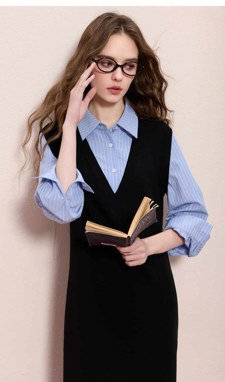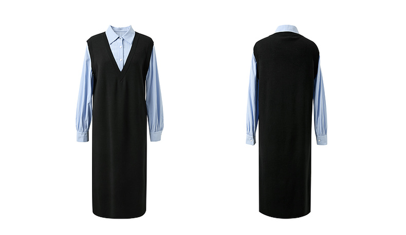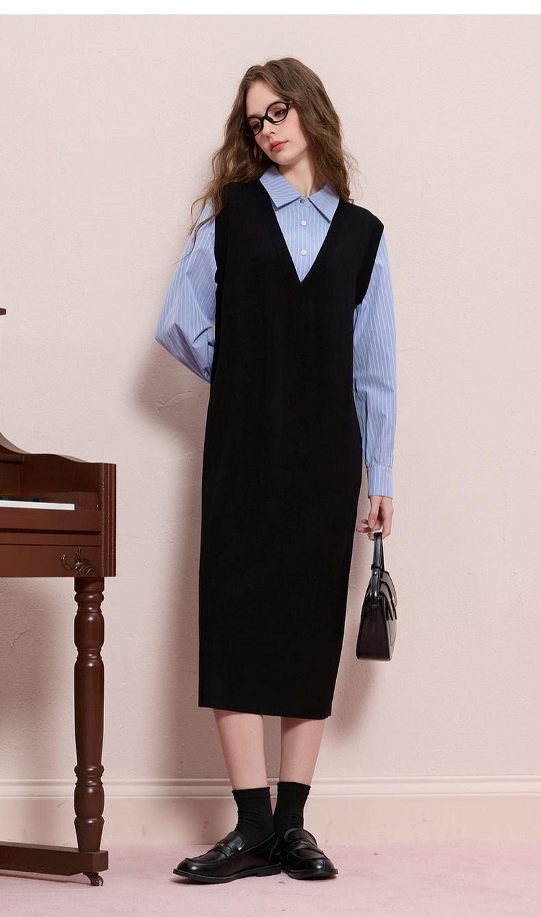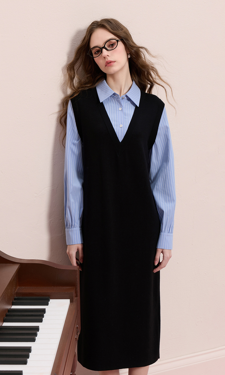 三彩2025冬季新款假两件连衣裙拼接宽松直筒裙长裙休闲M