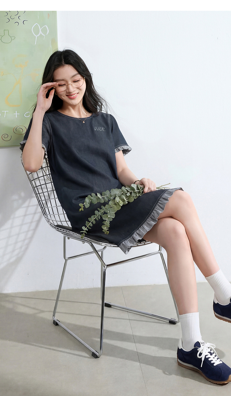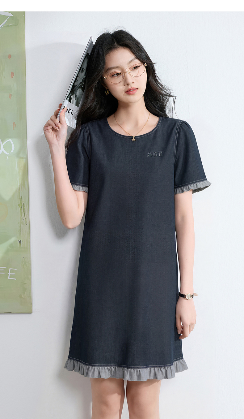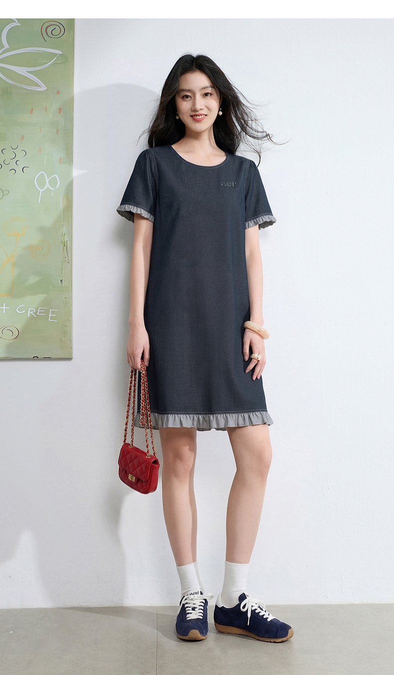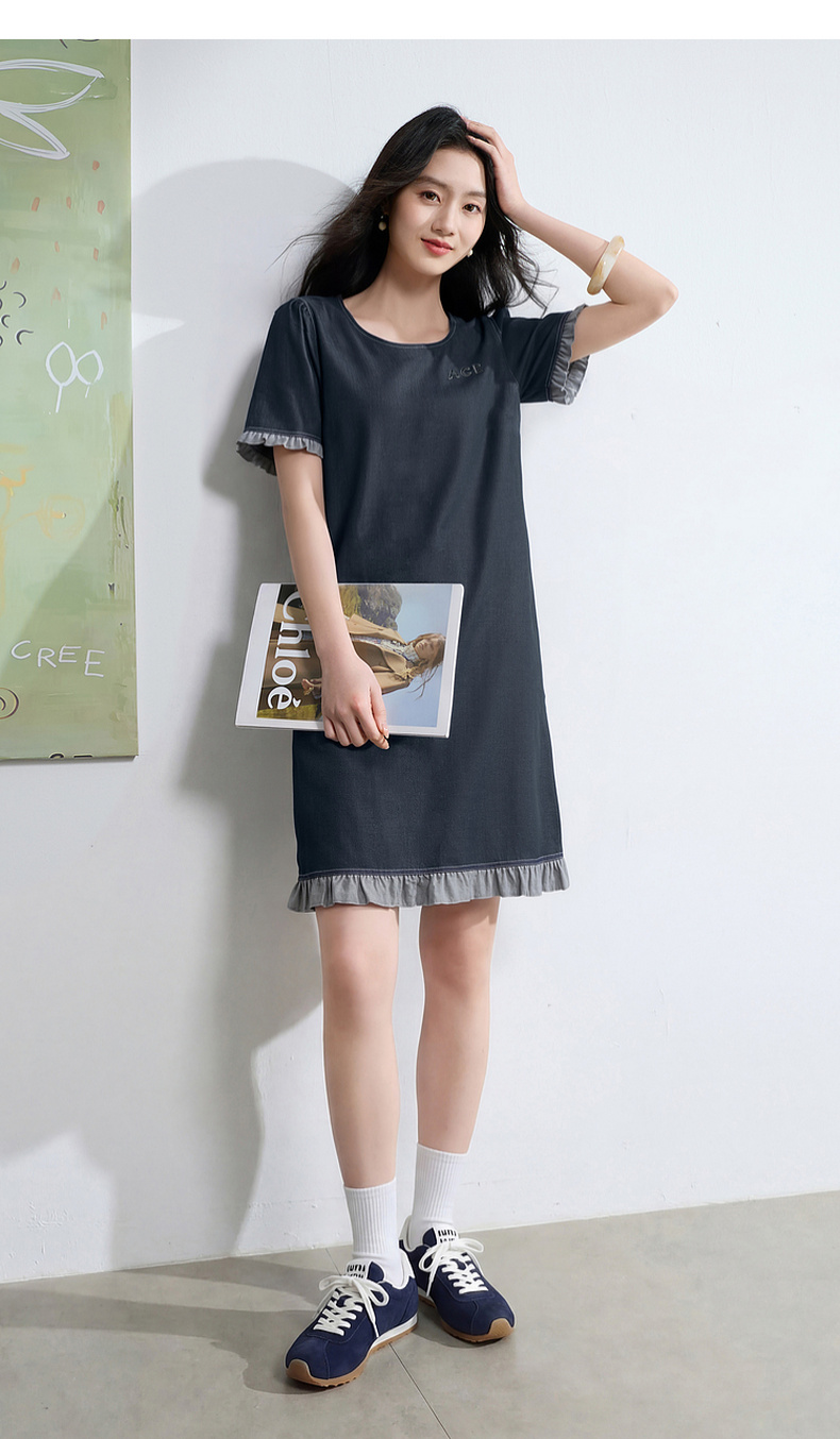 三彩2026夏季新款休闲连衣裙宽松圆领短袖木耳边直筒裙短裙S