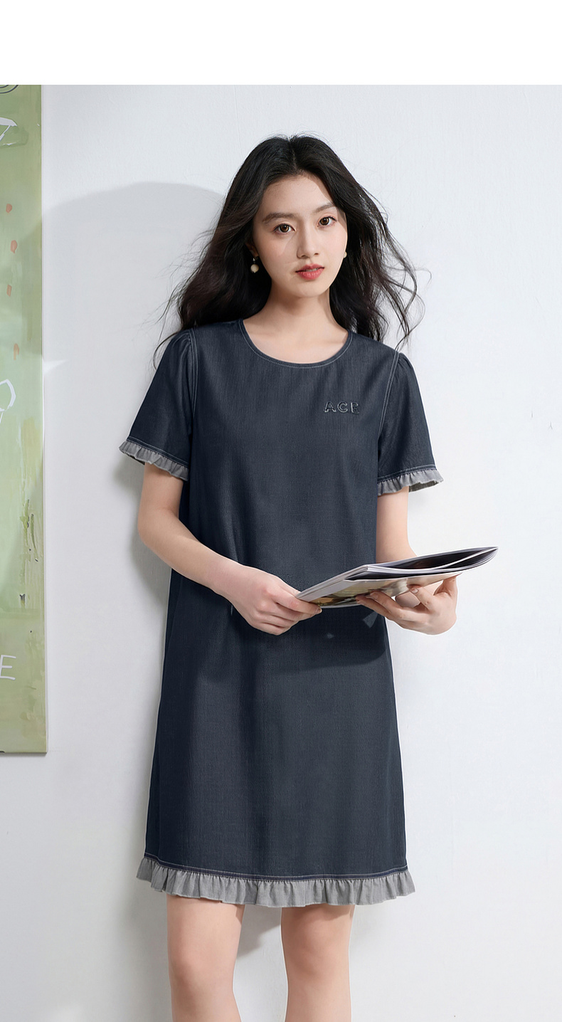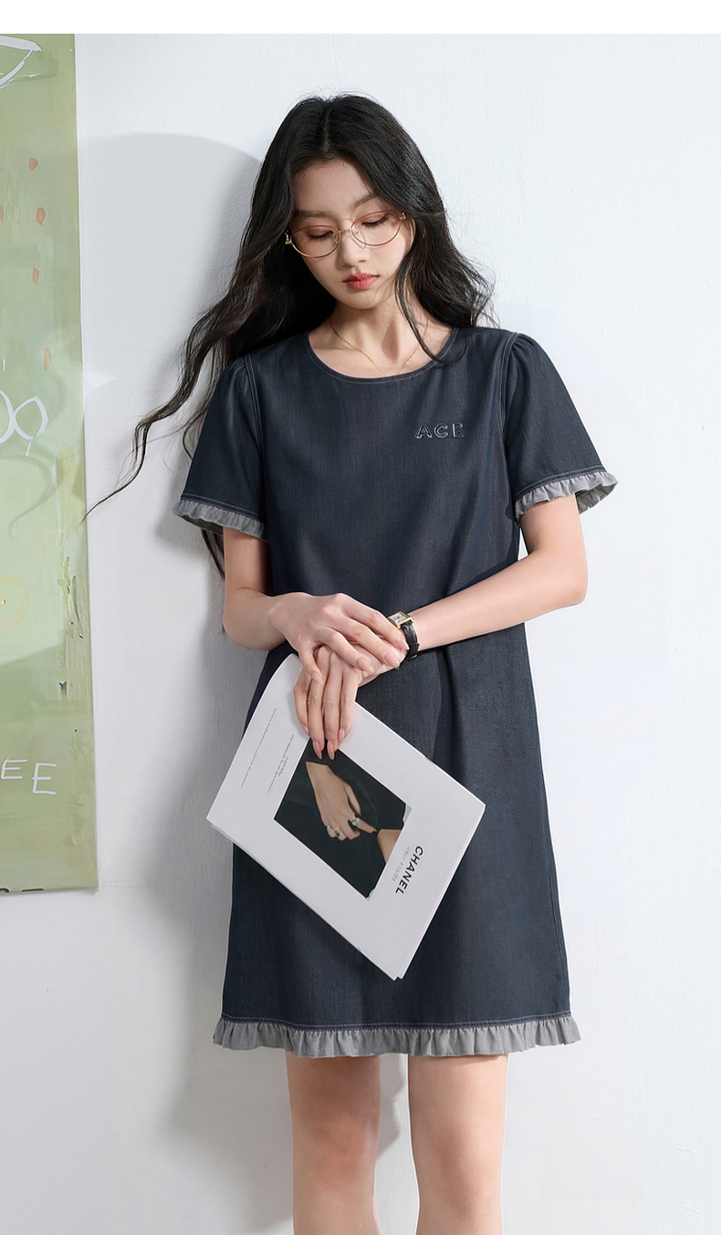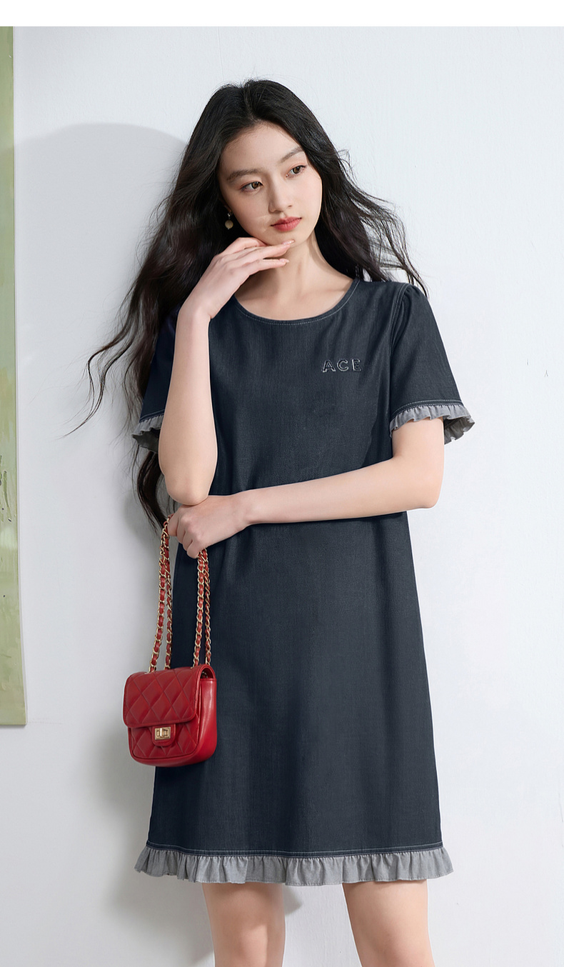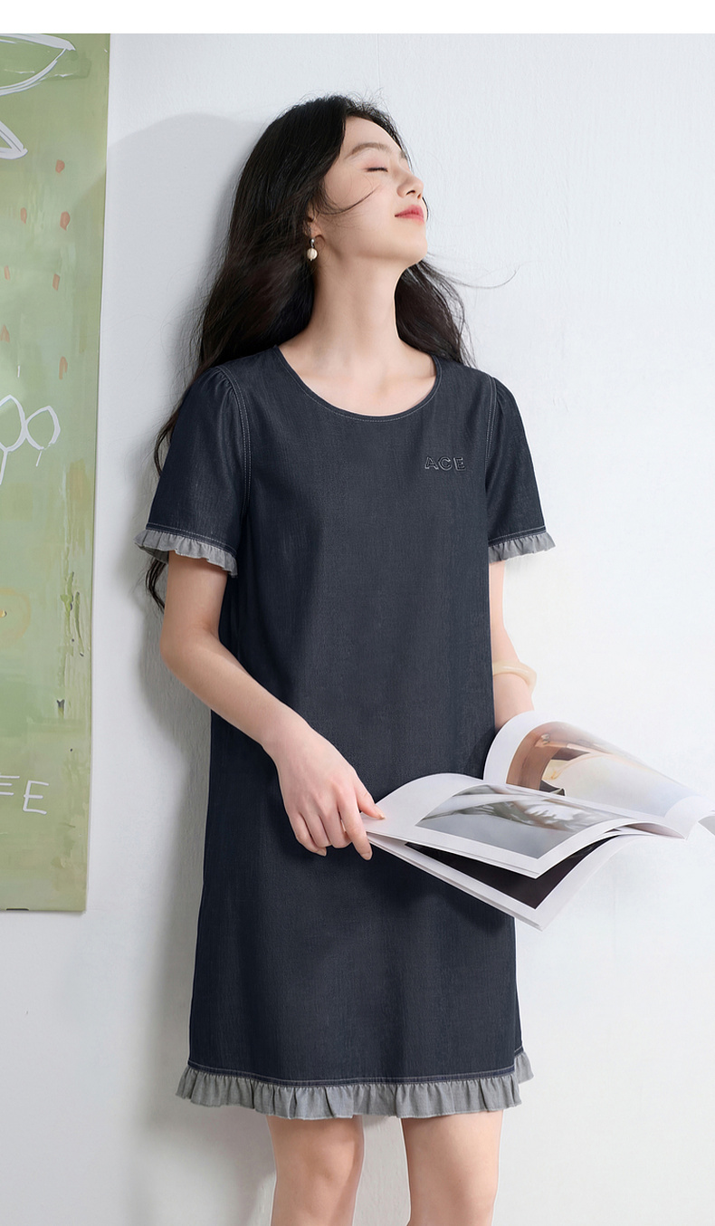 三彩2026夏季新款休闲连衣裙宽松圆领短袖木耳边直筒裙短裙S