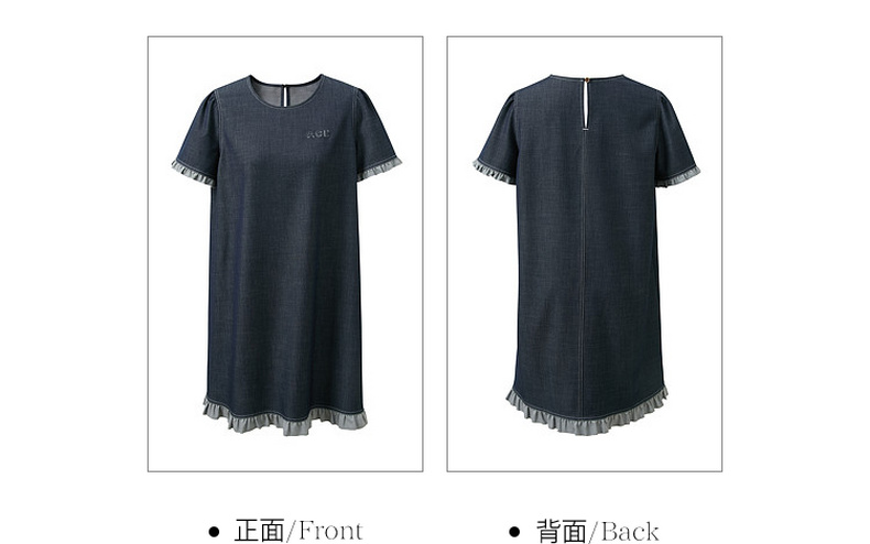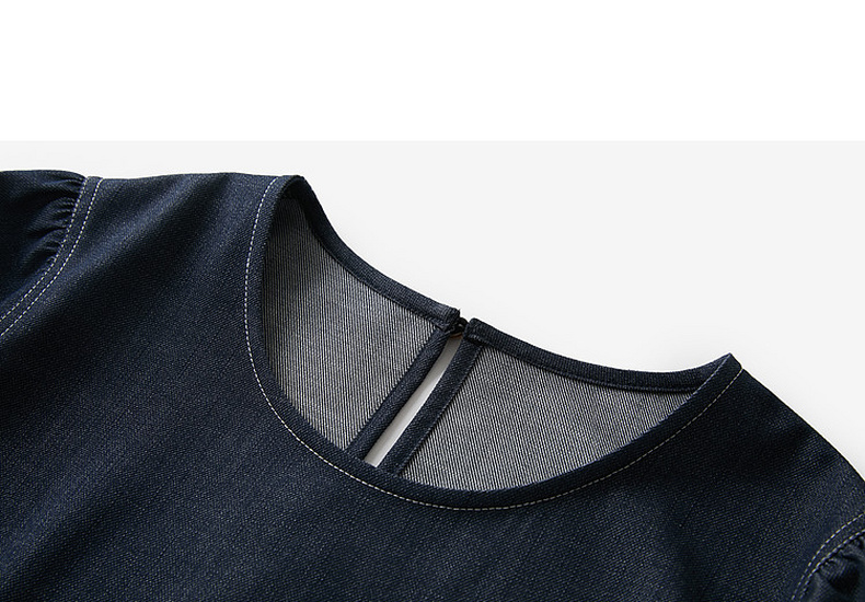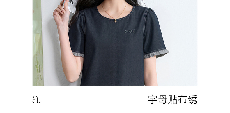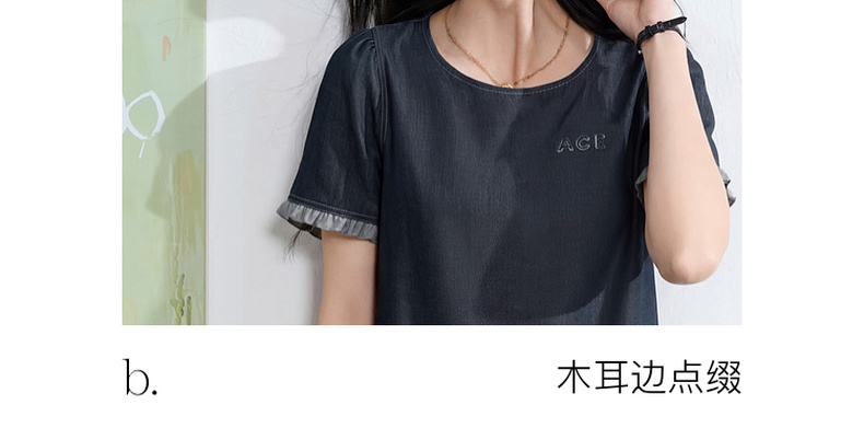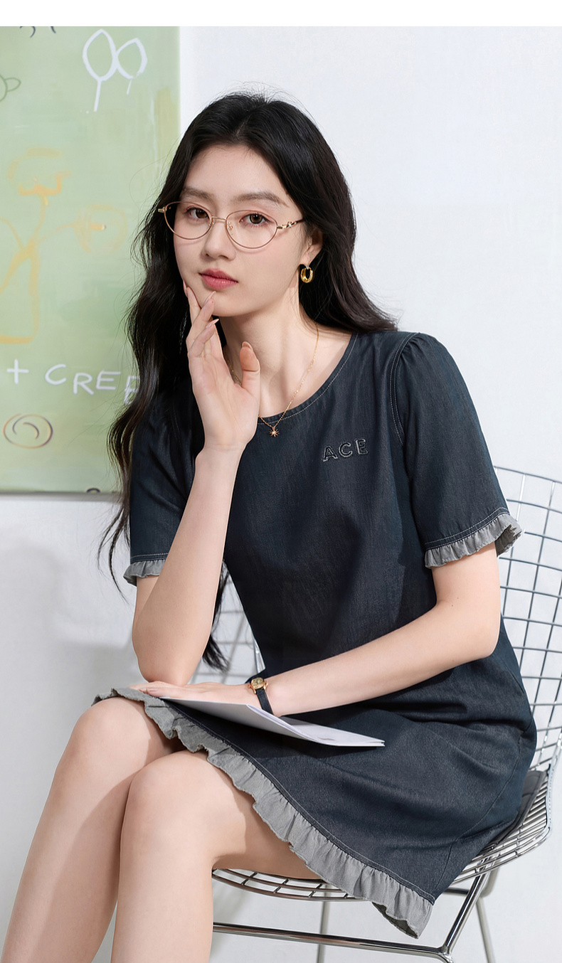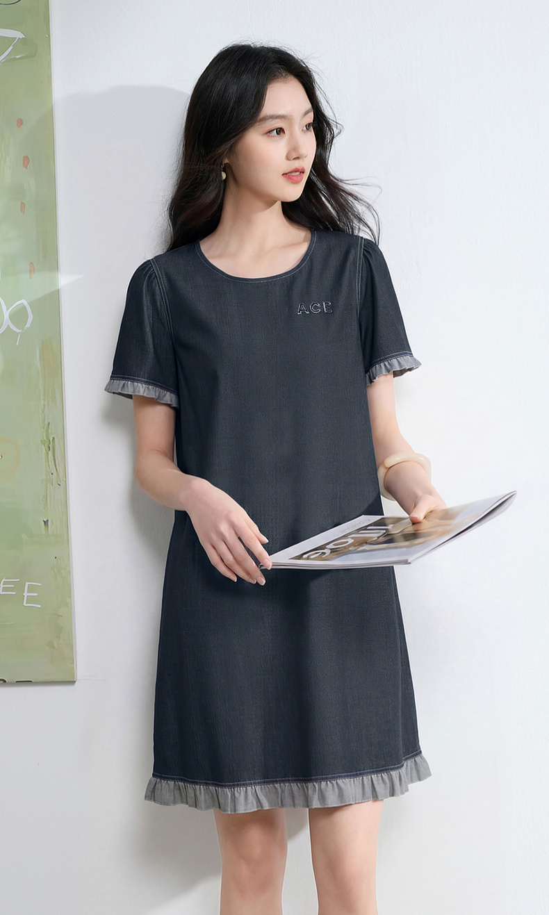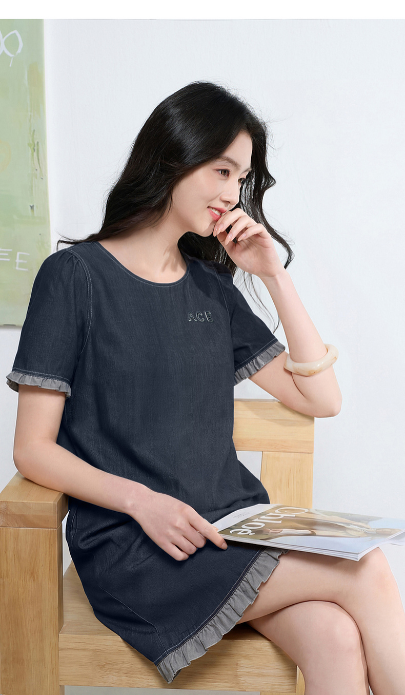 三彩2026夏季新款休闲连衣裙宽松圆领短袖木耳边直筒裙短裙S