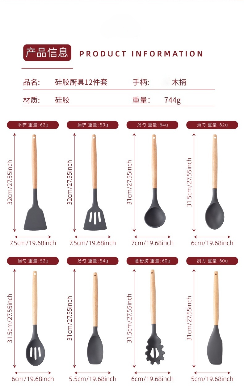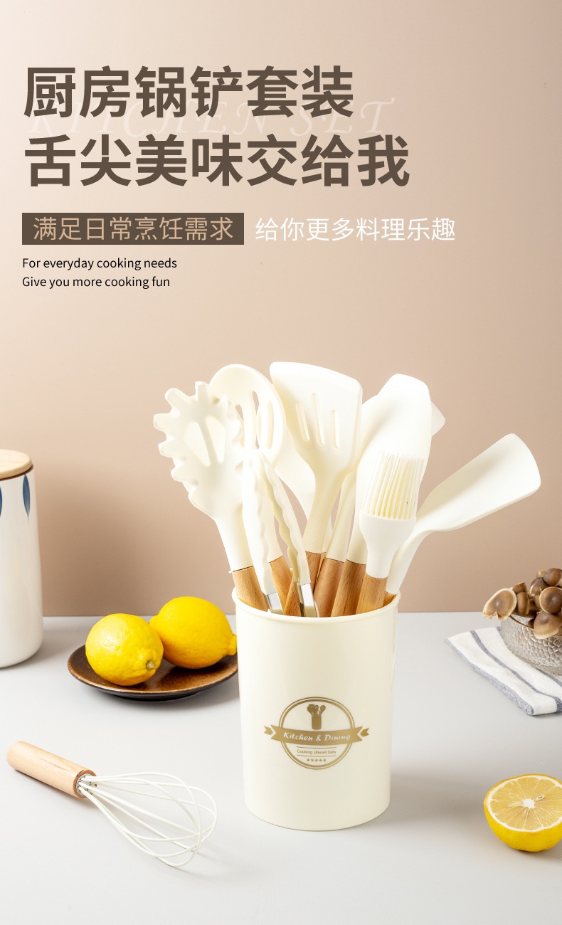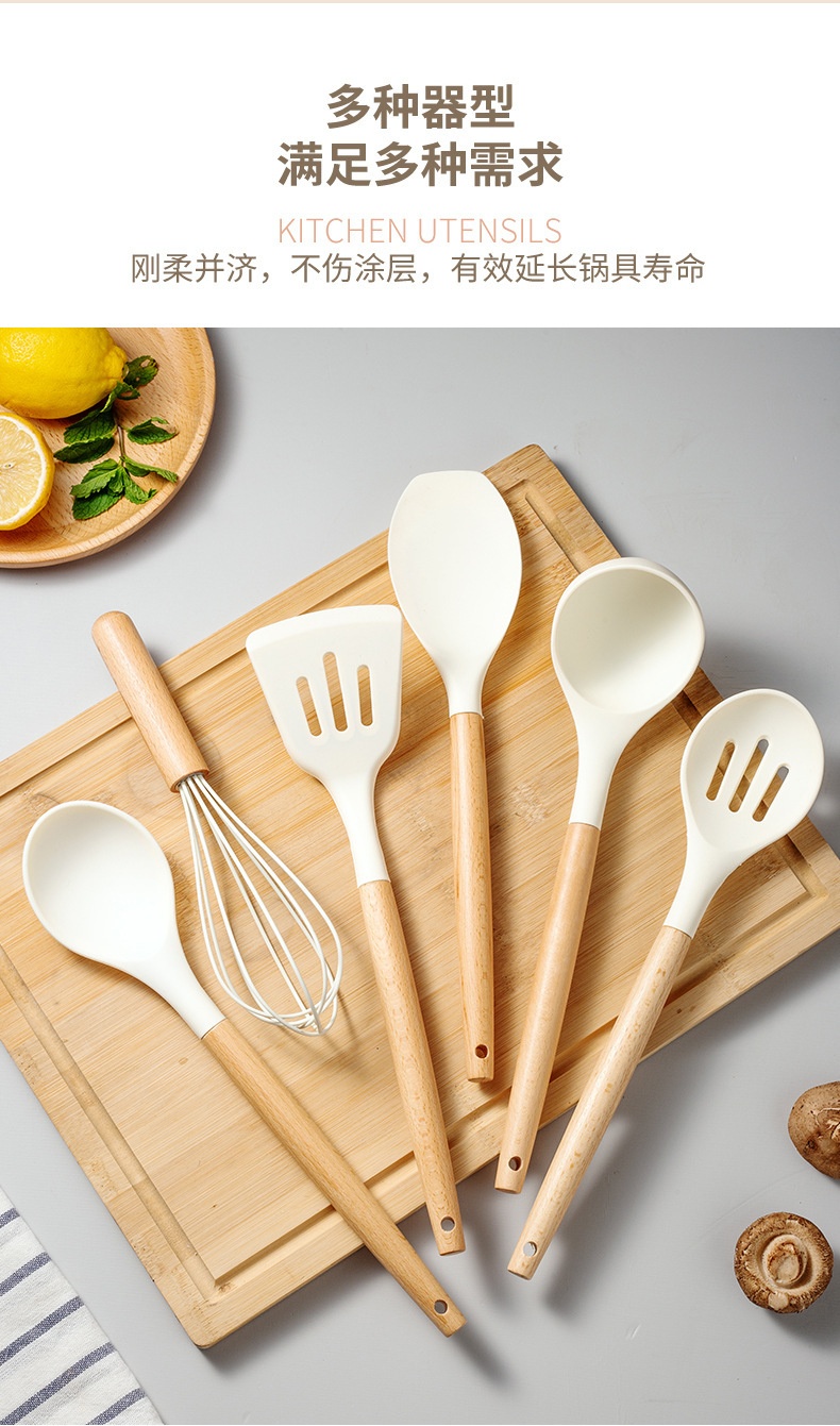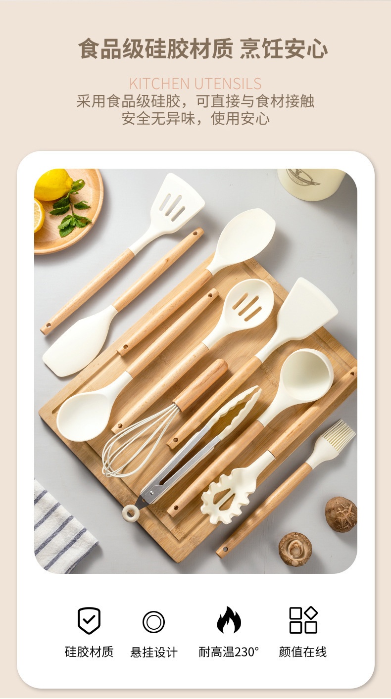 硅胶木柄厨具12件套装 烹饪不粘锅铲汤勺漏勺漏铲 耐高温