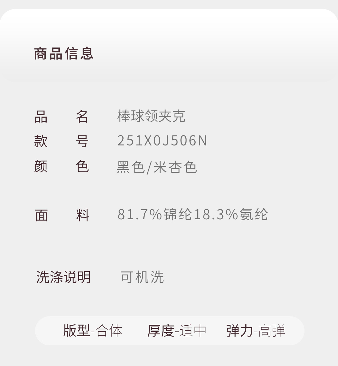 【风尚二号】皮肤衣高弹耐磨棒球领出行夹克外套251X0J506N