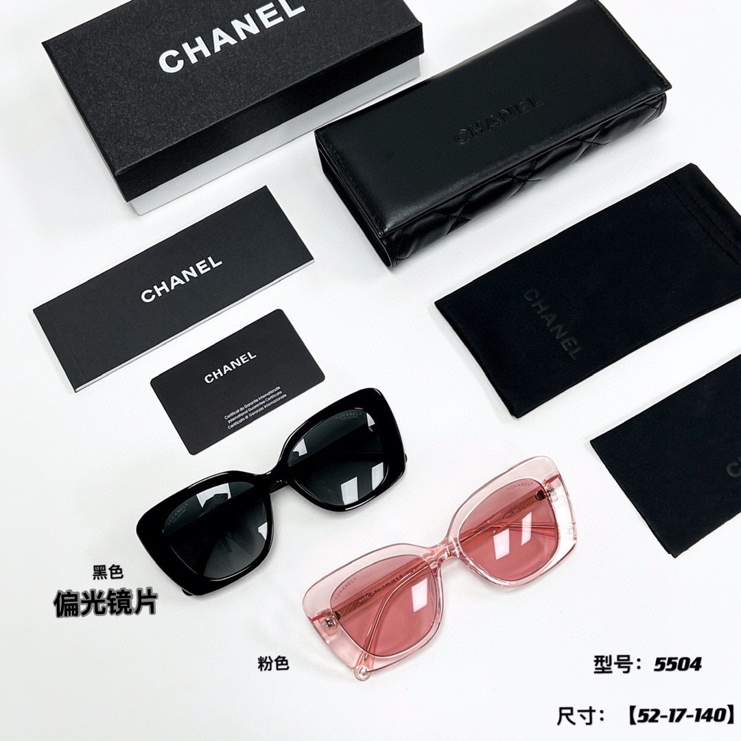 香奈儿最新款太阳眼镜🕶️发售 配全套包装❗️CE+UKCA认证❗️带防伪序列号❗️ 领先官方 独家渠道货源❗️市面上没有的款式,目测接下来会成为爆款🔥绝对不会撞款,朋友圈第一个拥有的人必须是你☑️黑色经典百搭男女同款,粉色自带腮红滤镜 少女心十足! 型号:5504 尺寸:【52-17-140】 采用蝴蝶型方型镜框,轮廓清晰饱满 个性时尚;醋酸纤维材质 金属板材镜腿 镜脚双C标志 ,镜腿侧面经典logo标志,时尚潮流!
