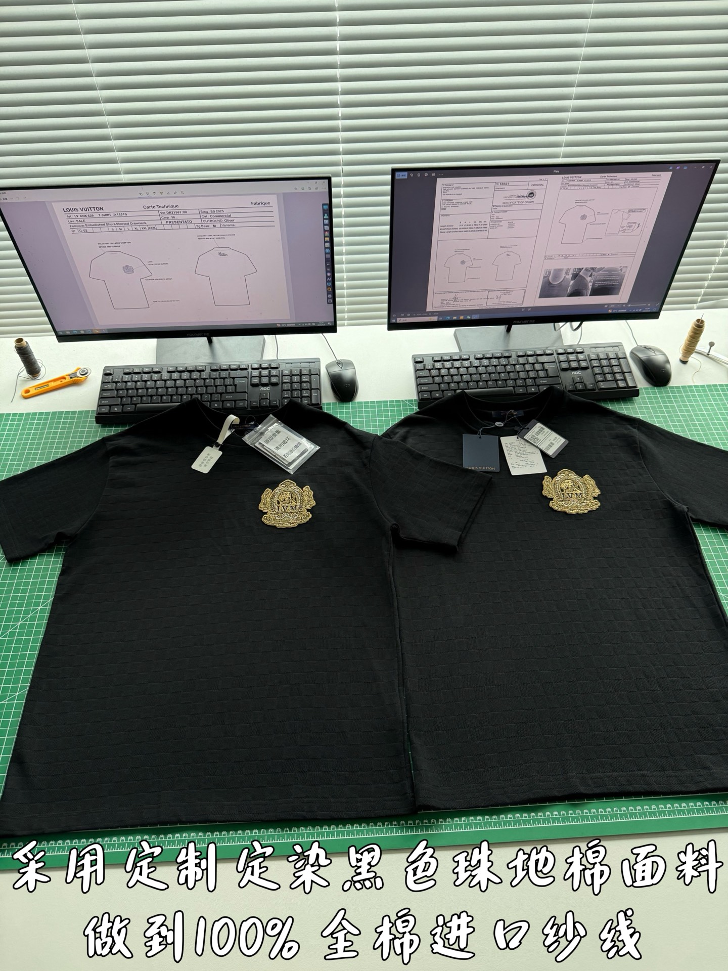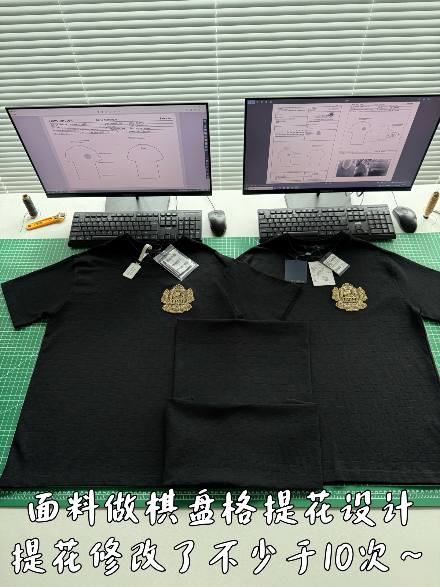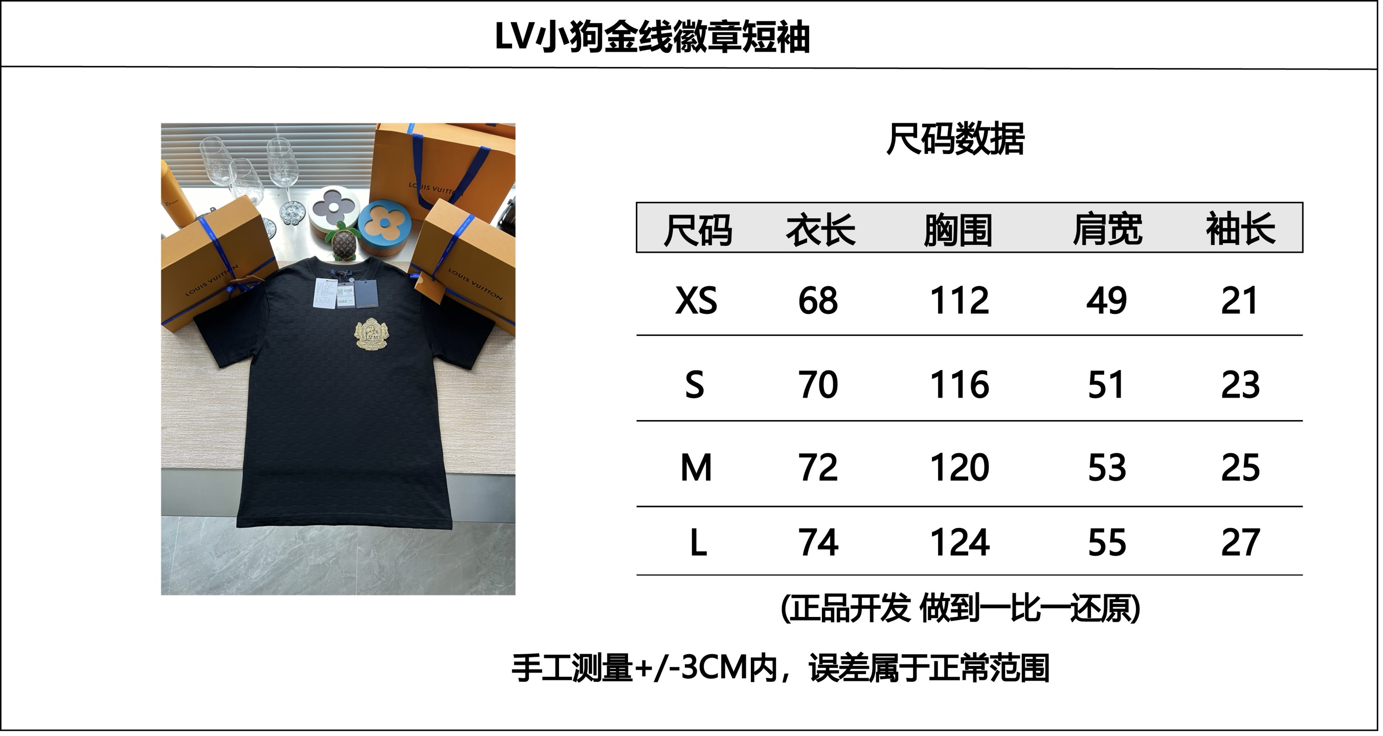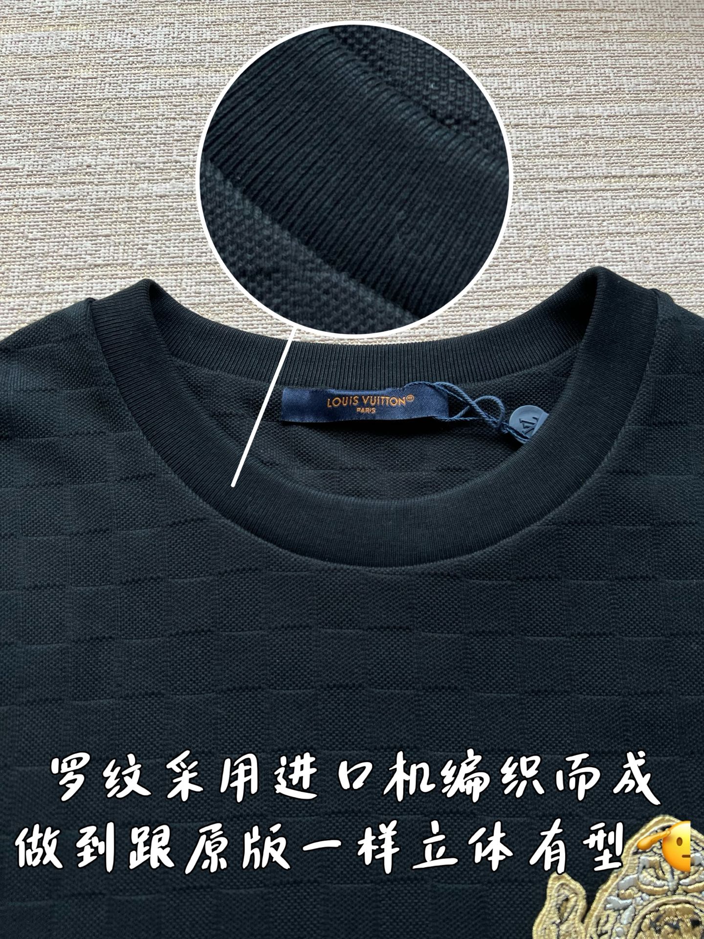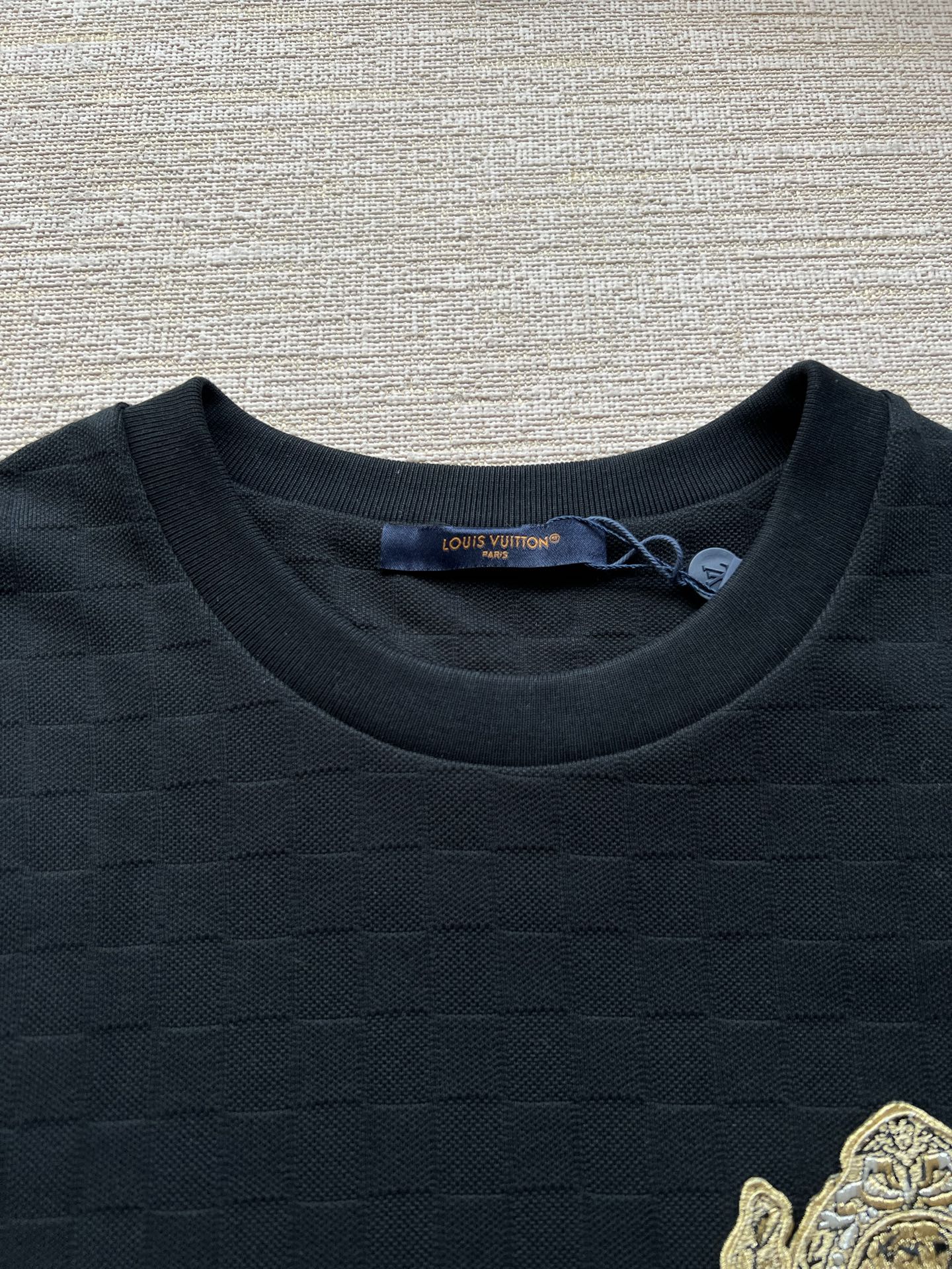 Louis Vuitton25ss小狗金线徽章短袖T恤‼️整件衣服9750购买ZP拆解打造,采用定制黑色珠地棉面料,做到100%全面进口纱线,全幅饰以Damier棋盘格提花珠地设计,胸前点缀LV Dog Blason刺绣提花贴饰,定织标志性罗纹领口,真正做到1:1copy 码数:XS S M L