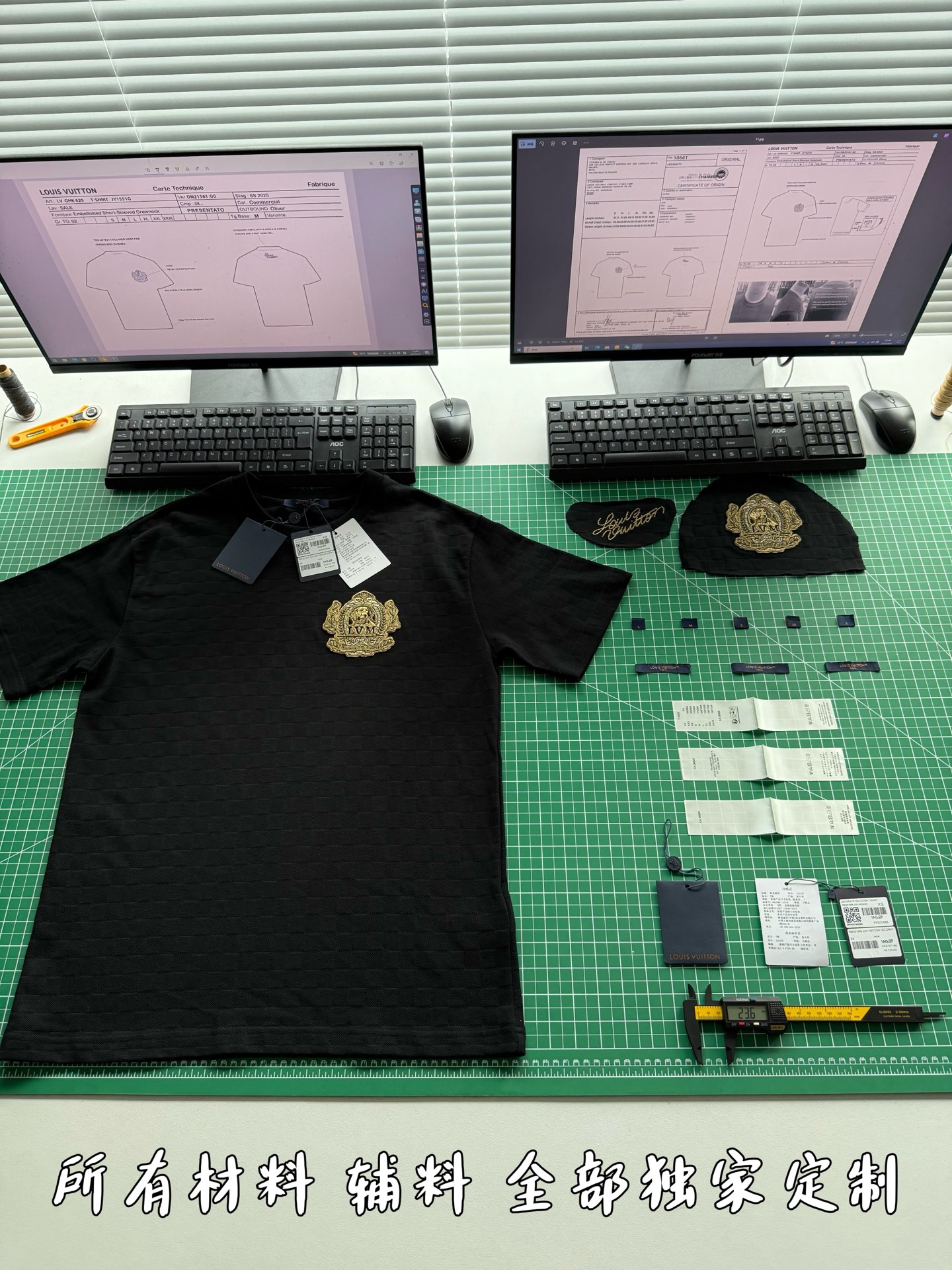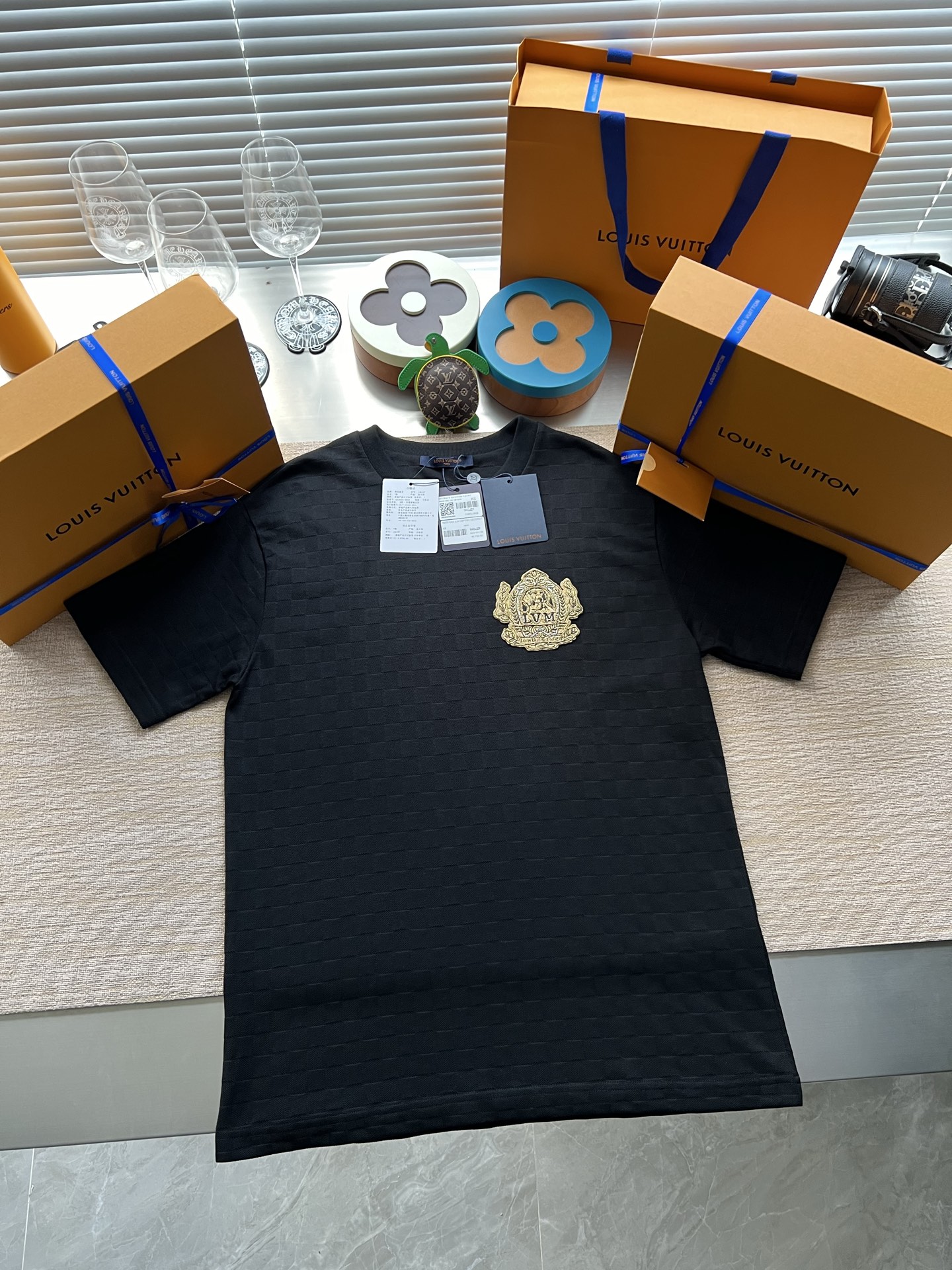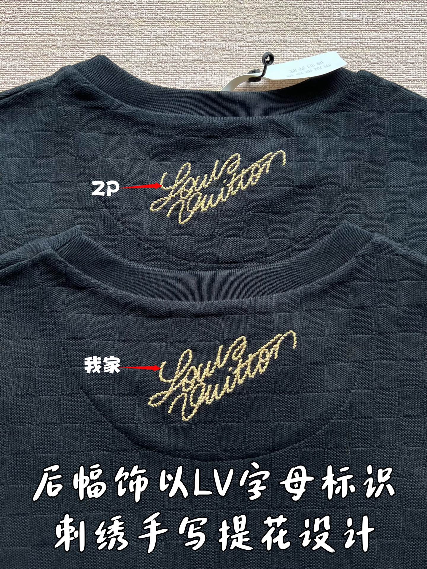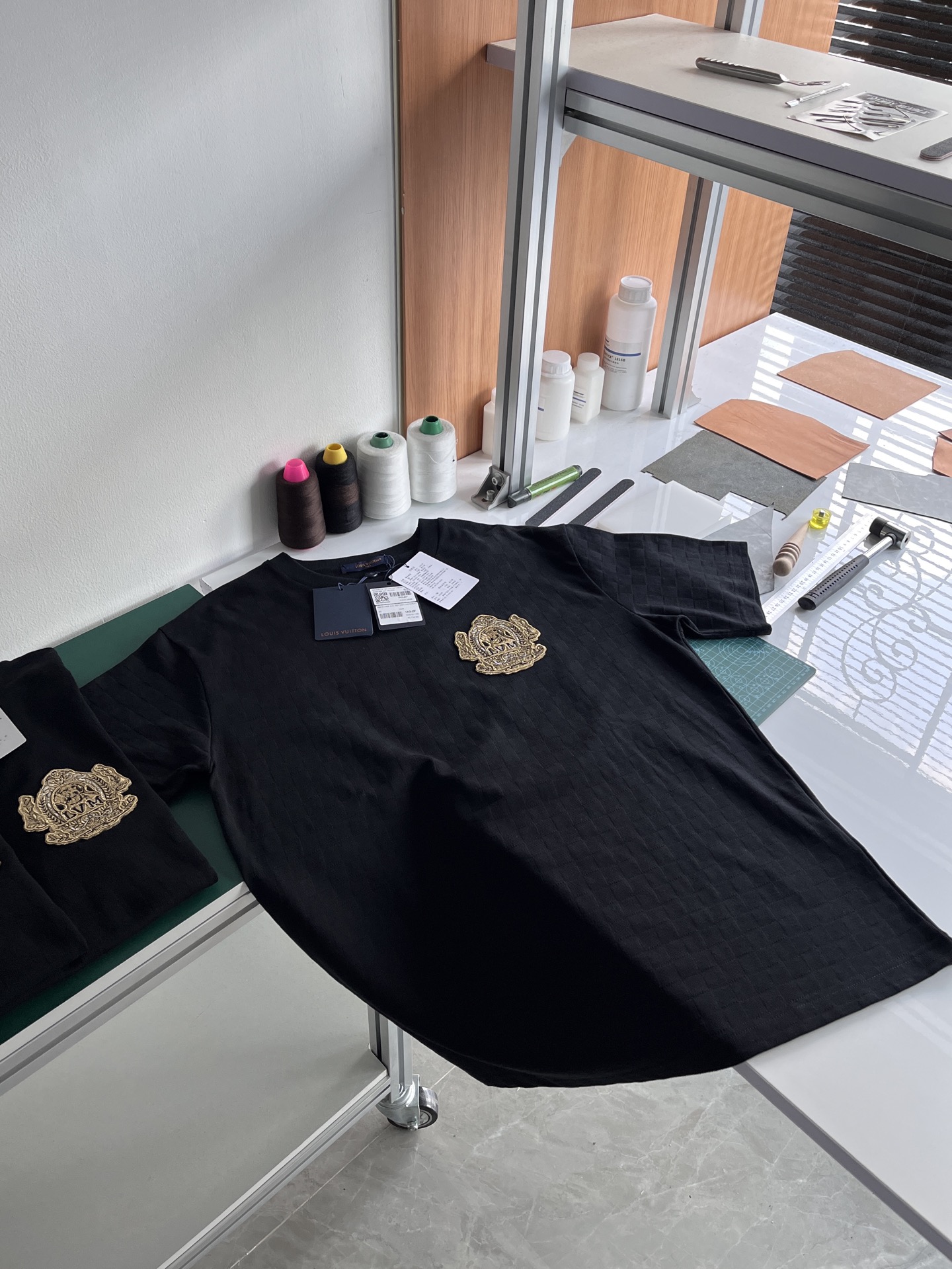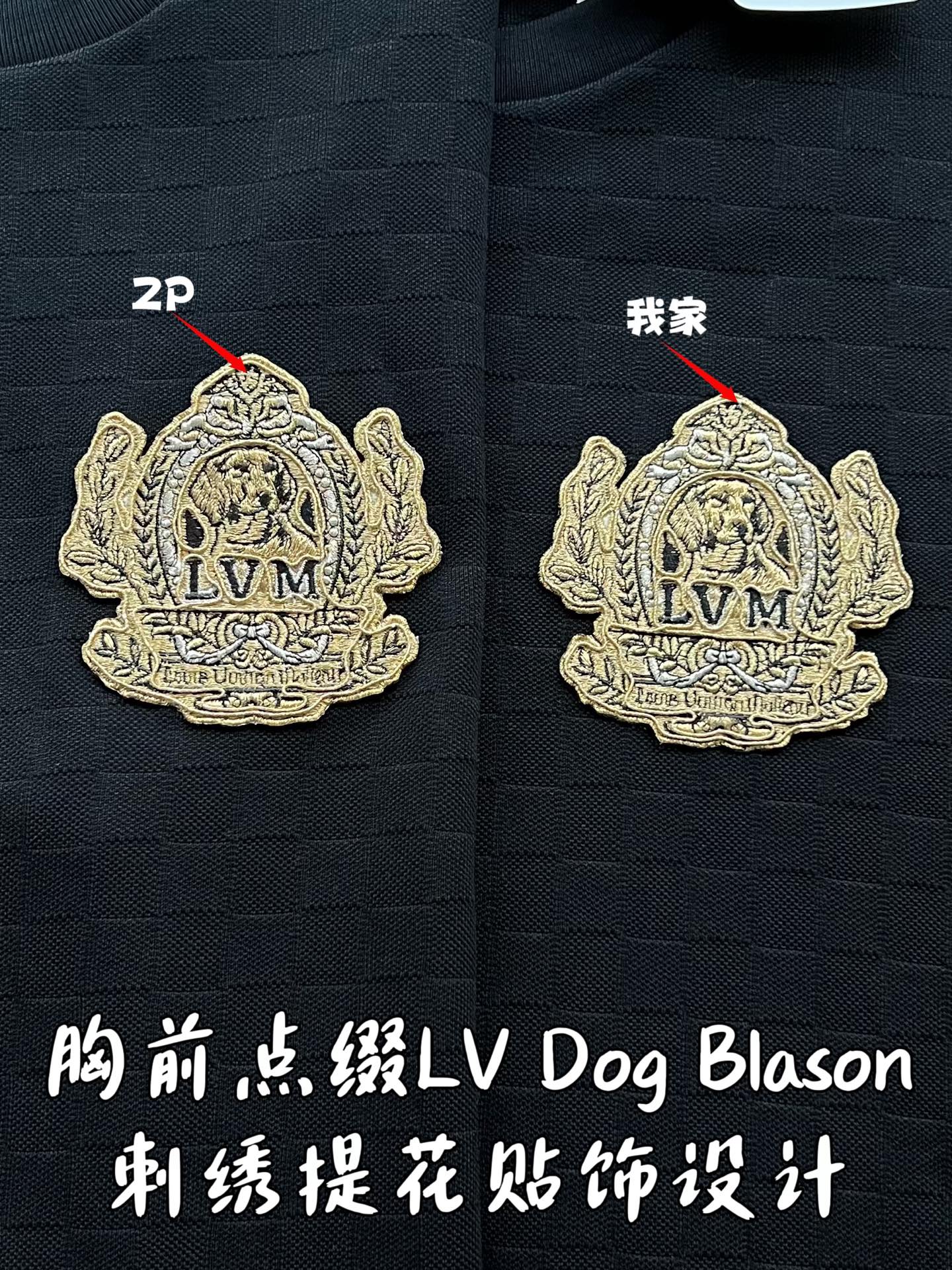 Louis Vuitton25ss小狗金线徽章短袖T恤‼️整件衣服9750购买ZP拆解打造,采用定制黑色珠地棉面料,做到100%全面进口纱线,全幅饰以Damier棋盘格提花珠地设计,胸前点缀LV Dog Blason刺绣提花贴饰,定织标志性罗纹领口,真正做到1:1copy 码数:XS S M L