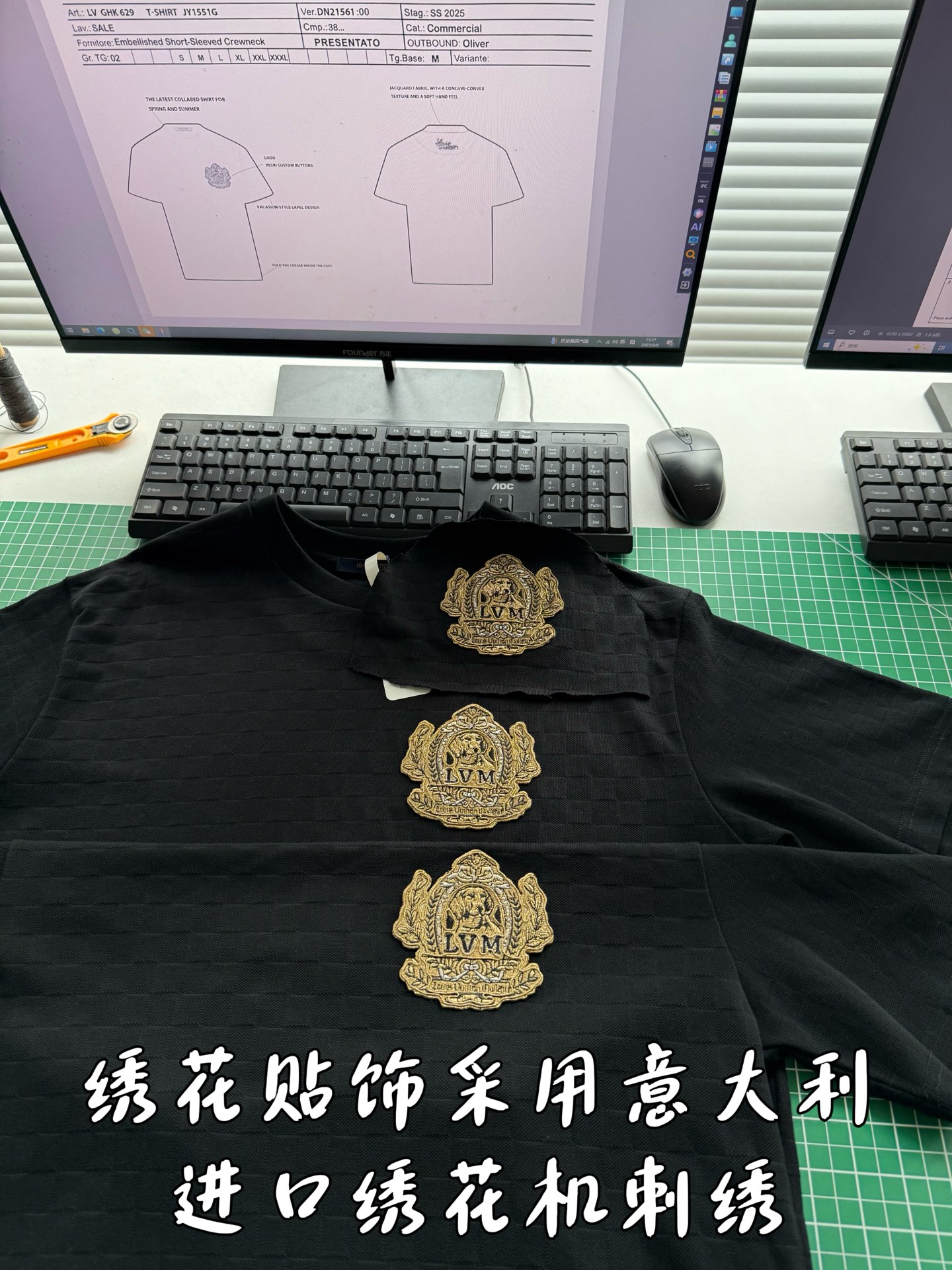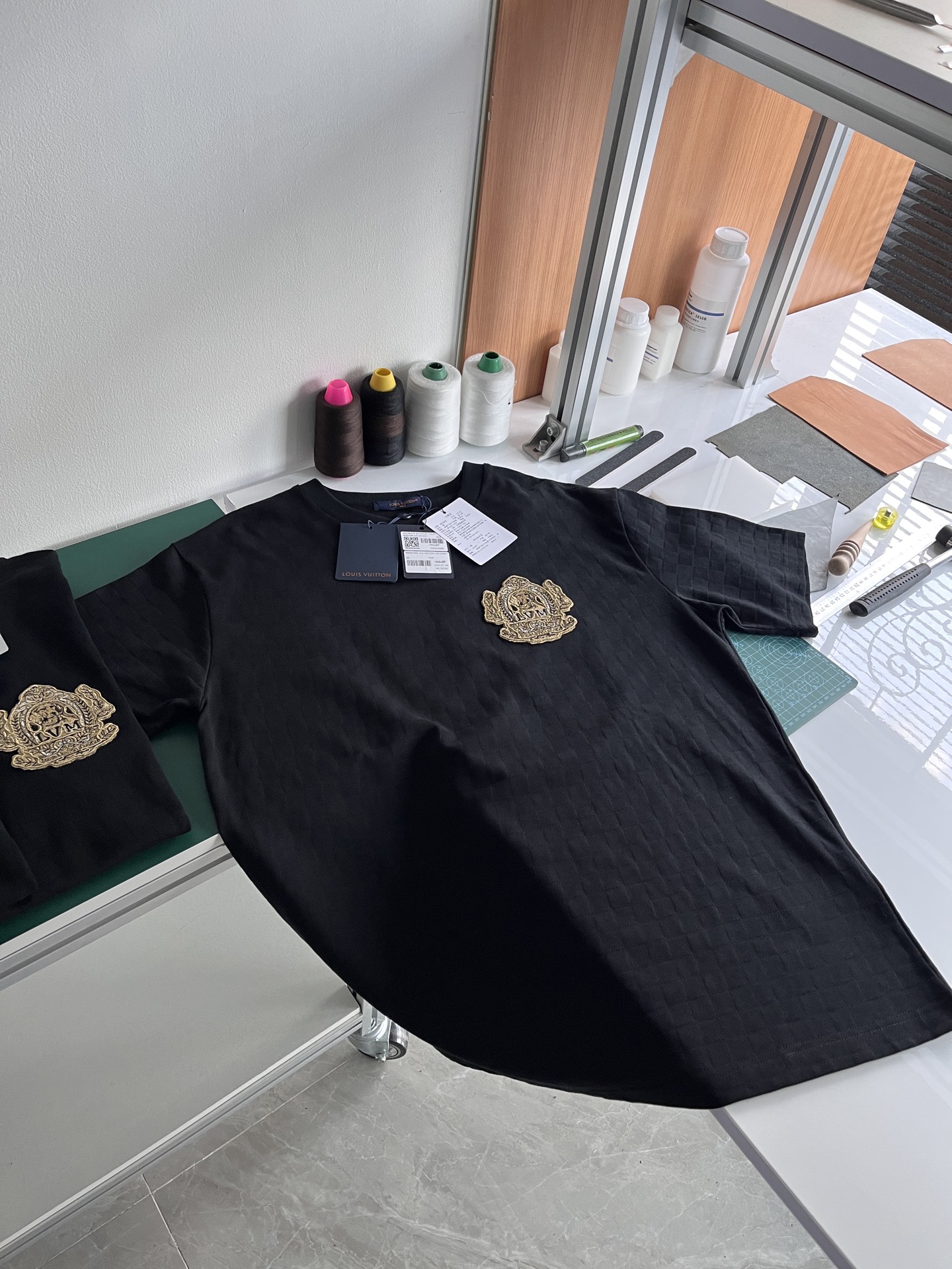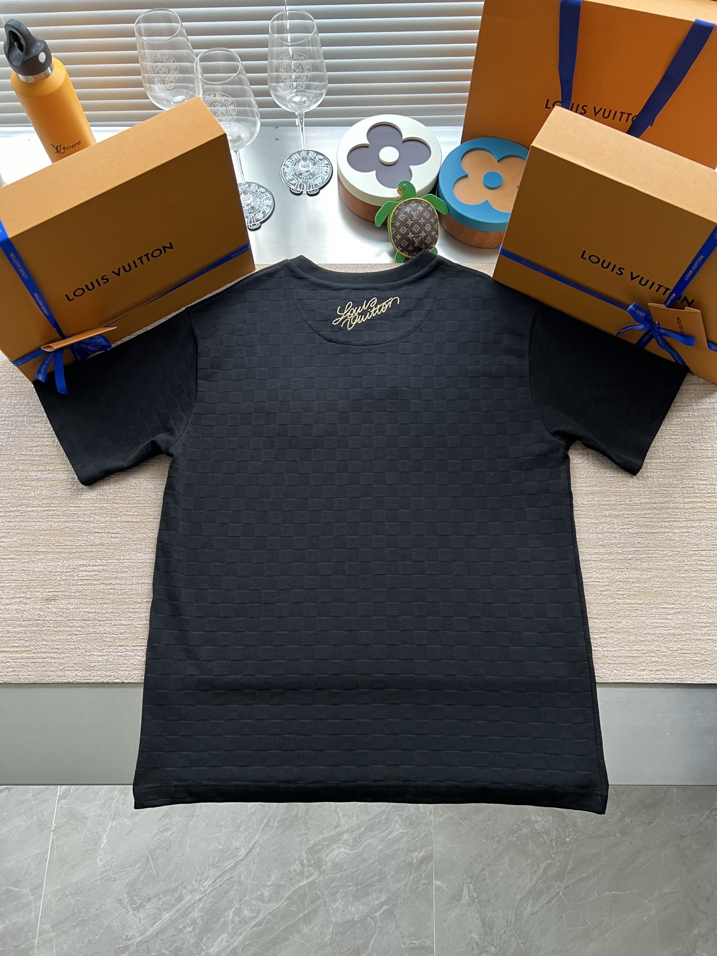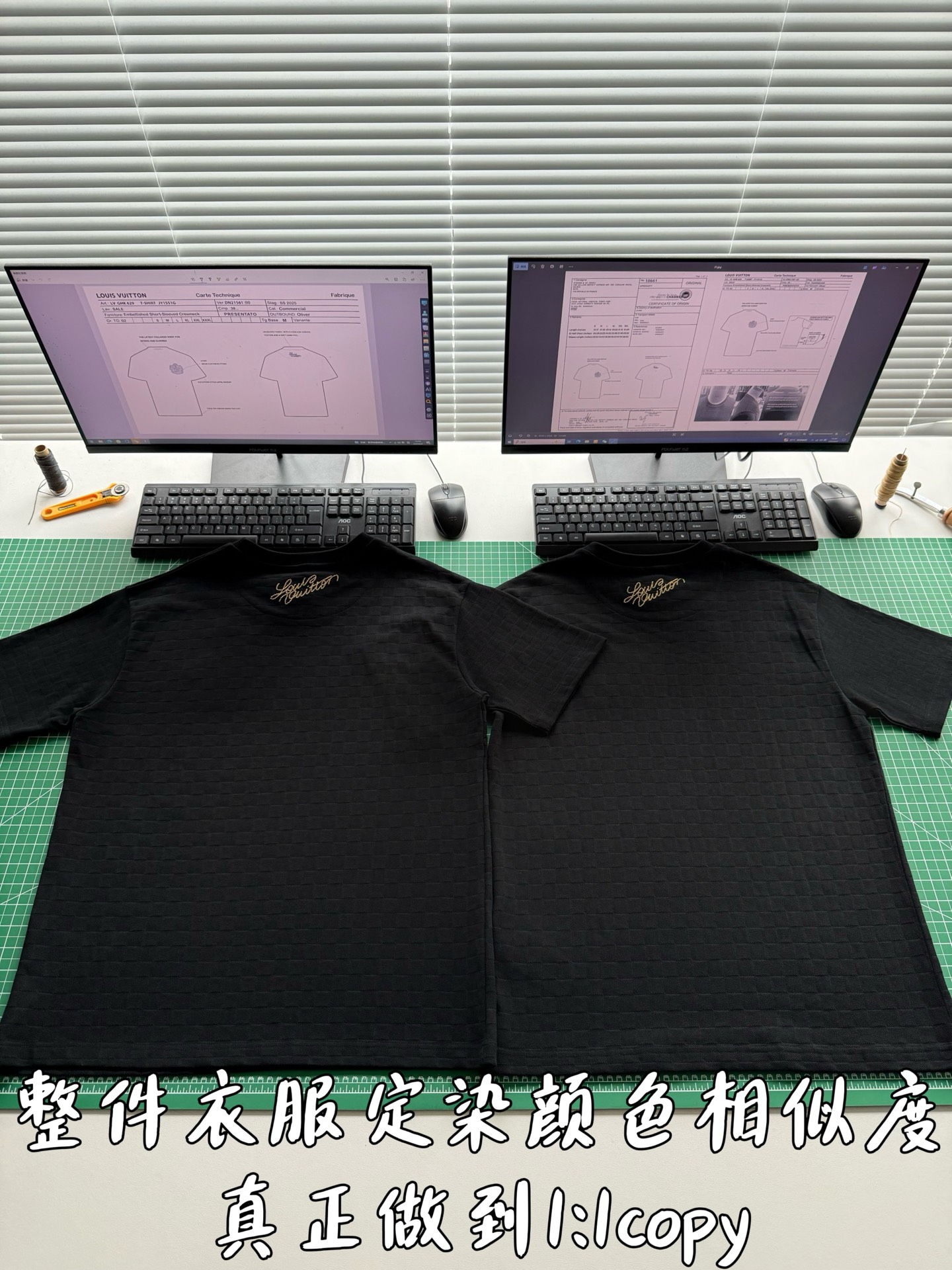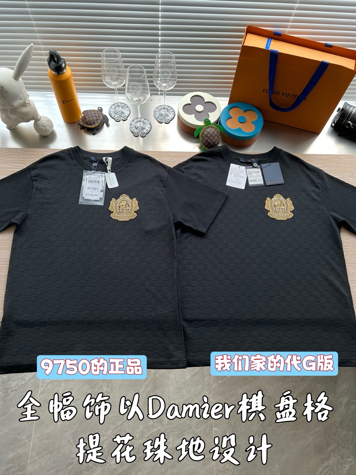 Louis Vuitton25ss小狗金线徽章短袖T恤‼️整件衣服9750购买ZP拆解打造,采用定制黑色珠地棉面料,做到100%全面进口纱线,全幅饰以Damier棋盘格提花珠地设计,胸前点缀LV Dog Blason刺绣提花贴饰,定织标志性罗纹领口,真正做到1:1copy 码数:XS S M L