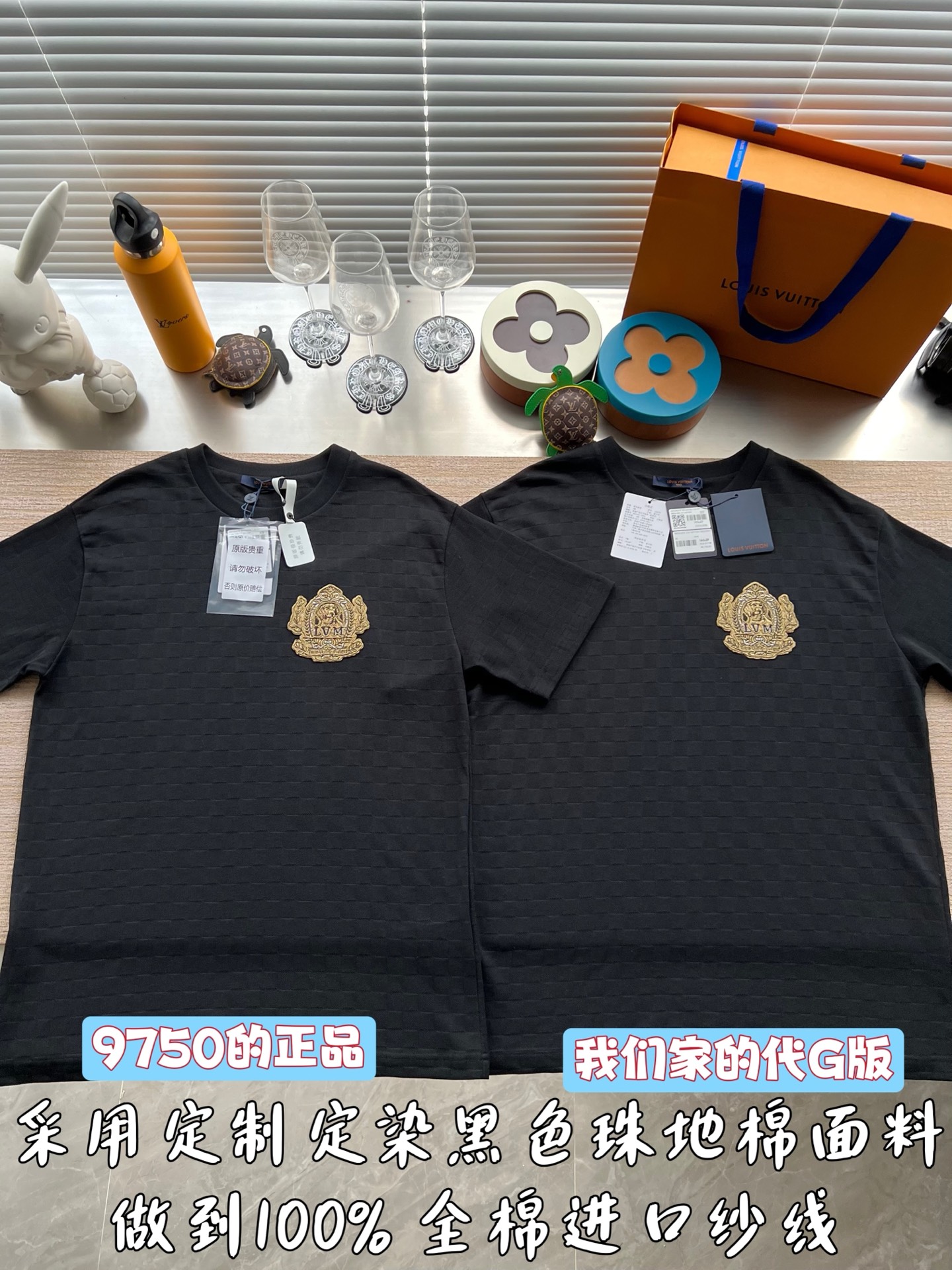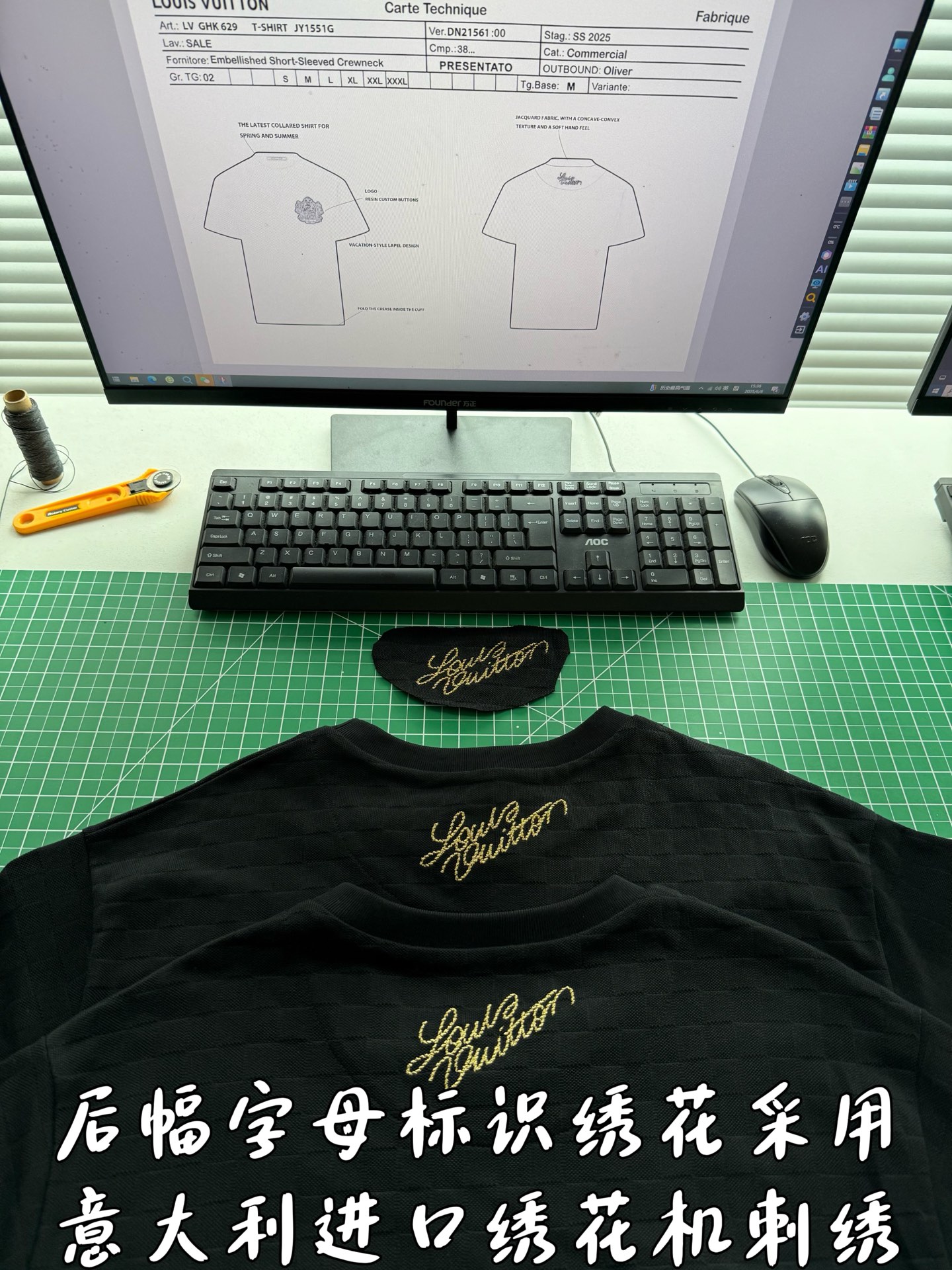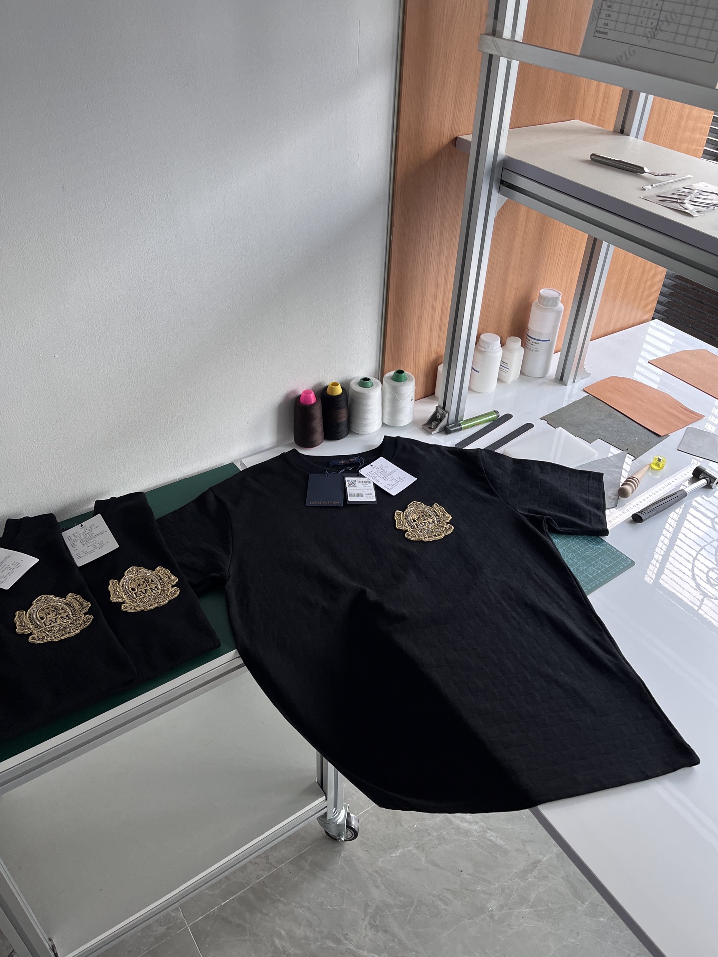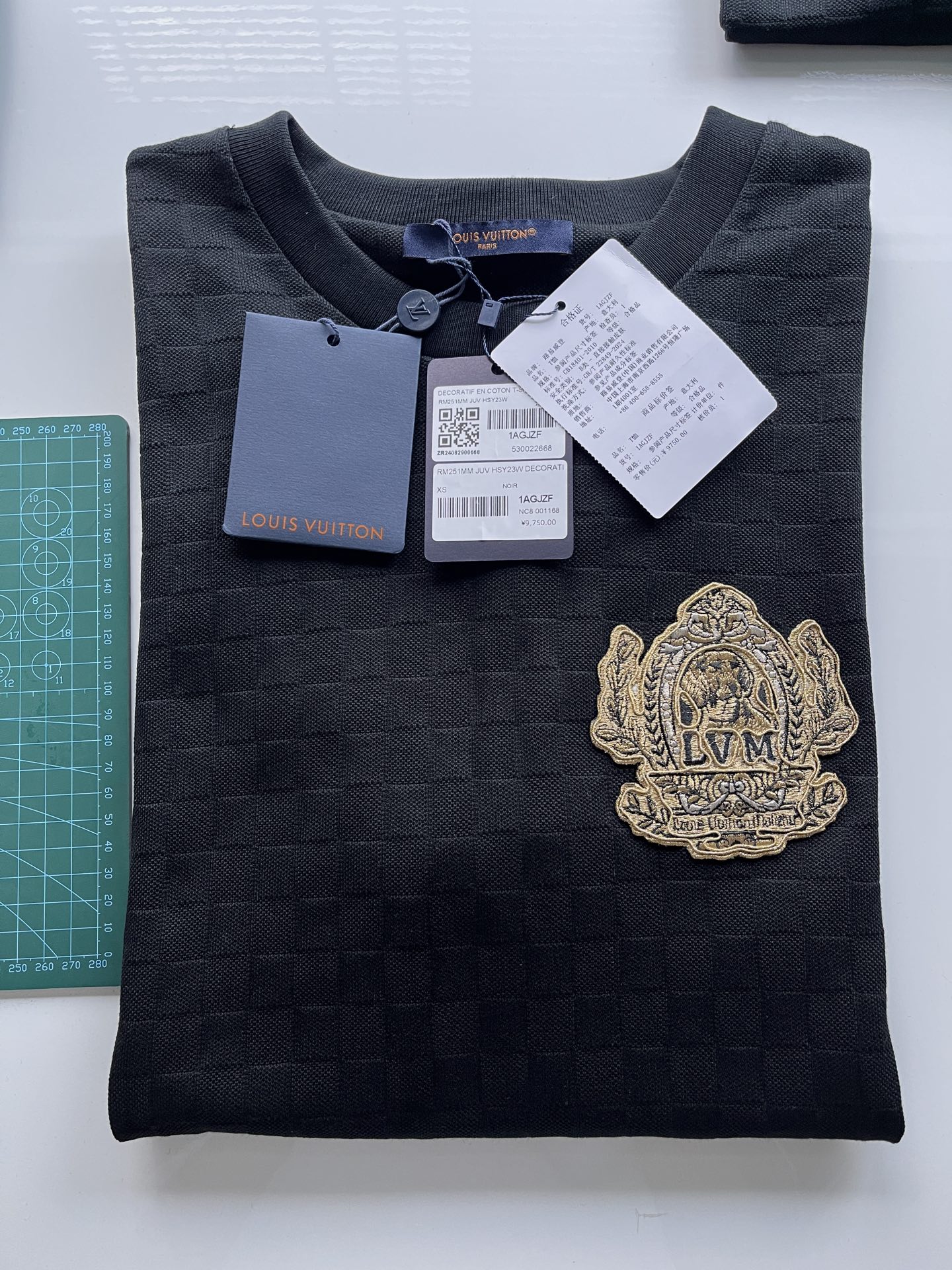 Louis Vuitton25ss小狗金线徽章短袖T恤‼️整件衣服9750购买ZP拆解打造,采用定制黑色珠地棉面料,做到100%全面进口纱线,全幅饰以Damier棋盘格提花珠地设计,胸前点缀LV Dog Blason刺绣提花贴饰,定织标志性罗纹领口,真正做到1:1copy 码数:XS S M L