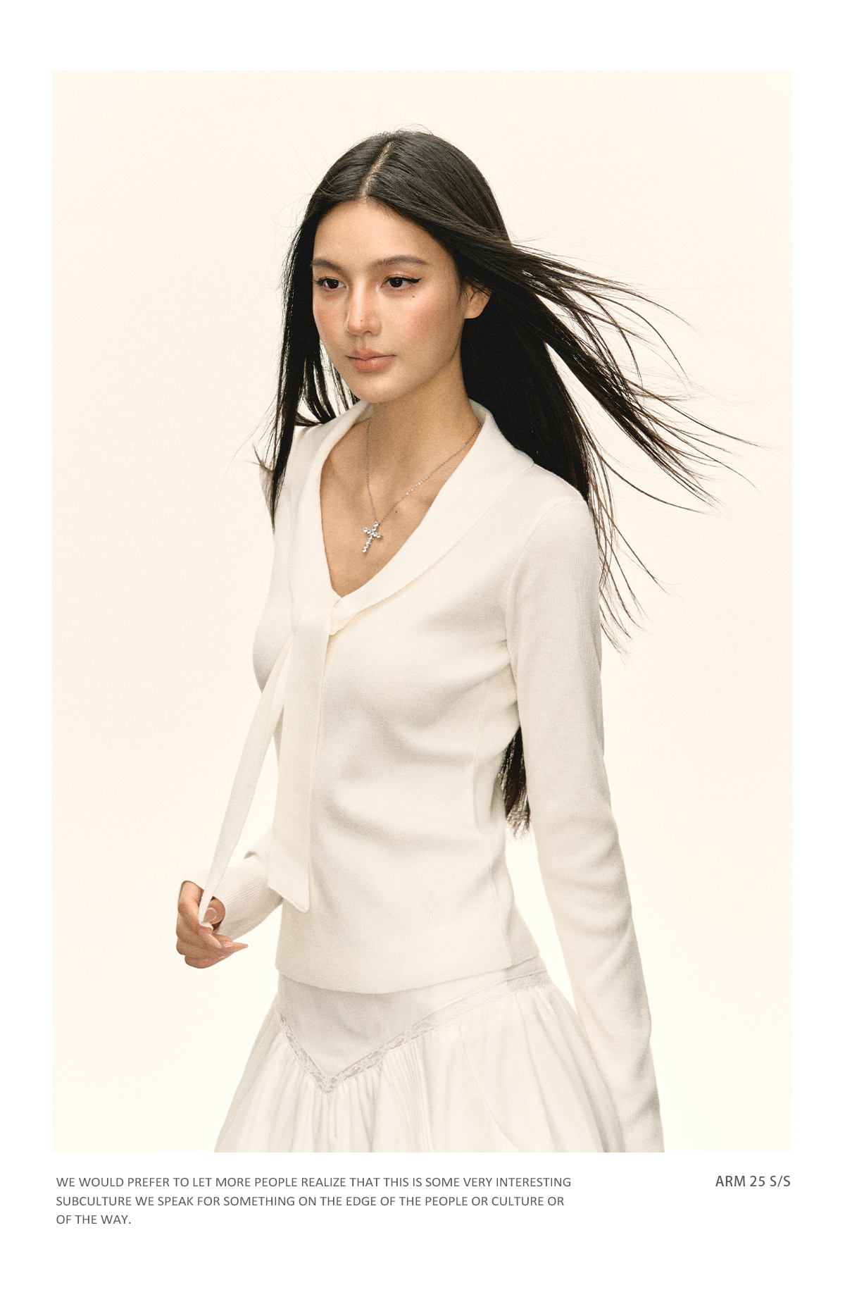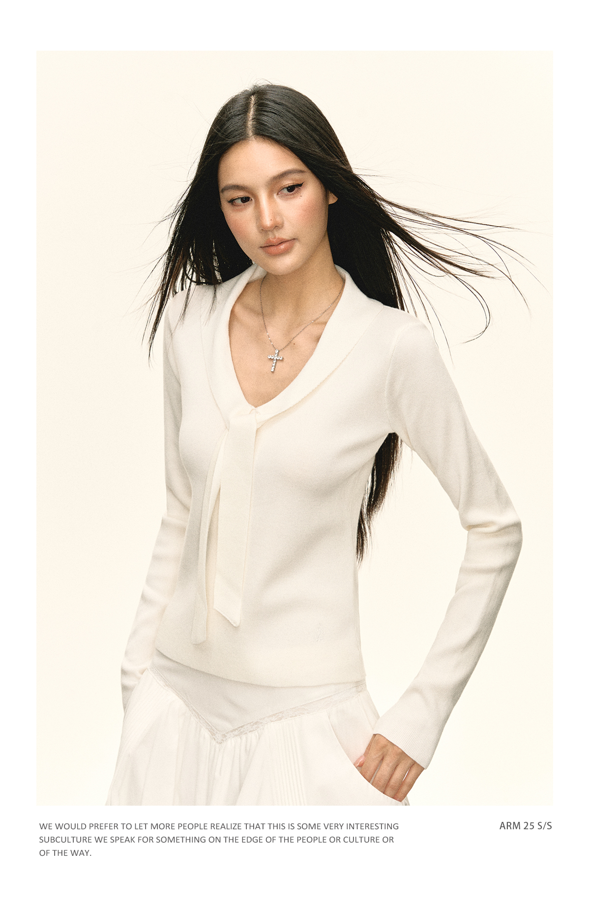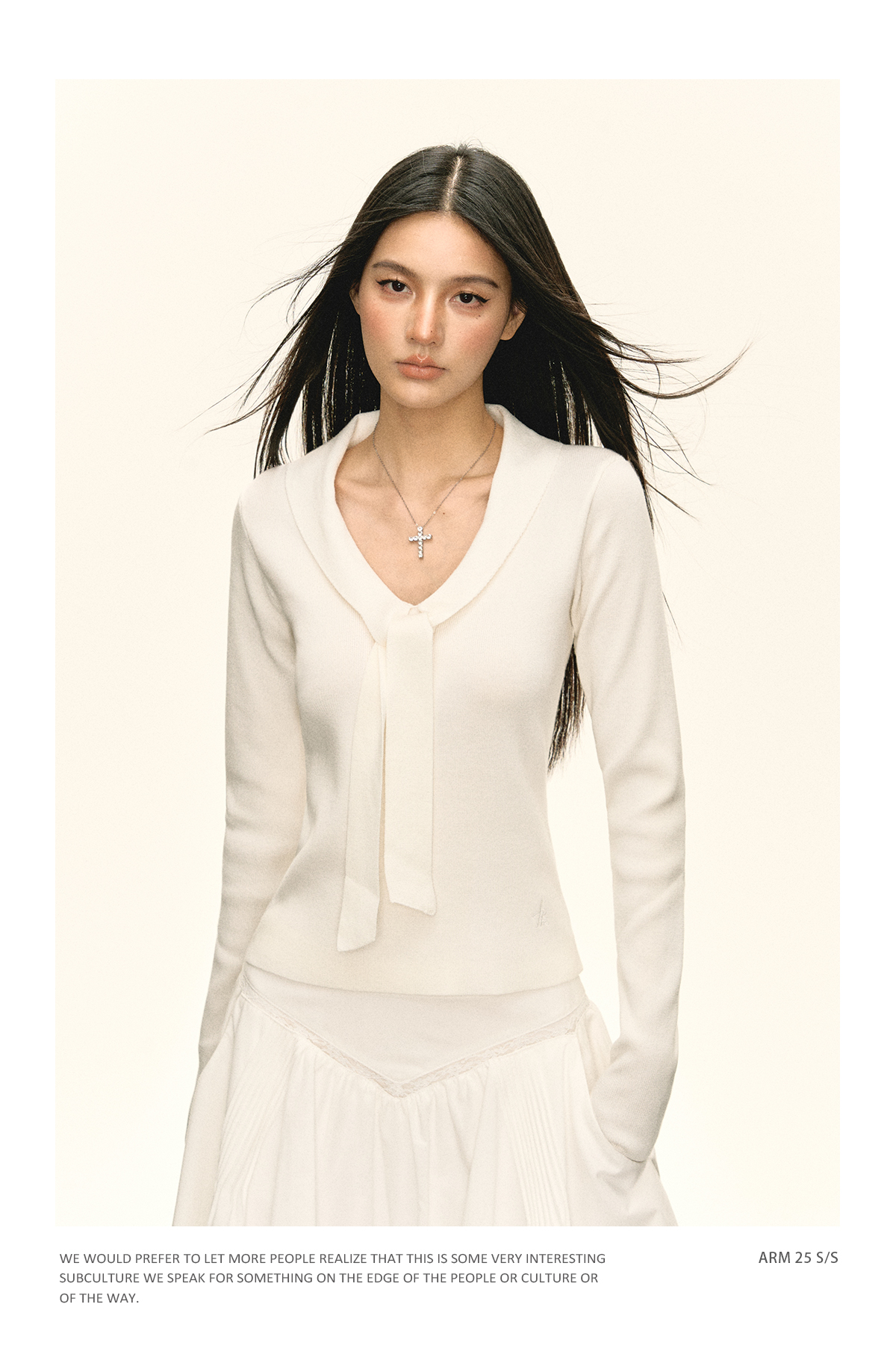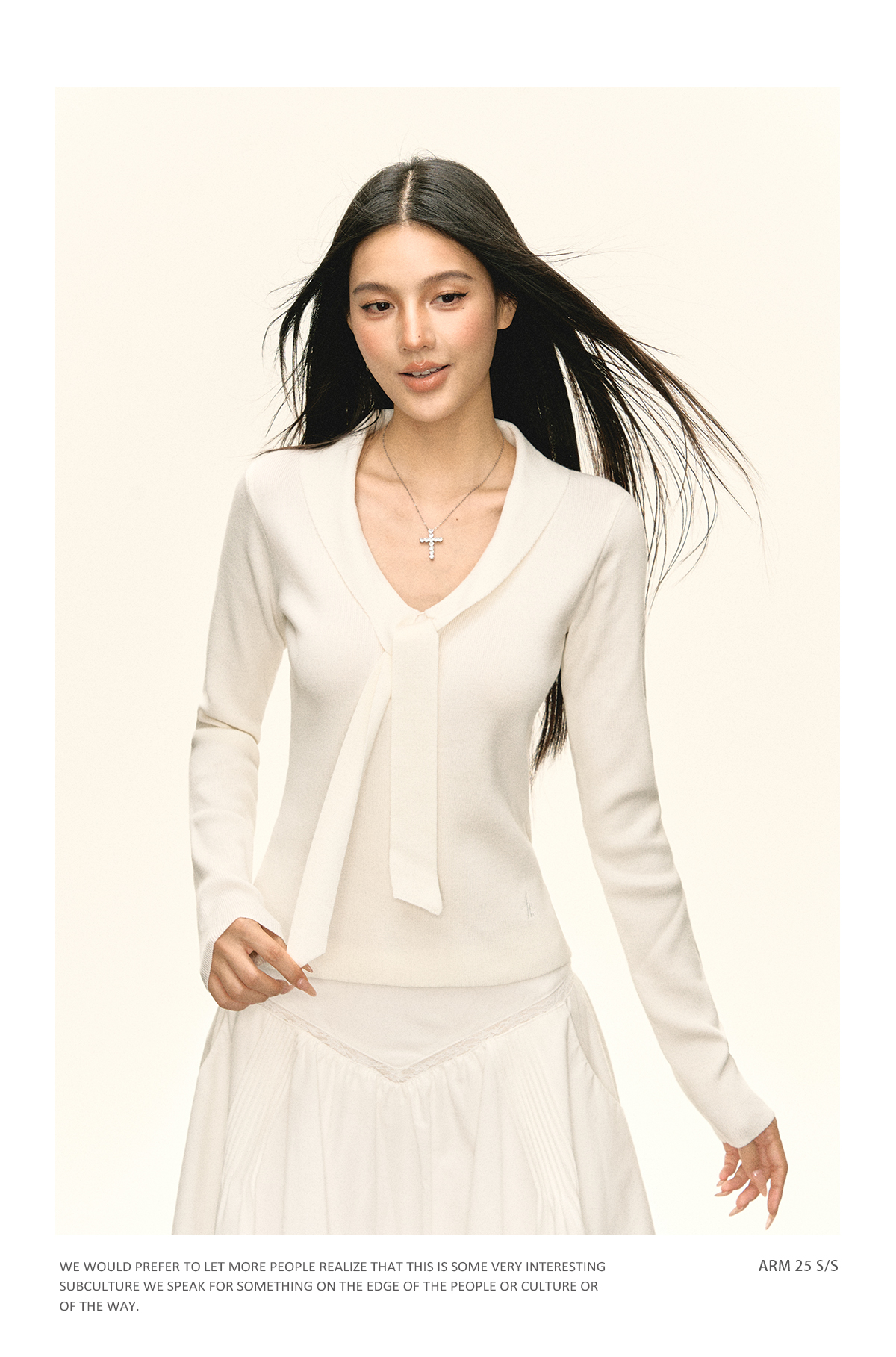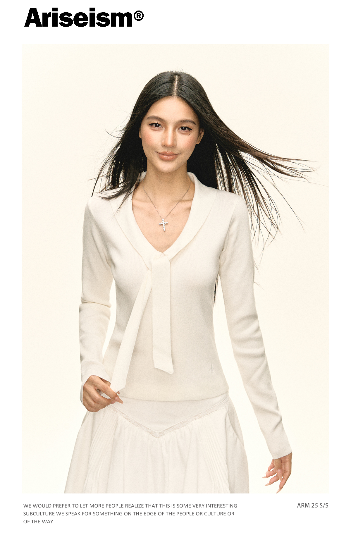 Ariseism 美式复古设计感白色领带针织毛衣女秋季新款修身上衣