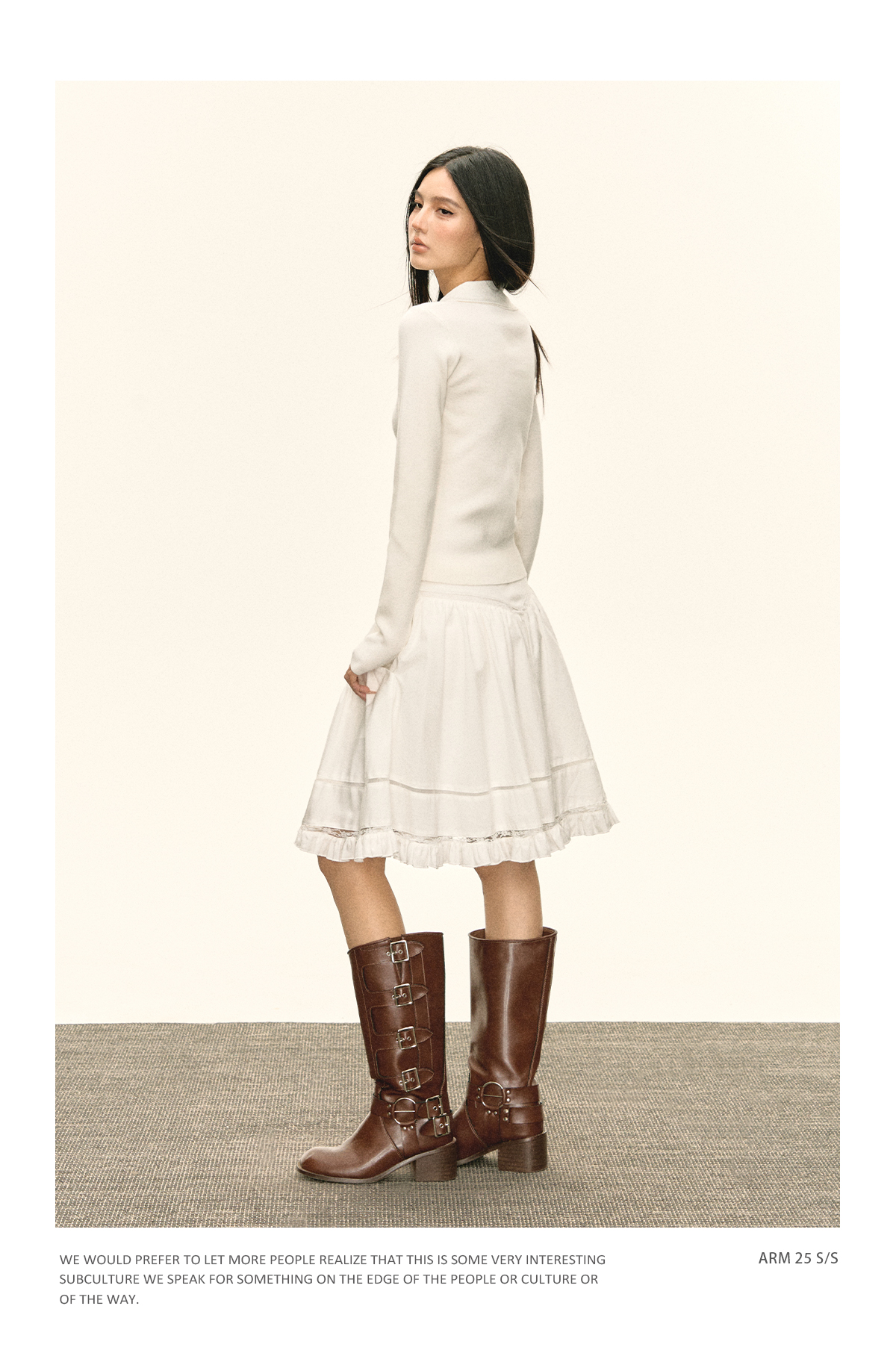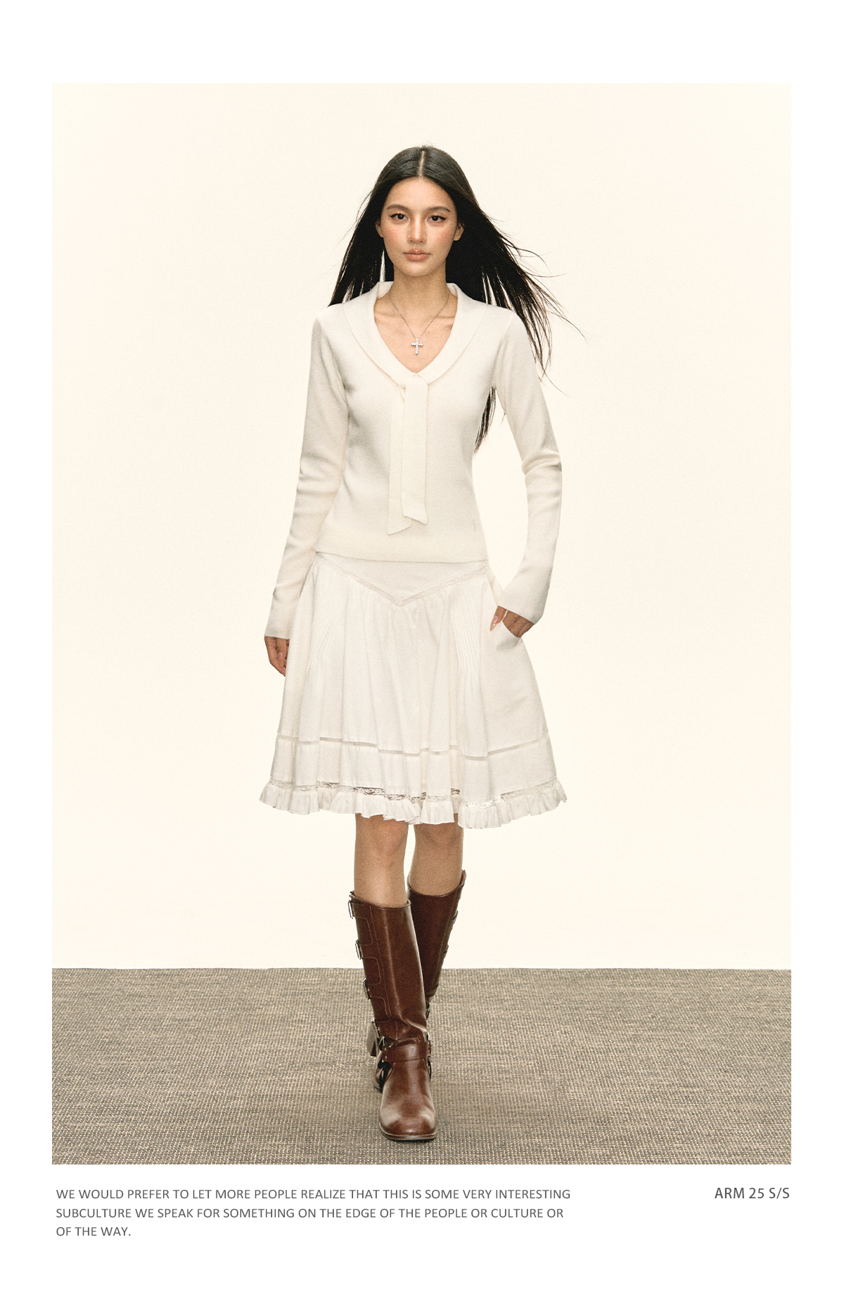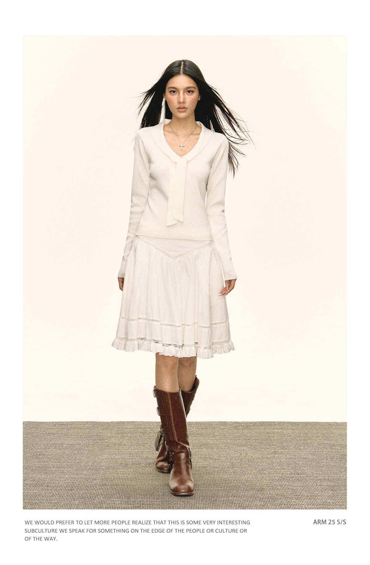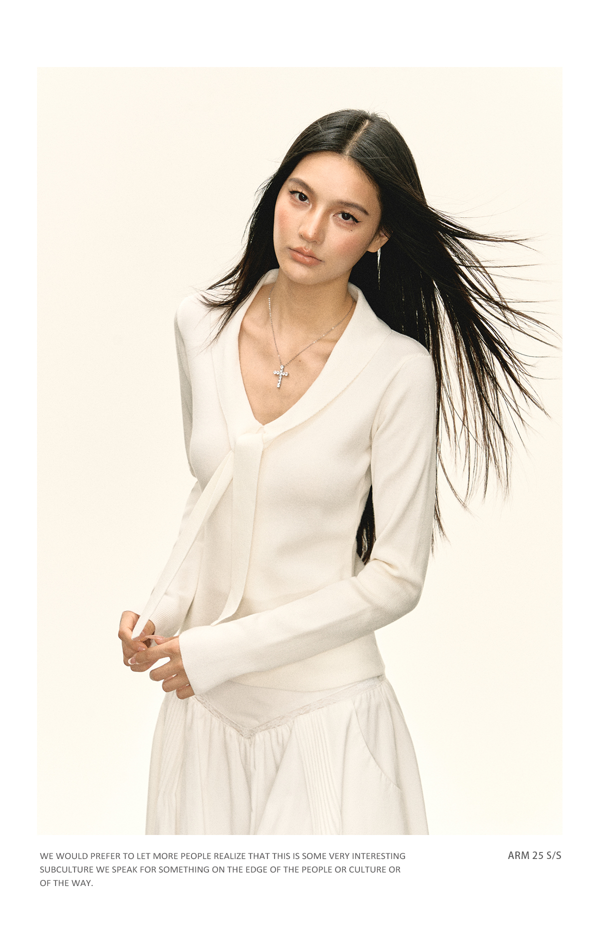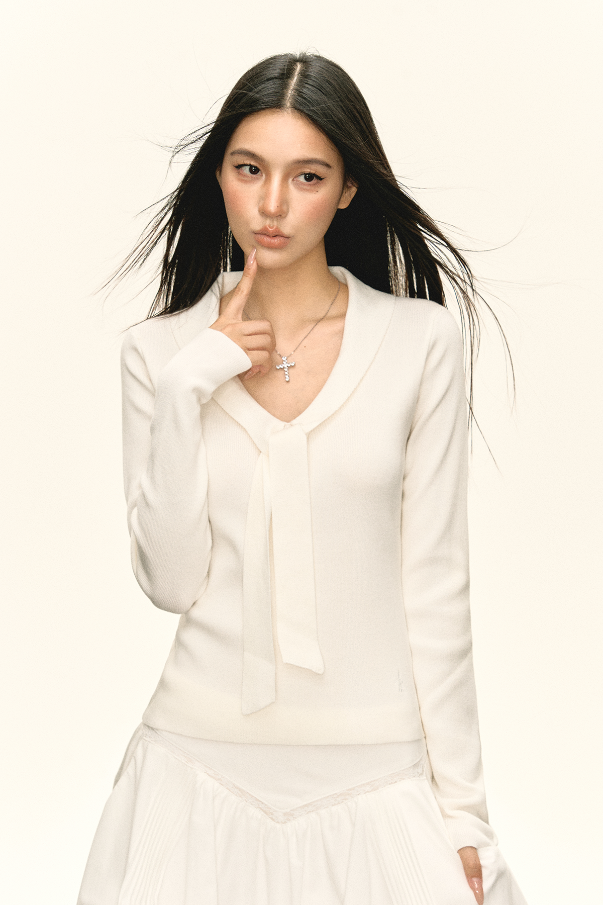 Ariseism 美式复古设计感白色领带针织毛衣女秋季新款修身上衣
