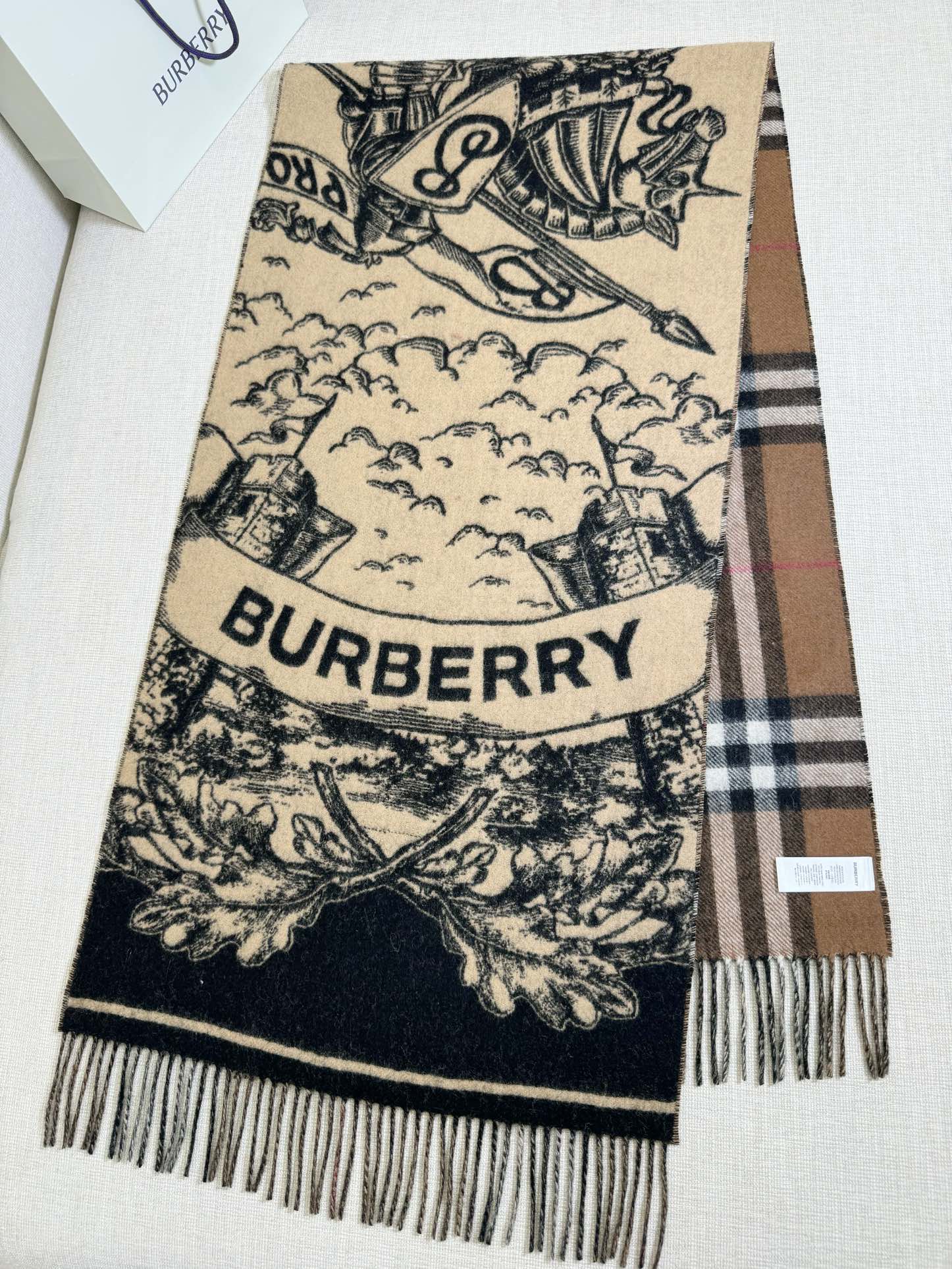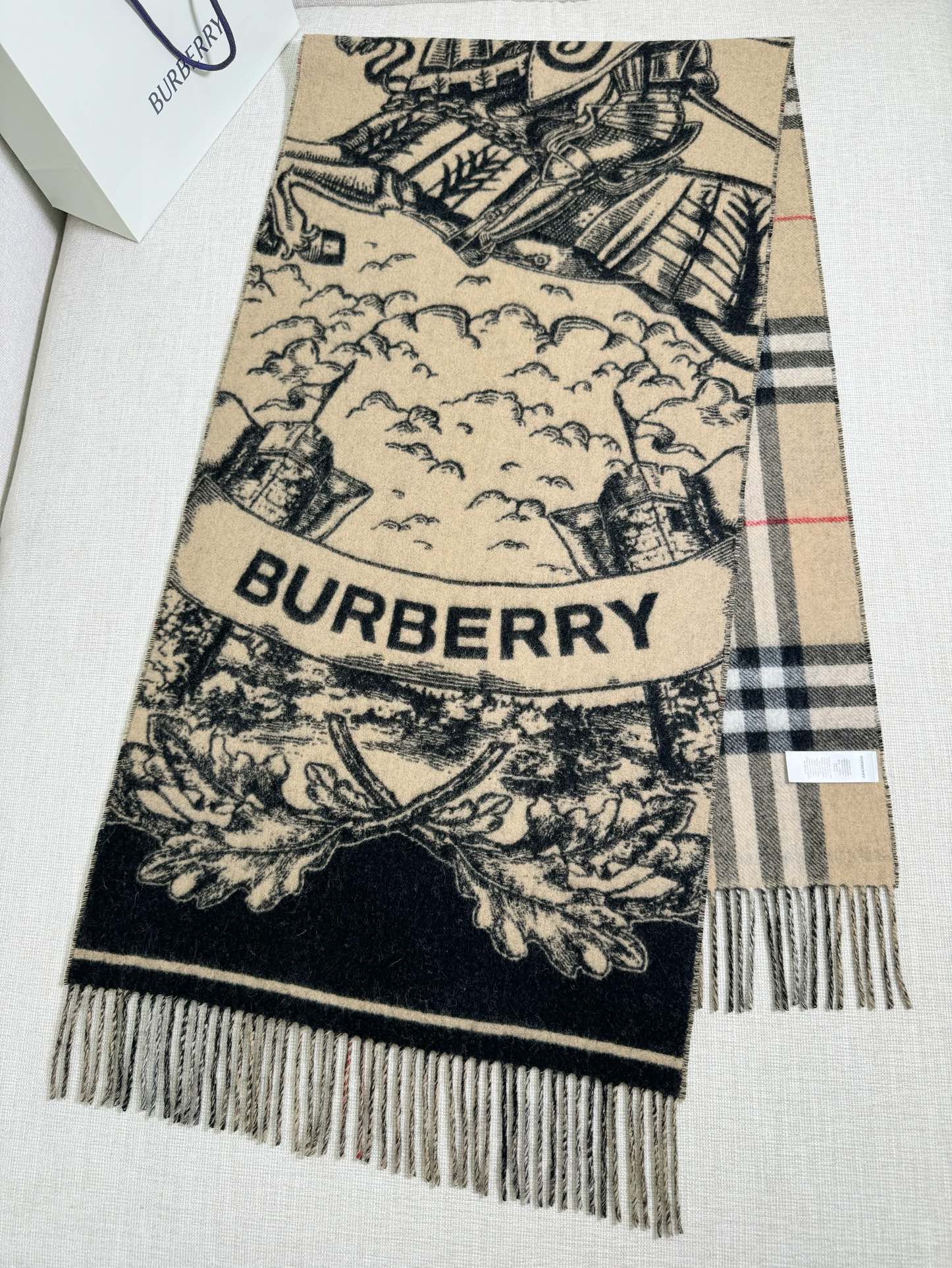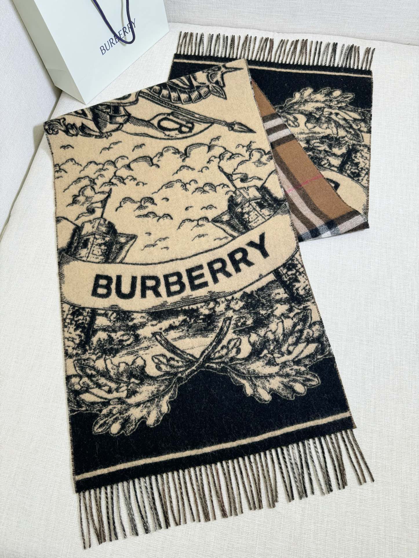 双面都好看!选用提花精纺羊绒面料制成,装饰品牌大号格纹和马术骑士两面设计。手绘印花,将品牌徽标融入橡树叶和橡果背景中,彰显品牌风范 高级有质感 细节🈵️分~干练气质 贵族风!