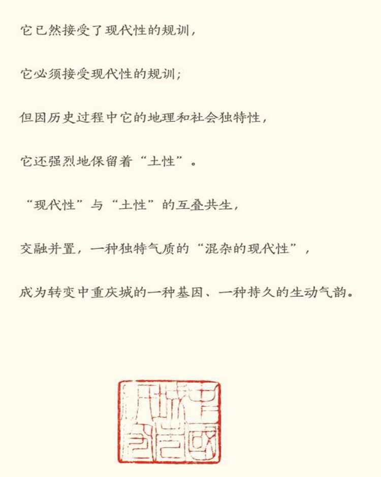 重庆有根深蒂固的“土性”、坚韧的“地方性”。这一性是由其在总体里“封闭中的开放”的格局所决定。给人以巨大差异的城市情感体验,是重庆城现代化过程中的“奇幻”质。
