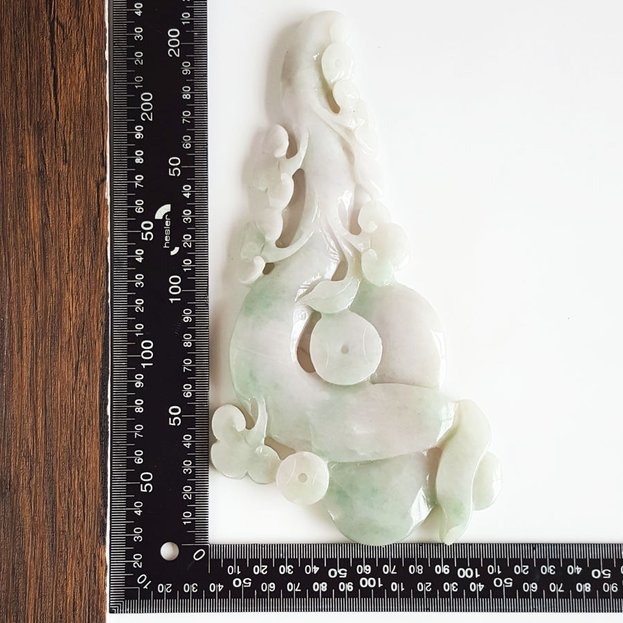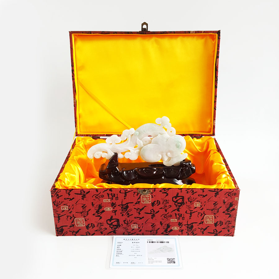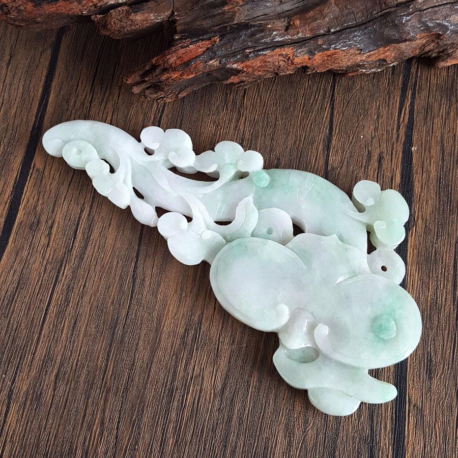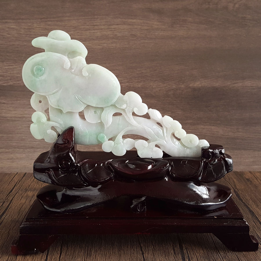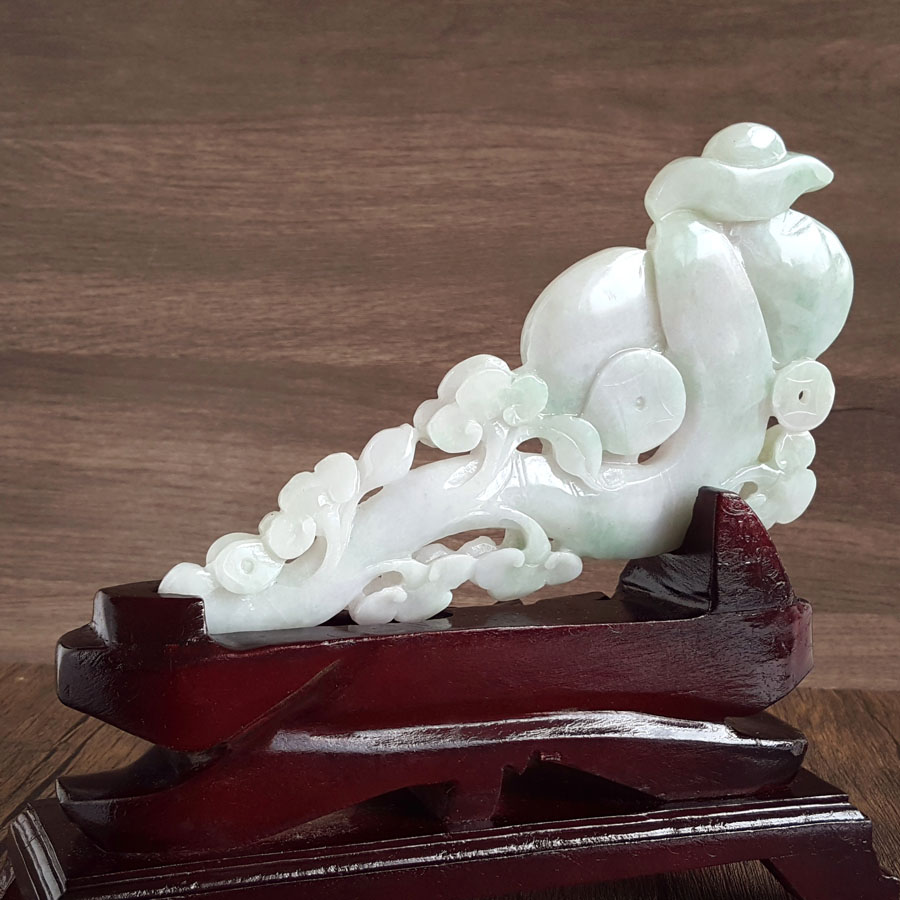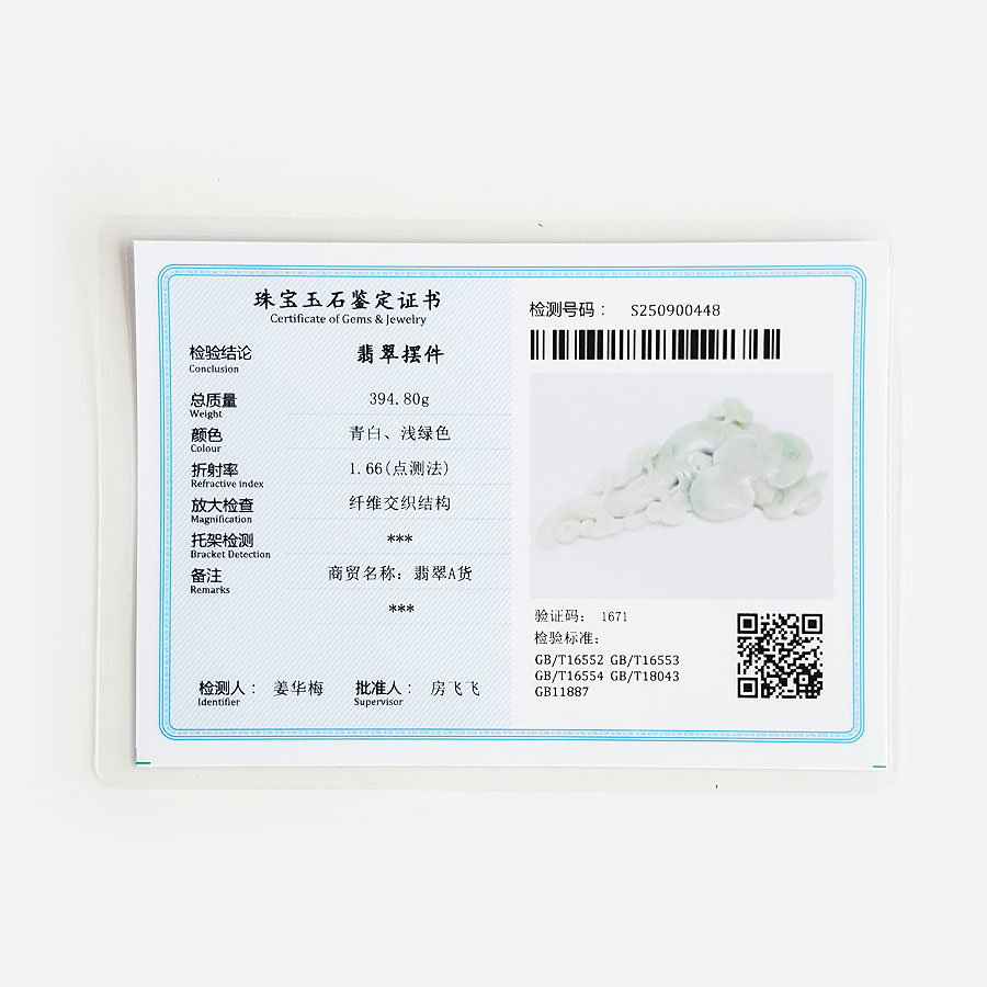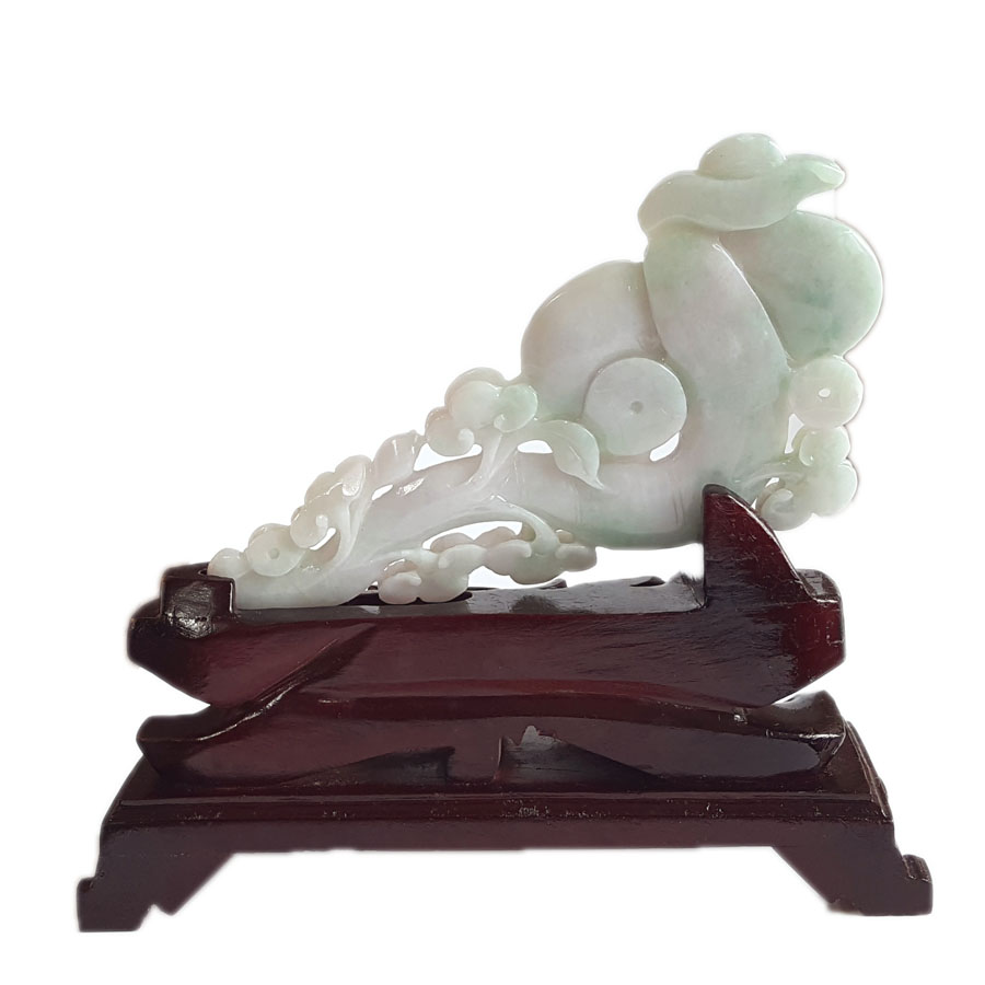 【天然正品】天然细腻细豆种青白含绿灵芝如意(万事如意)翡翠配木架摆件190825AK15 现售价:1680特价!
