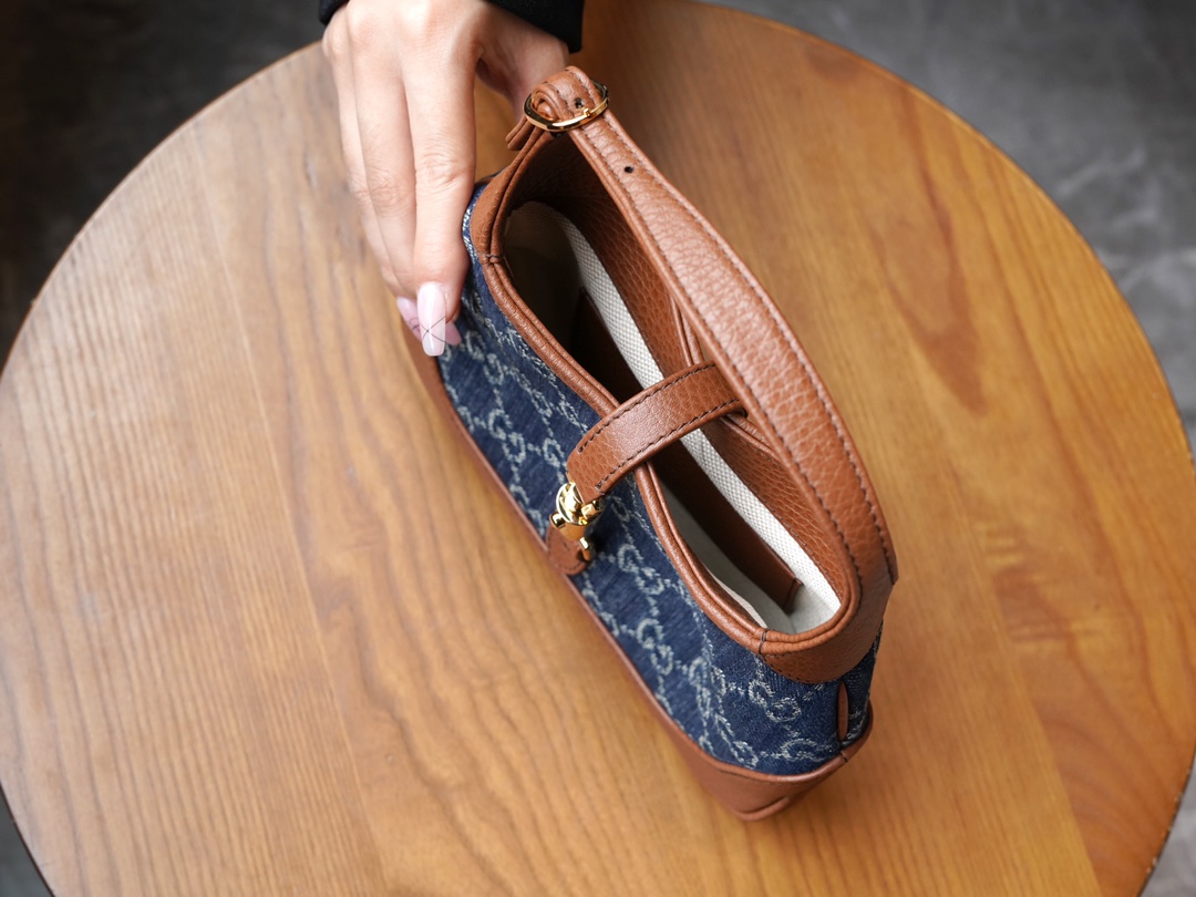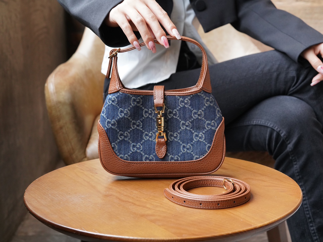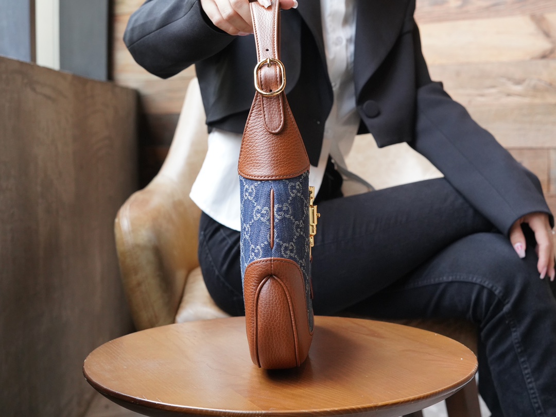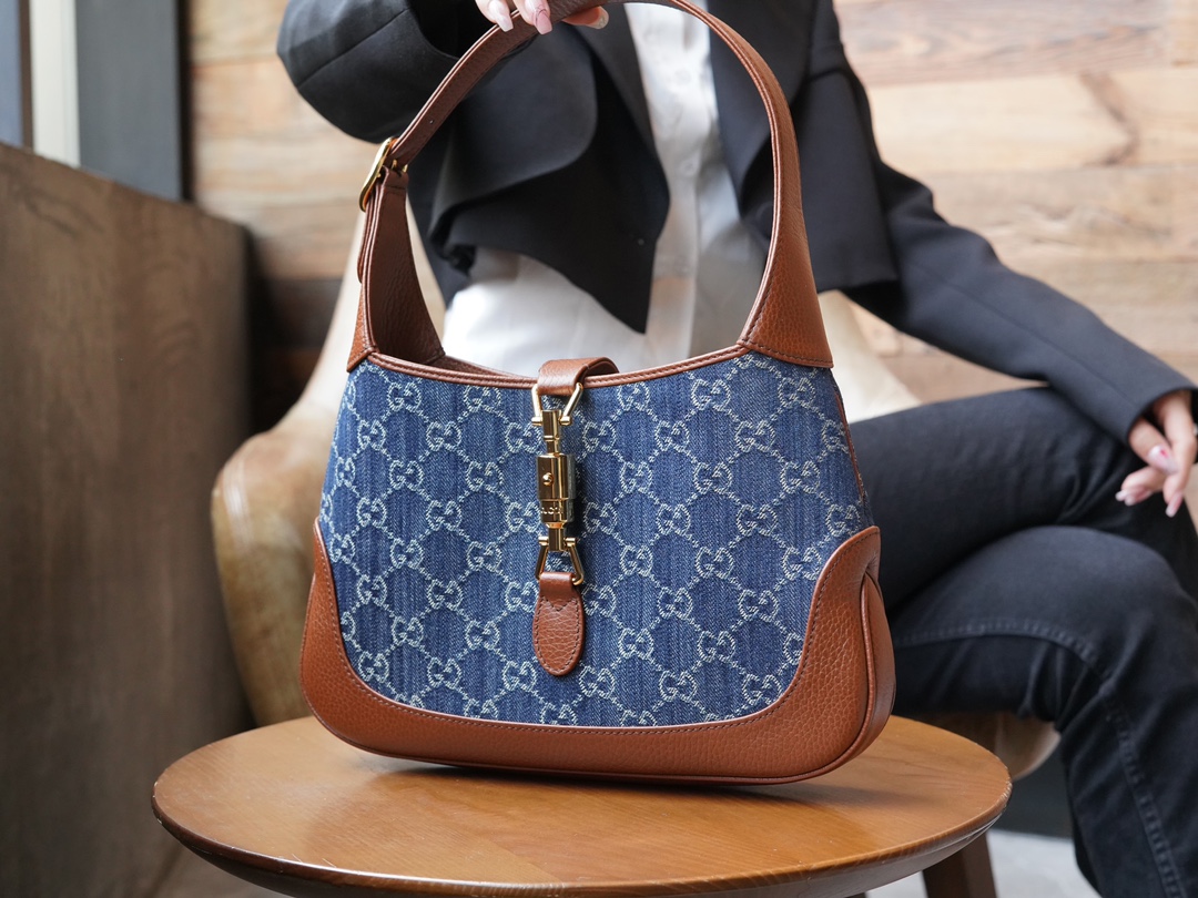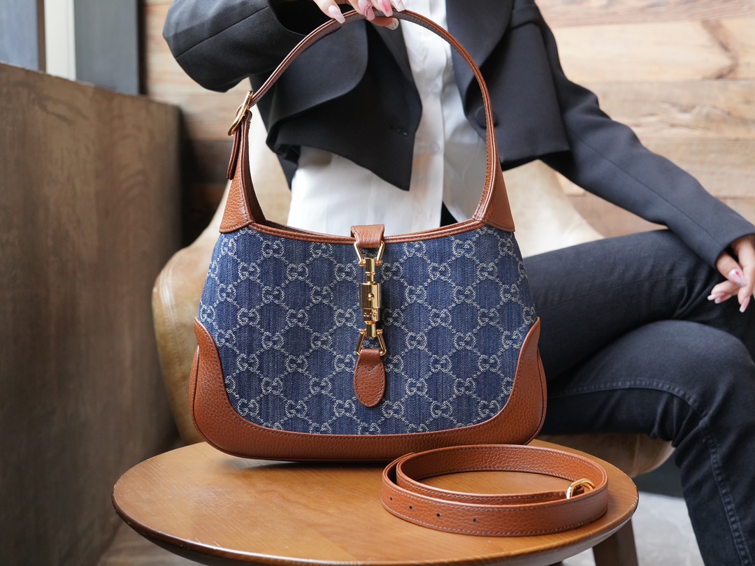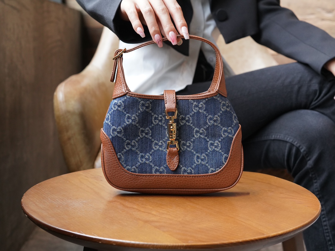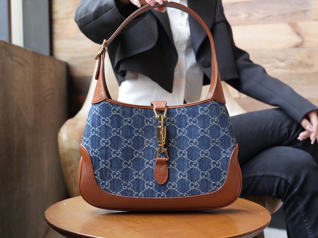 古驰 Jackie1961复古金扣老花LOGO牛仔皮拼皮腋下包手提单肩斜挎包 女款灰蓝色/棕色(LZ)