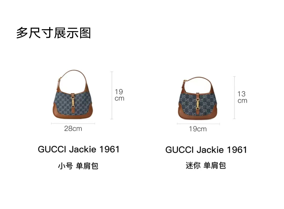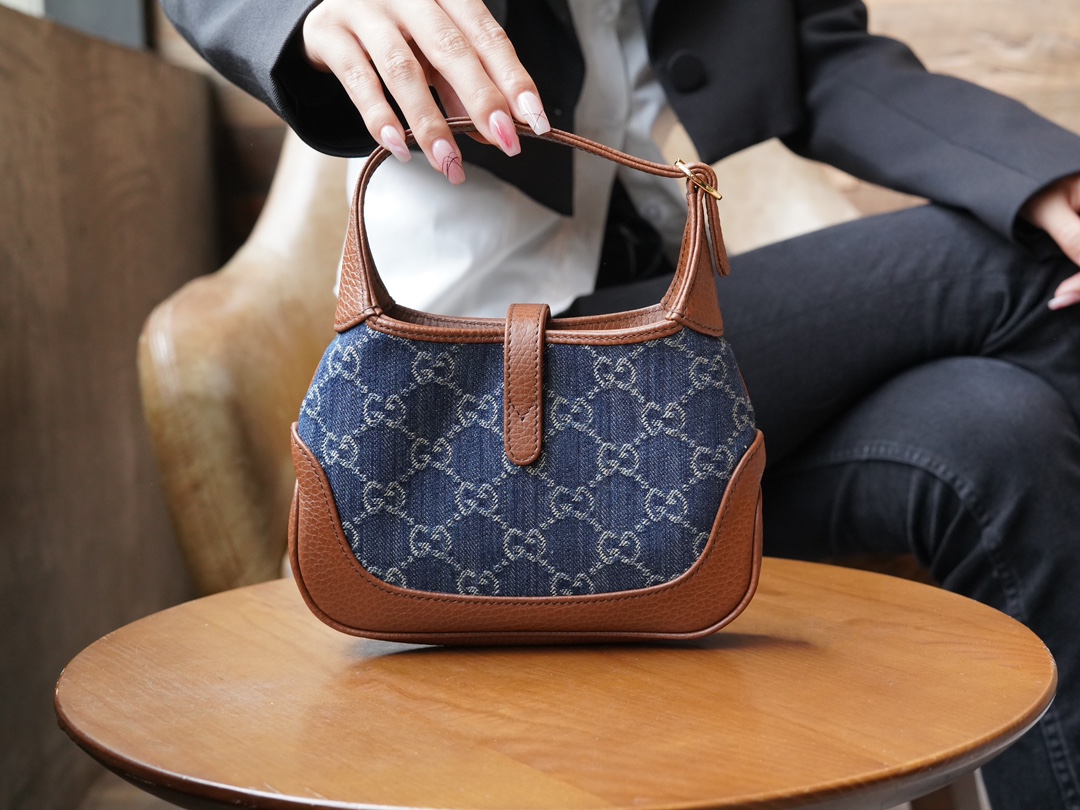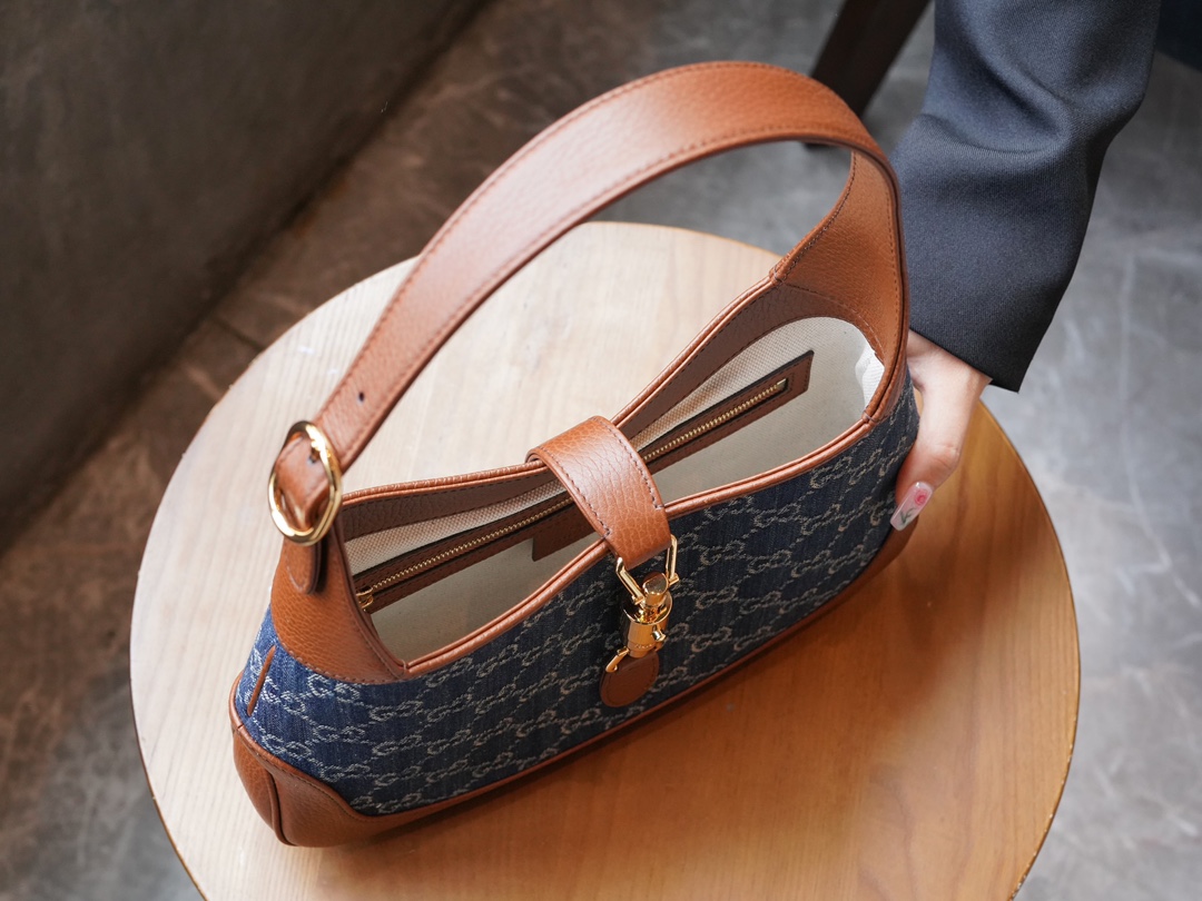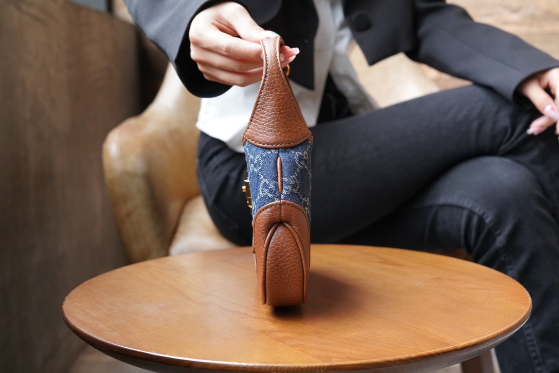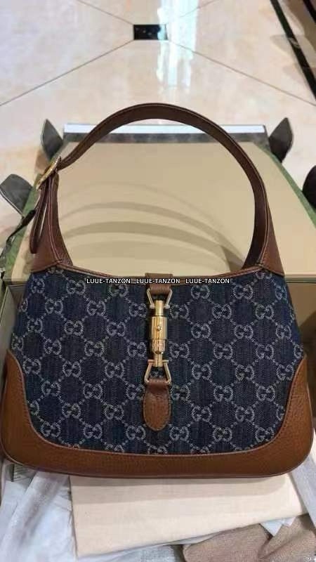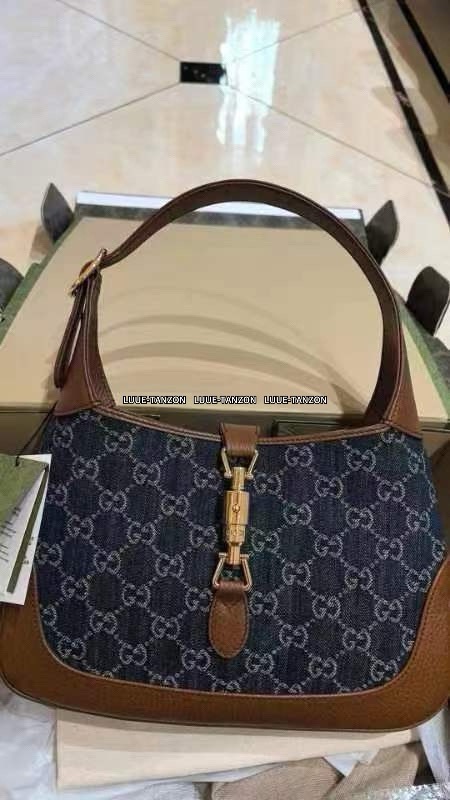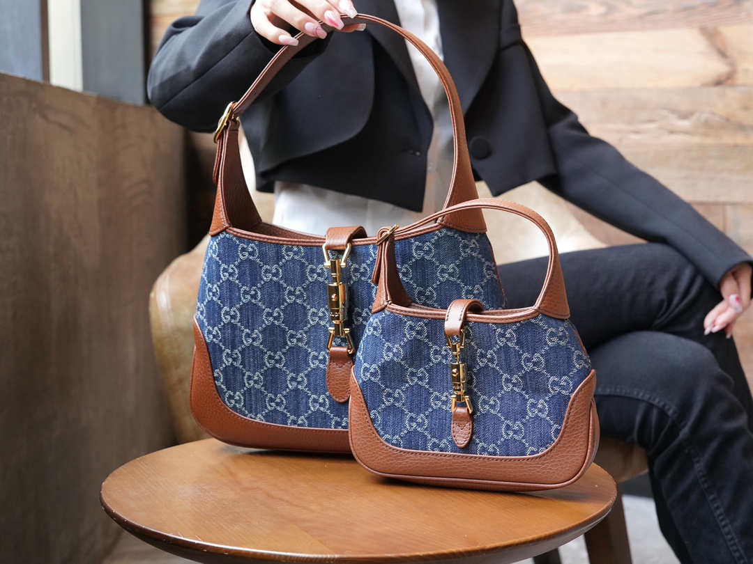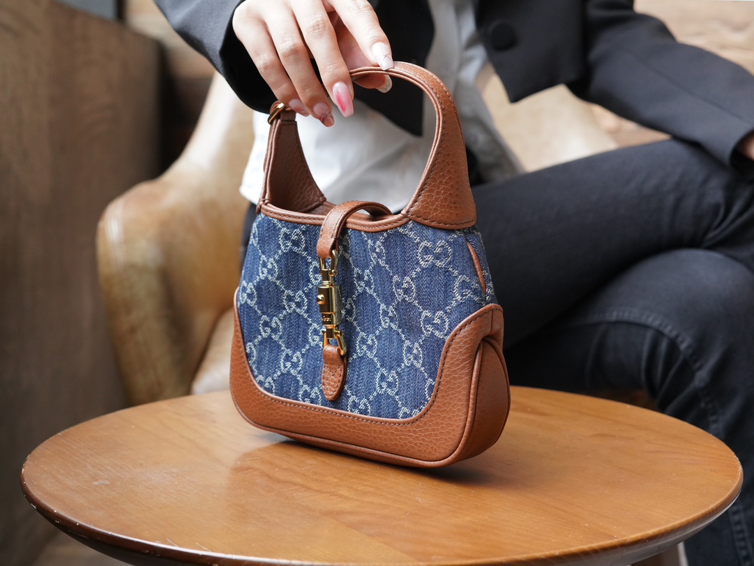 古驰 Jackie1961复古金扣老花LOGO牛仔皮拼皮腋下包手提单肩斜挎包 女款灰蓝色/棕色(LZ)