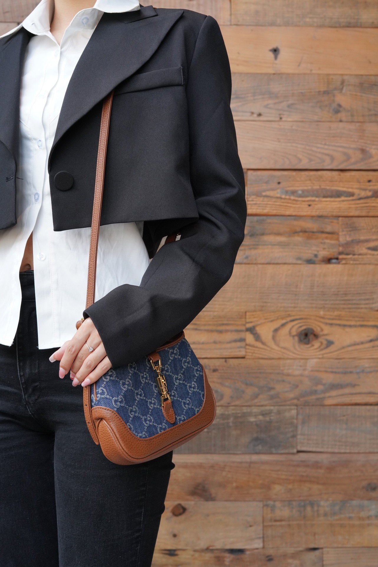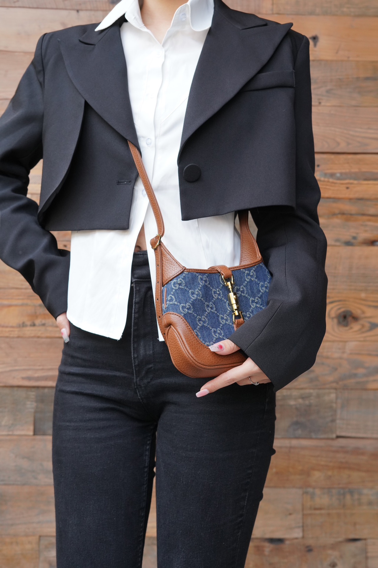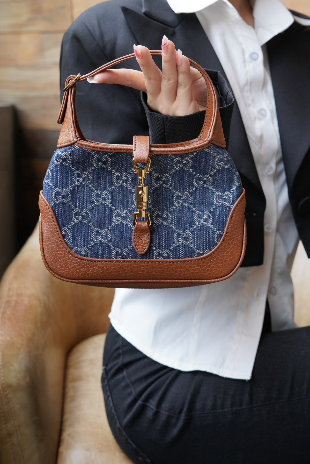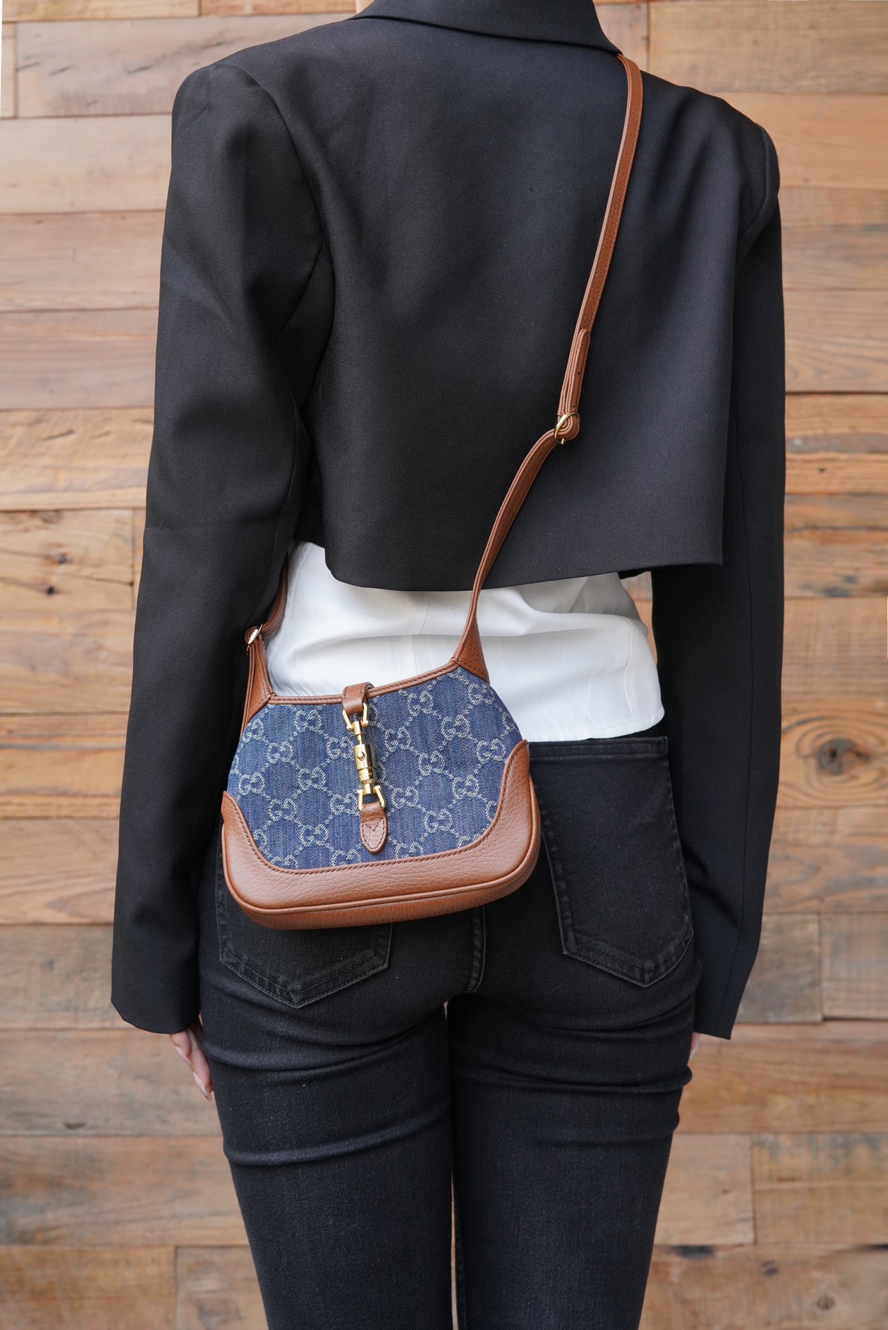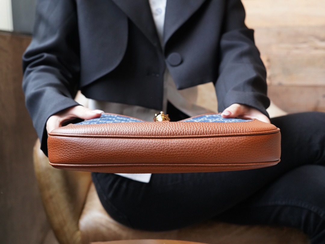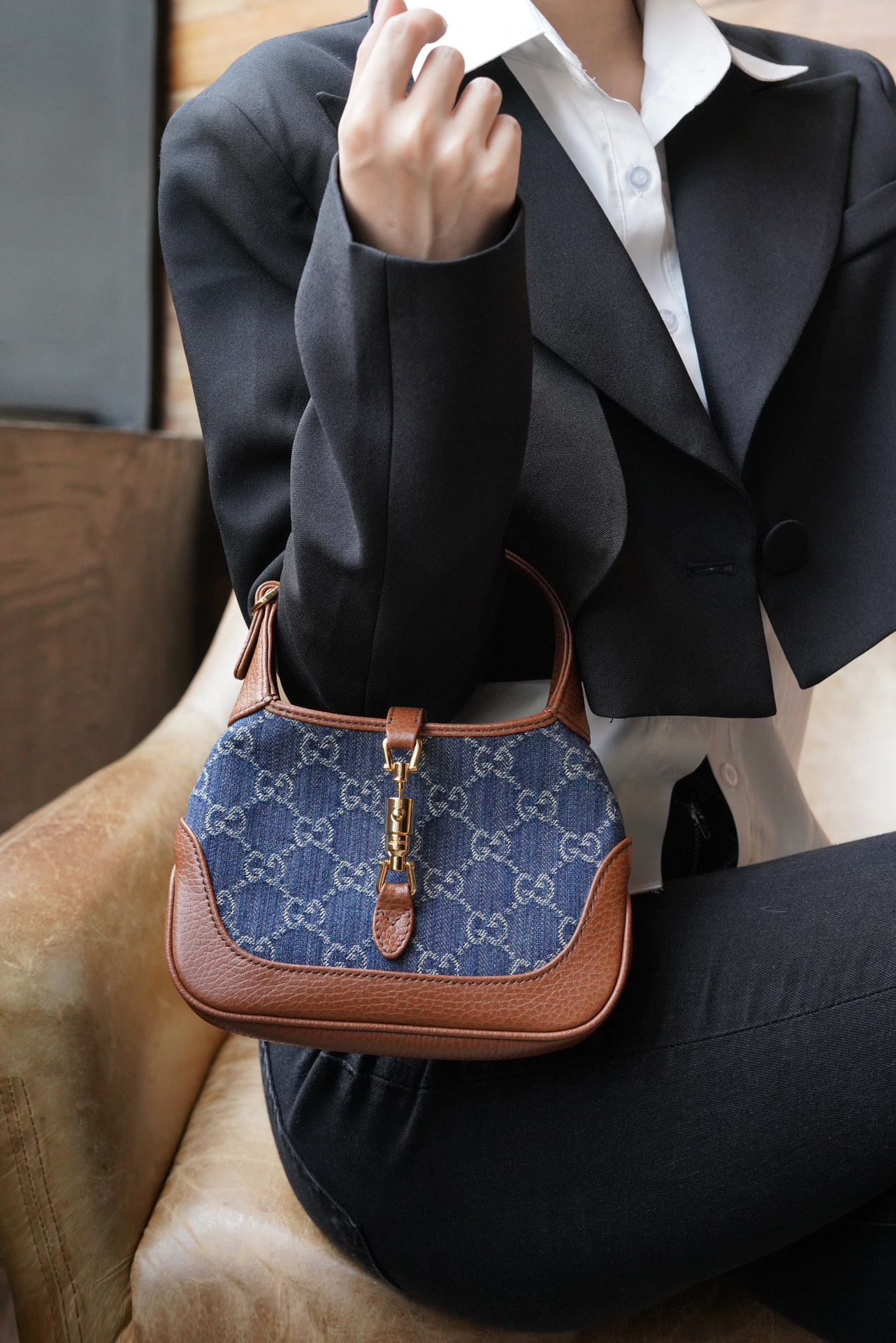 古驰 Jackie1961复古金扣老花LOGO牛仔皮拼皮腋下包手提单肩斜挎包 女款灰蓝色/棕色(LZ)