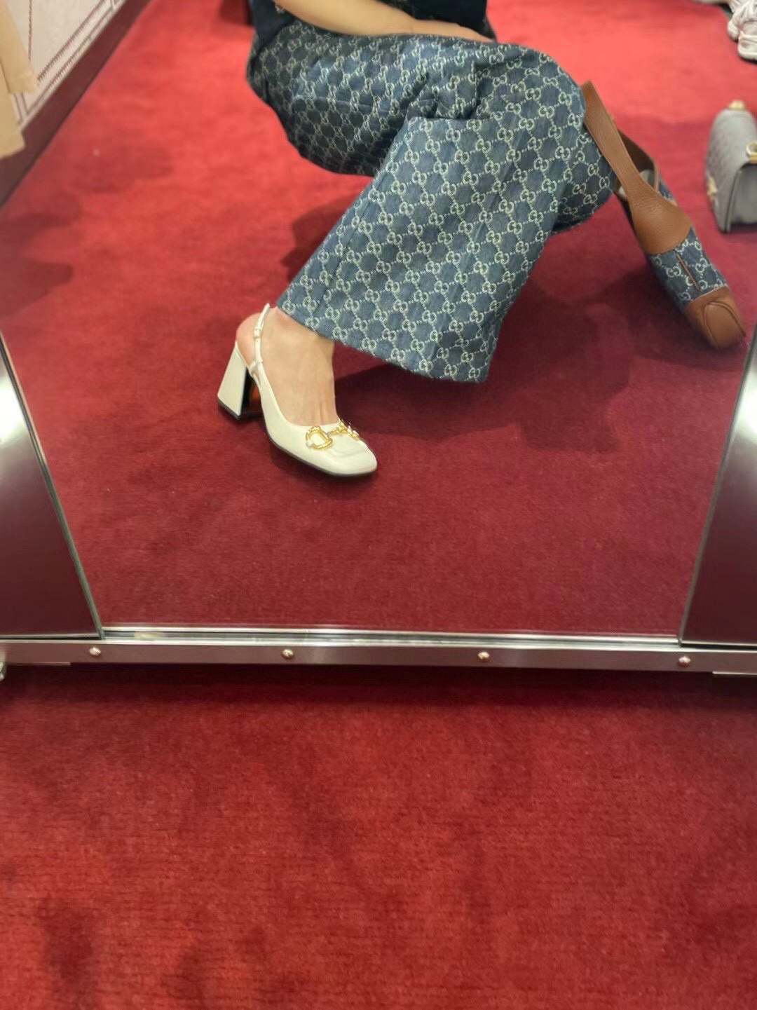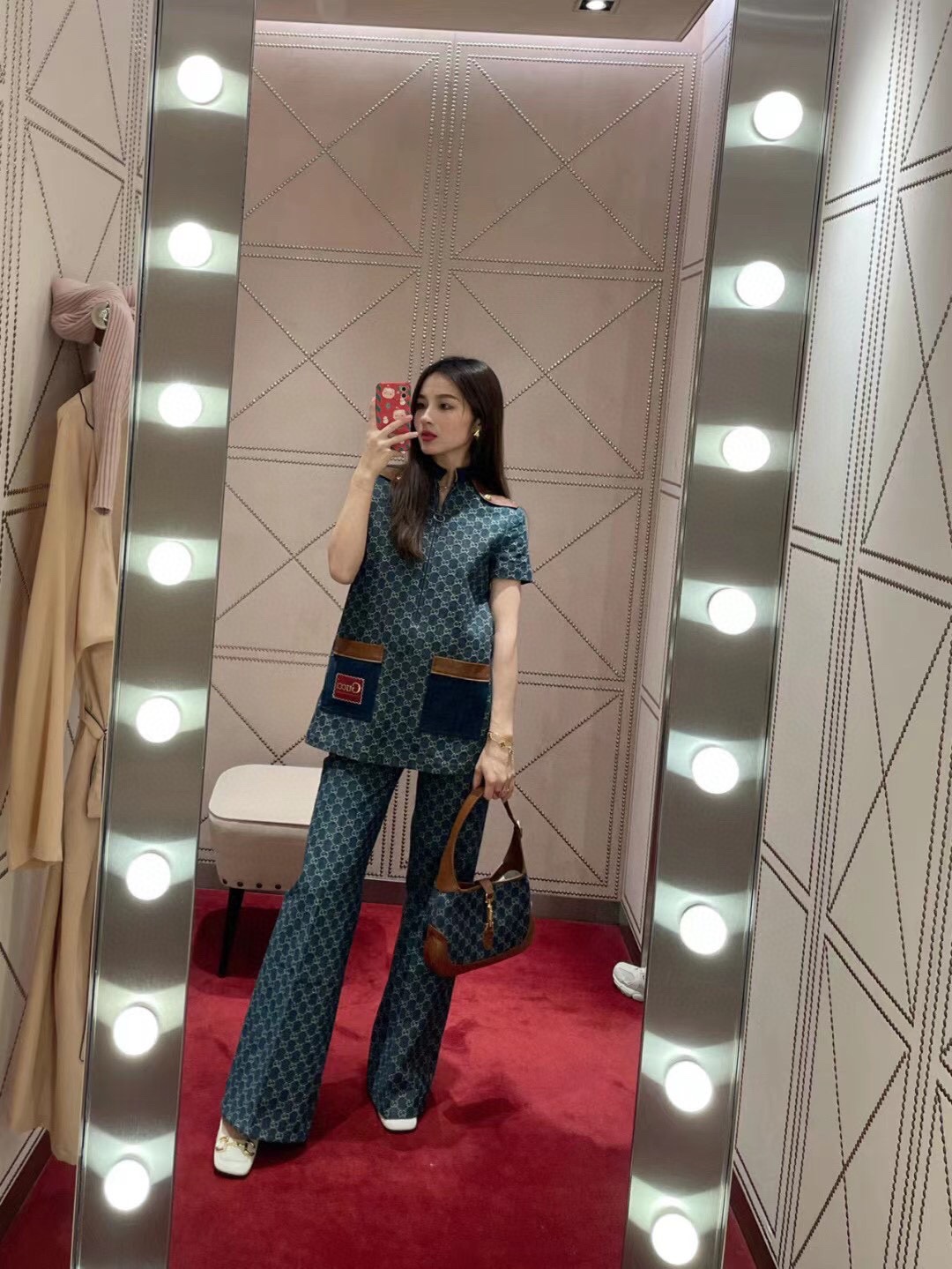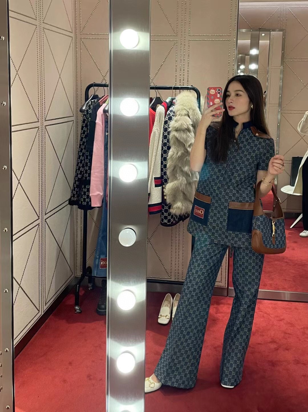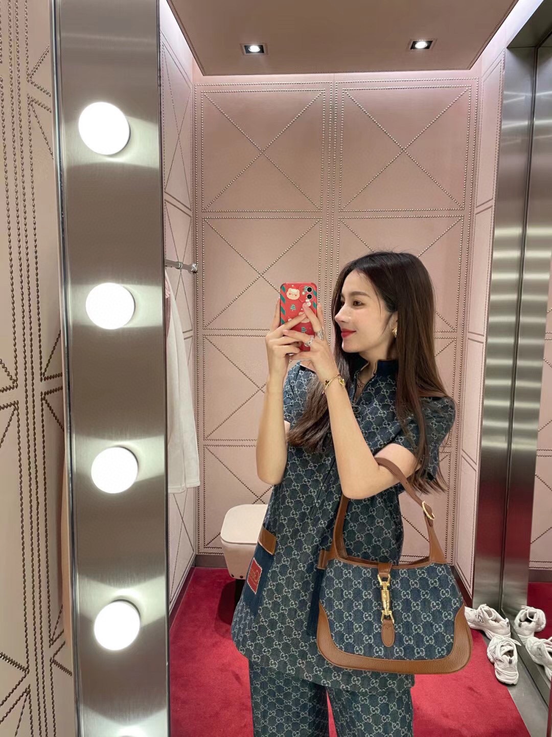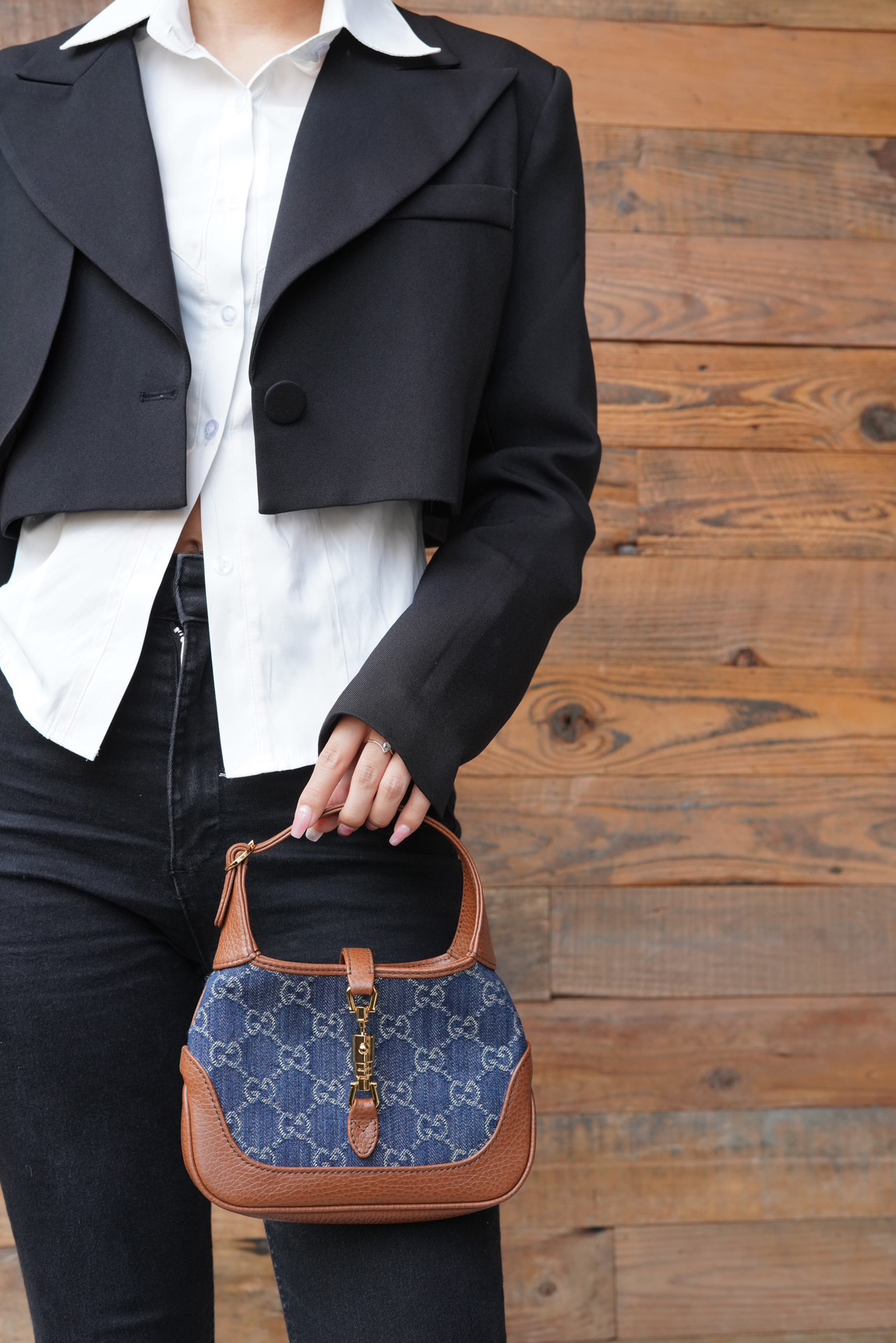 古驰 Jackie1961复古金扣老花LOGO牛仔皮拼皮腋下包手提单肩斜挎包 女款灰蓝色/棕色(LZ)