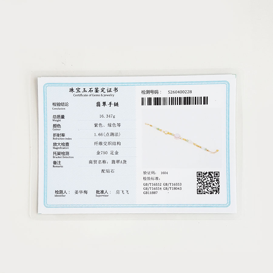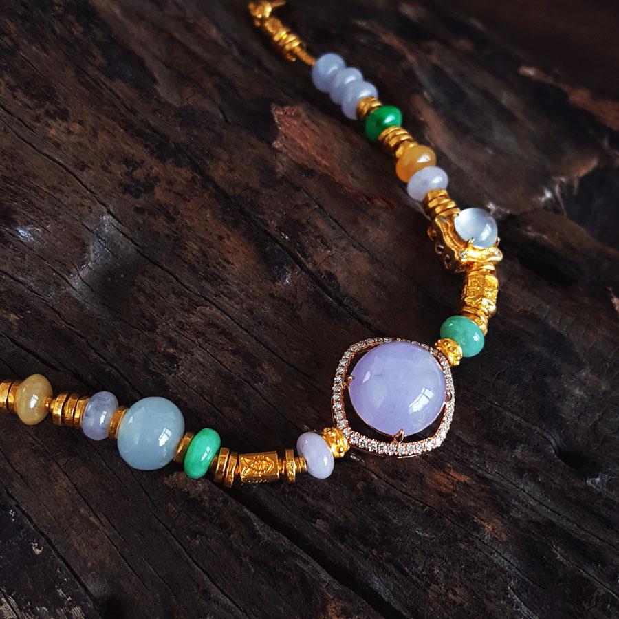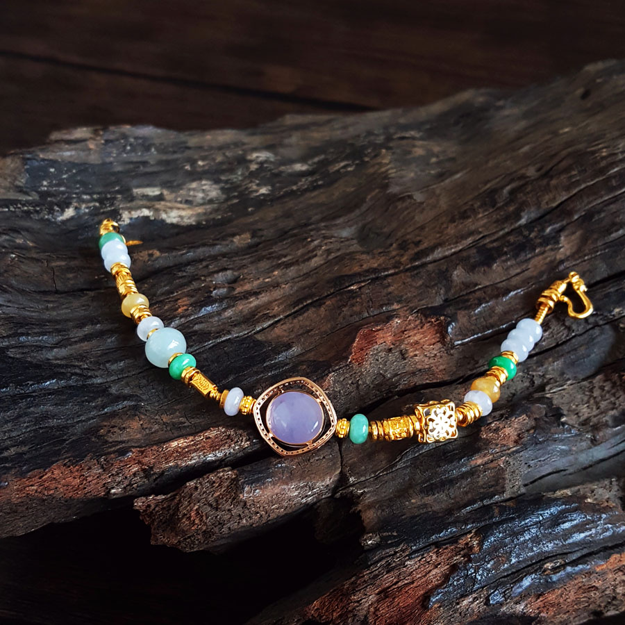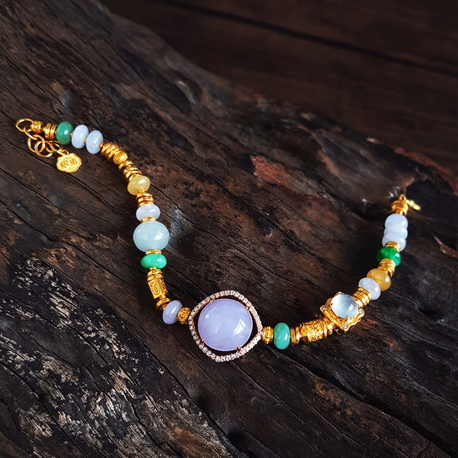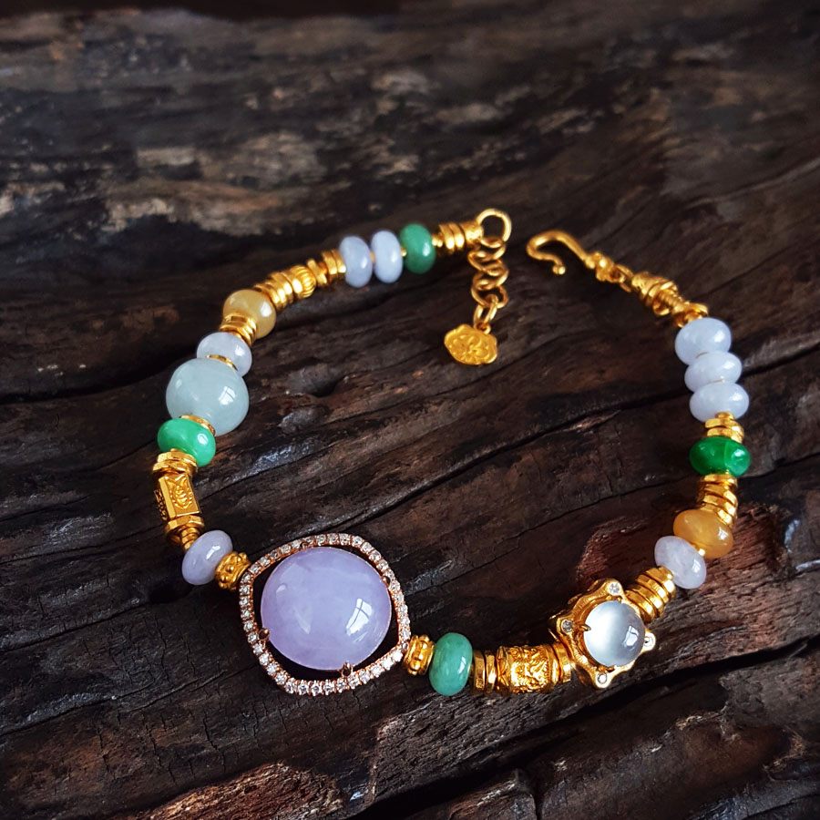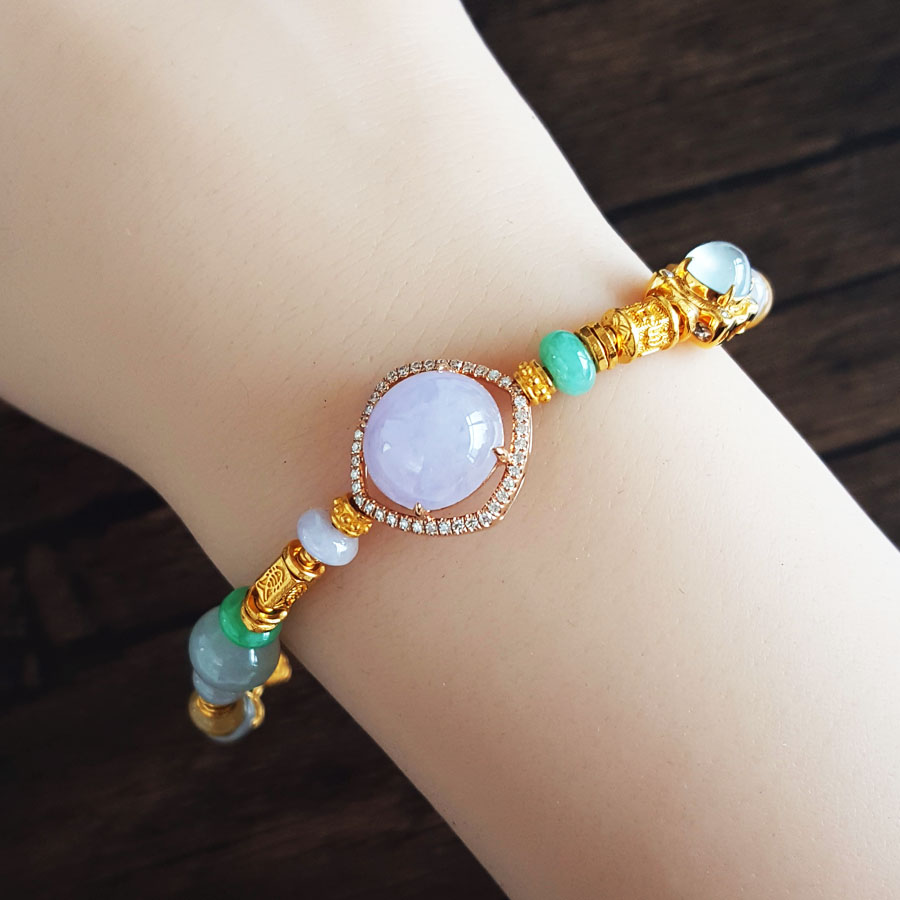 名称 | AU750收藏级双色金镶钻镶天然细腻糯冰种紫罗兰蛋面翡翠配足金盘缠福禄寿算盘珠翡翠手链 |