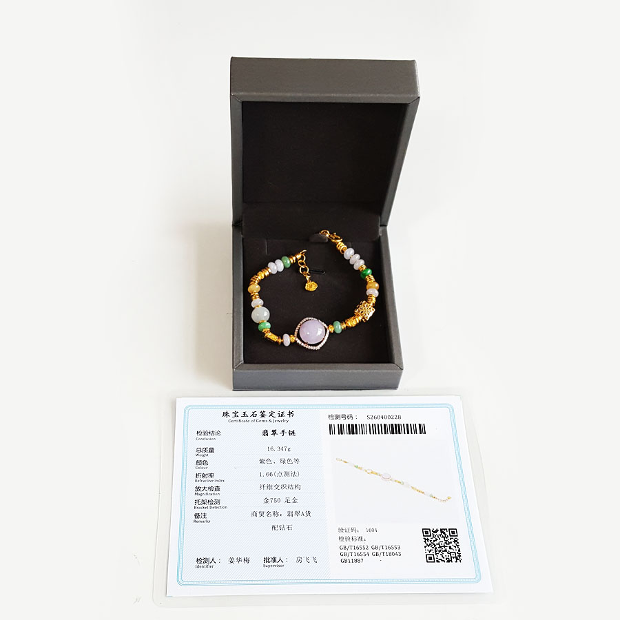 【天然正品】A货翡翠AU750收藏级双色金镶钻镶天然细腻糯冰种紫罗兰蛋面翡翠配足金盘缠福禄寿算盘珠翡翠手链 链长:19CM(长度可调节)010426NJT11