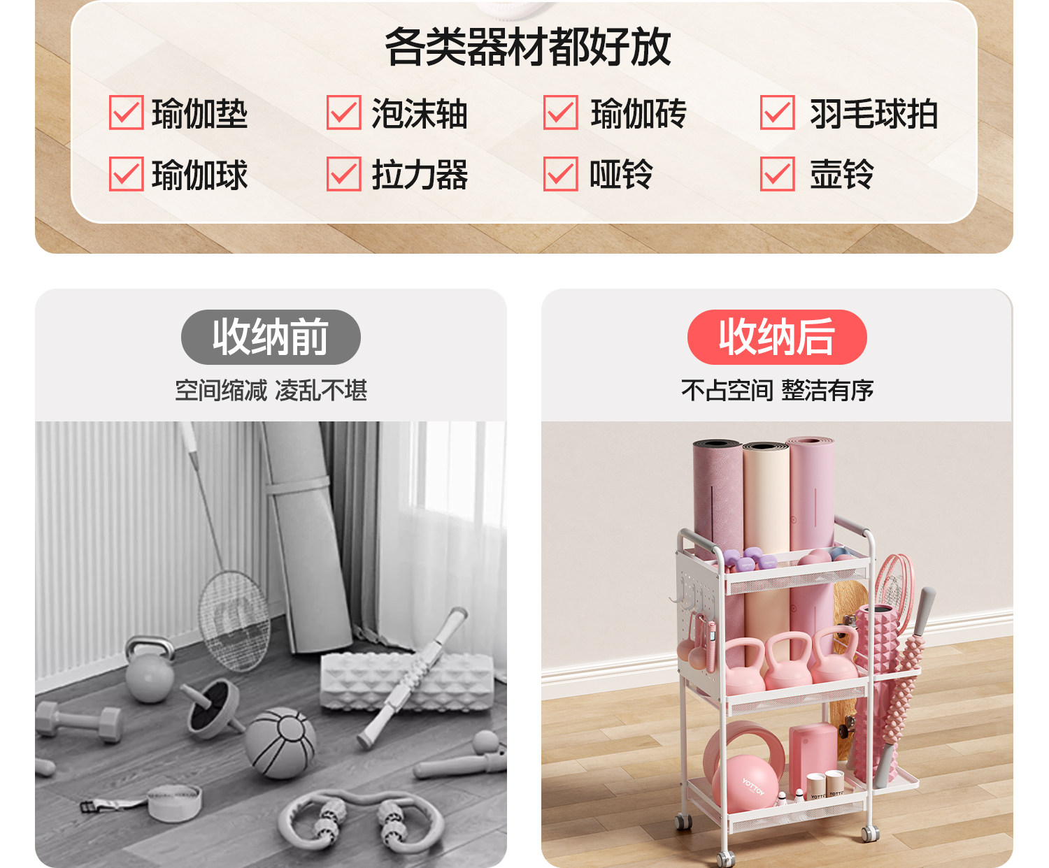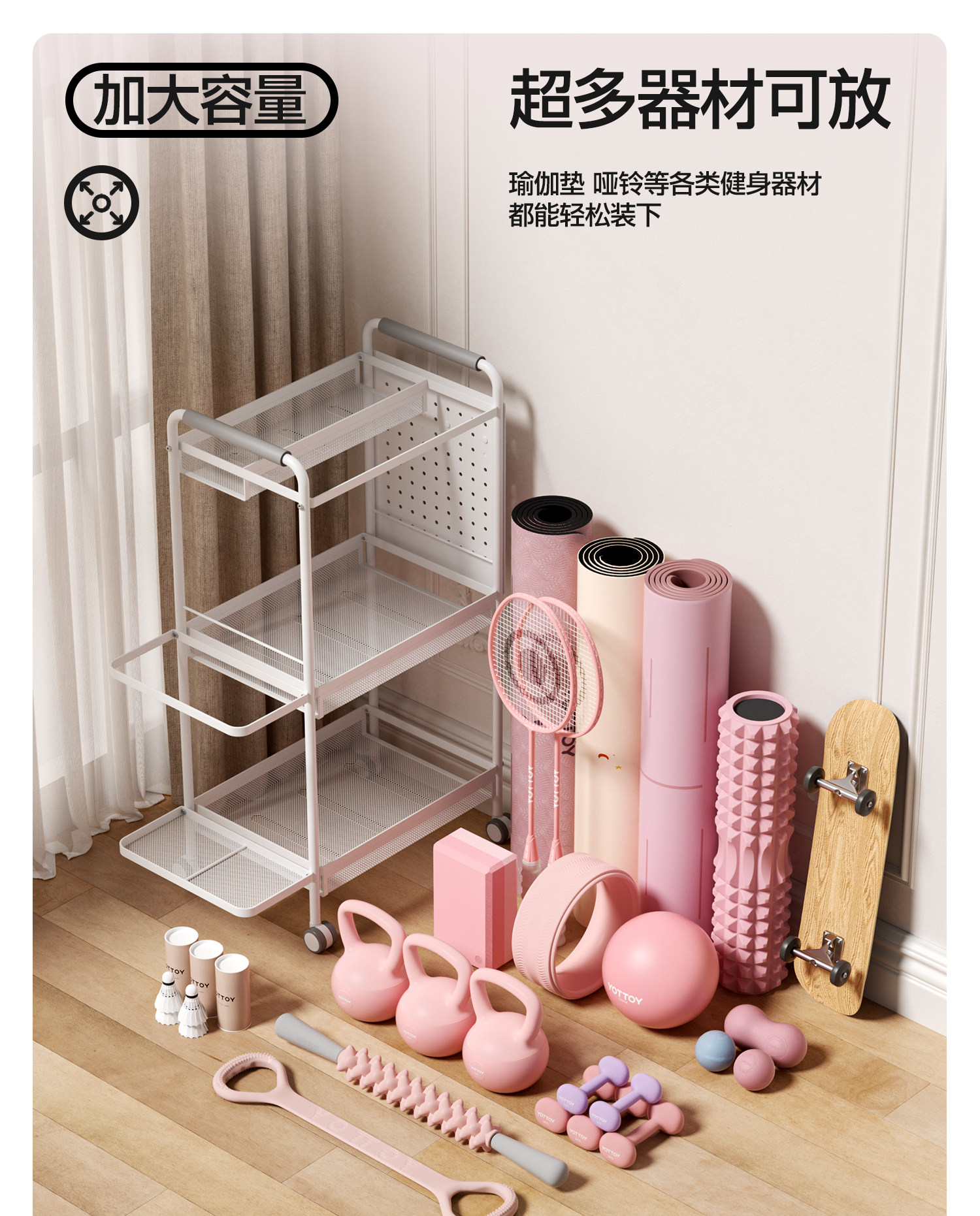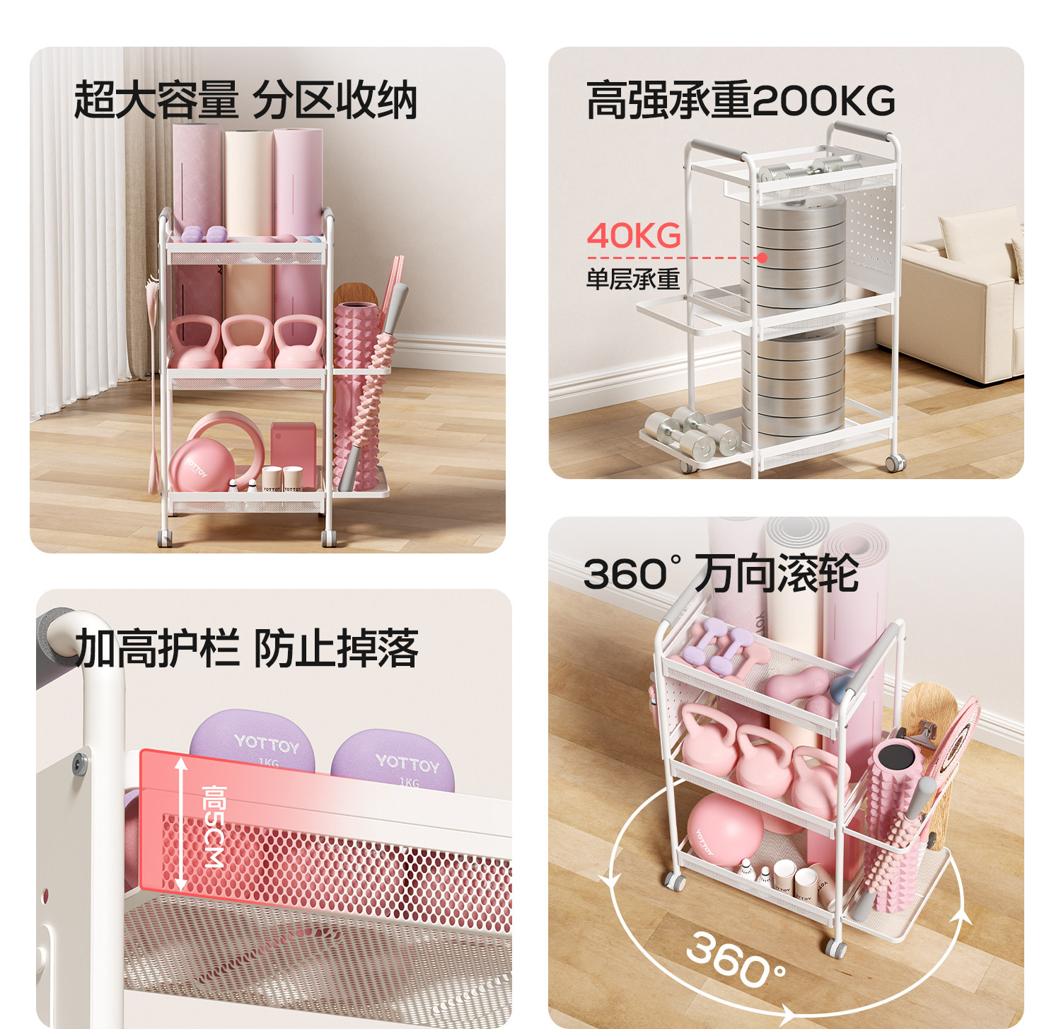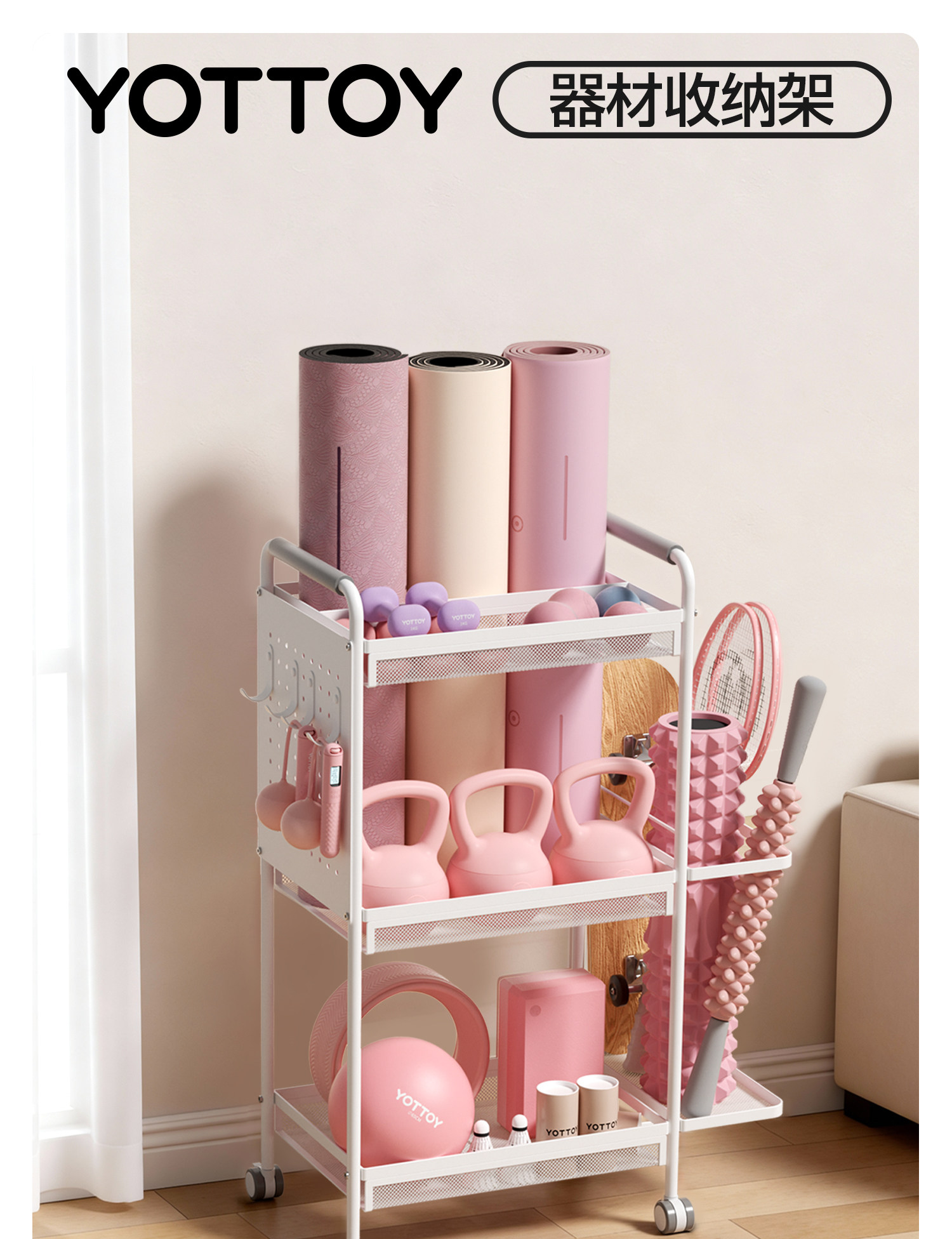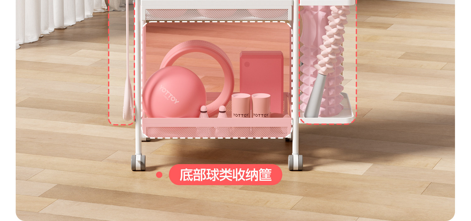 YOTTOY健身器材收纳架瑜伽垫收纳筐移动家用泡沫轴哑铃运动置物架