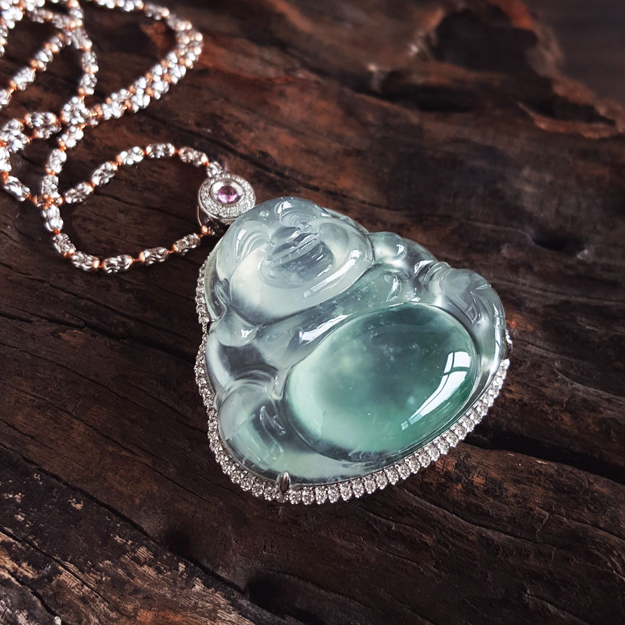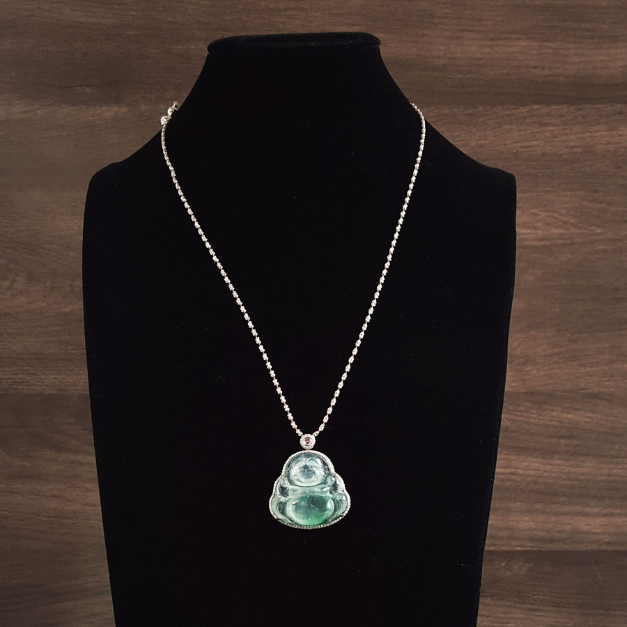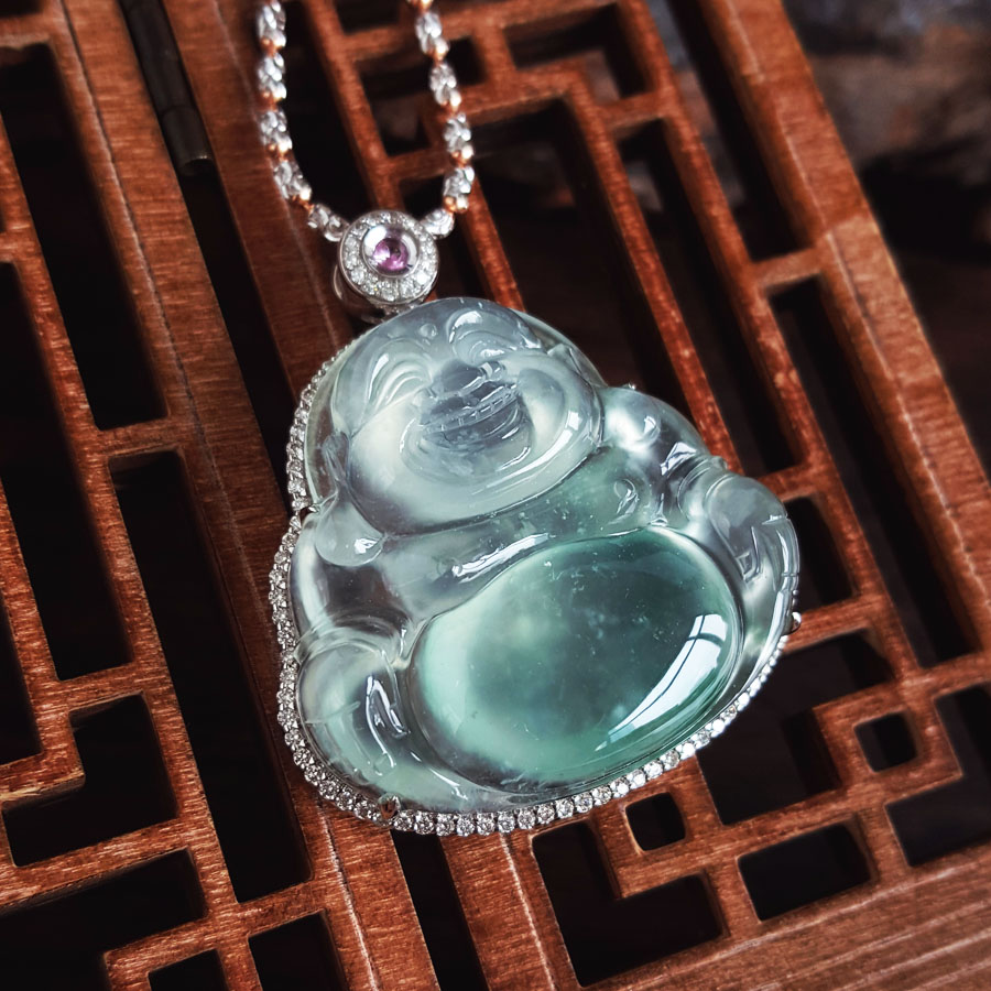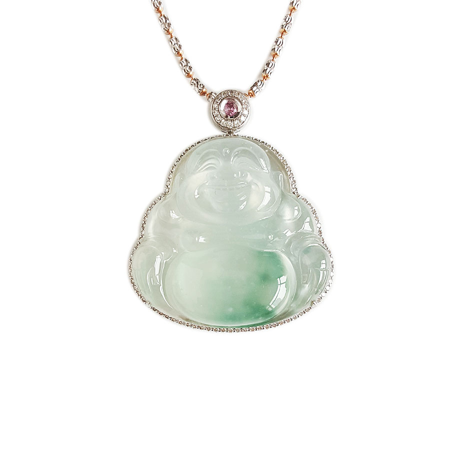 名称 | AU750收藏级白金镶钻镶天然细腻白色飘蓝花高冰种佛公翡翠吊坠项链 |
