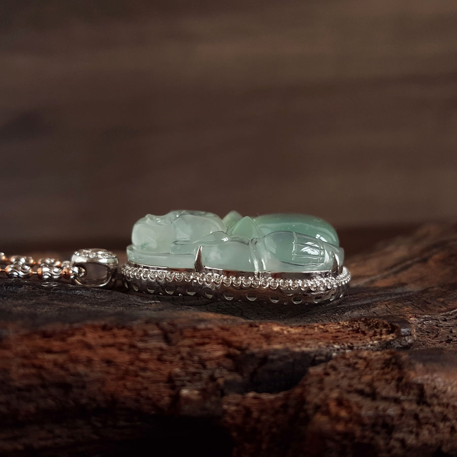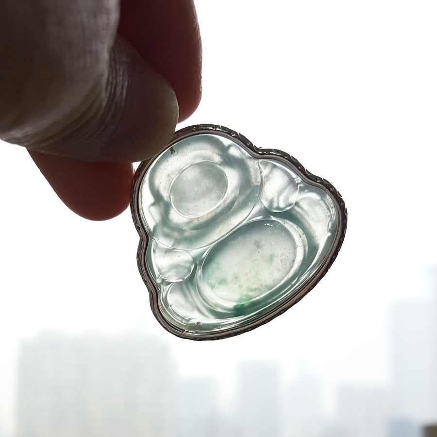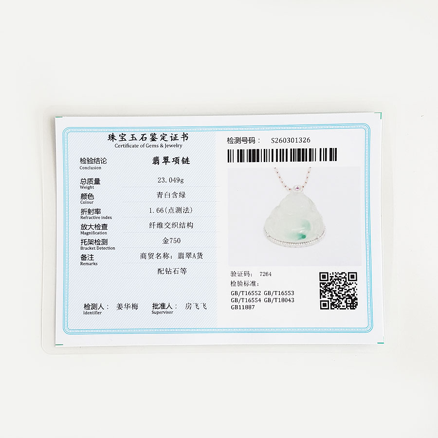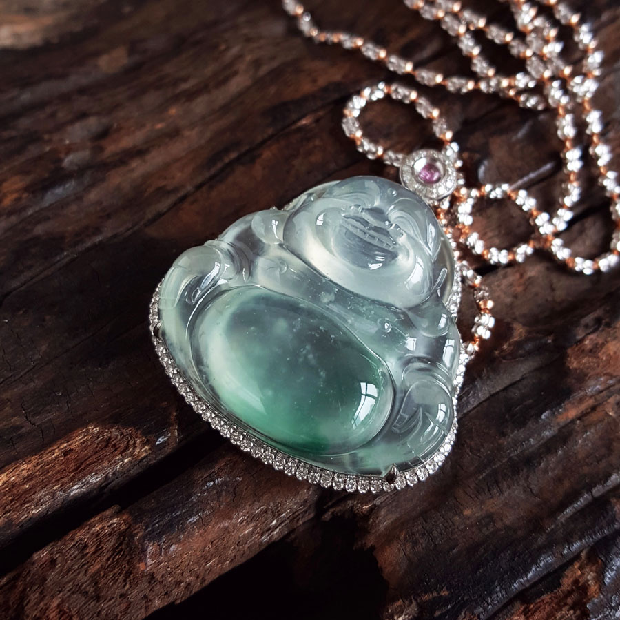 名称 | AU750收藏级白金镶钻镶天然细腻白色飘蓝花高冰种佛公翡翠吊坠项链 |