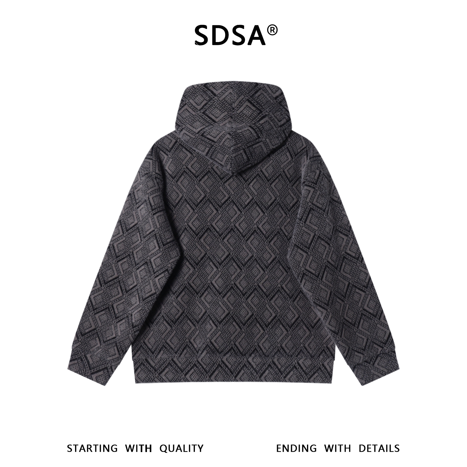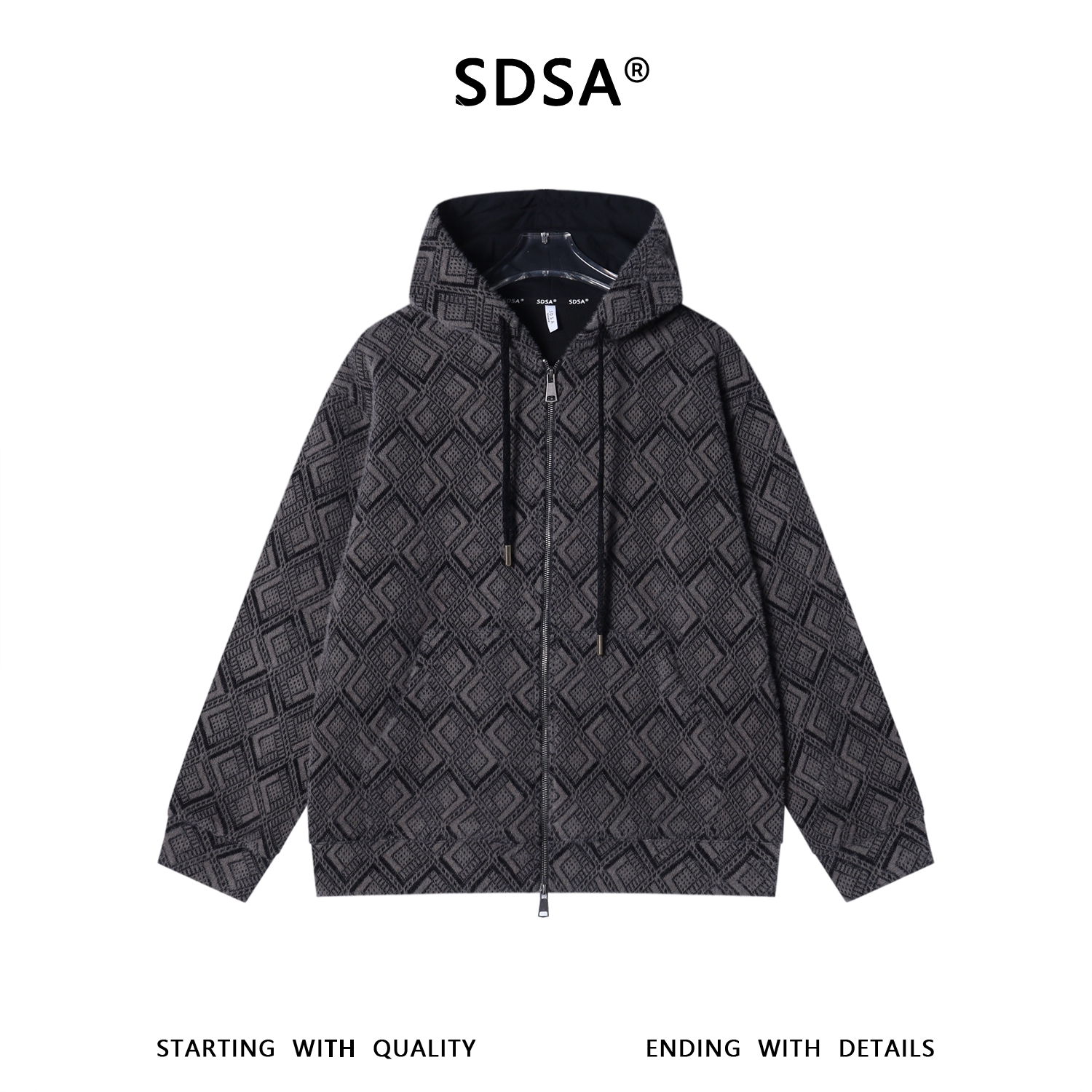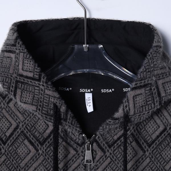 SDSA男士秋冬新款痞帅男装设计师菱形格绒毛拉链连帽卫衣宽松百搭