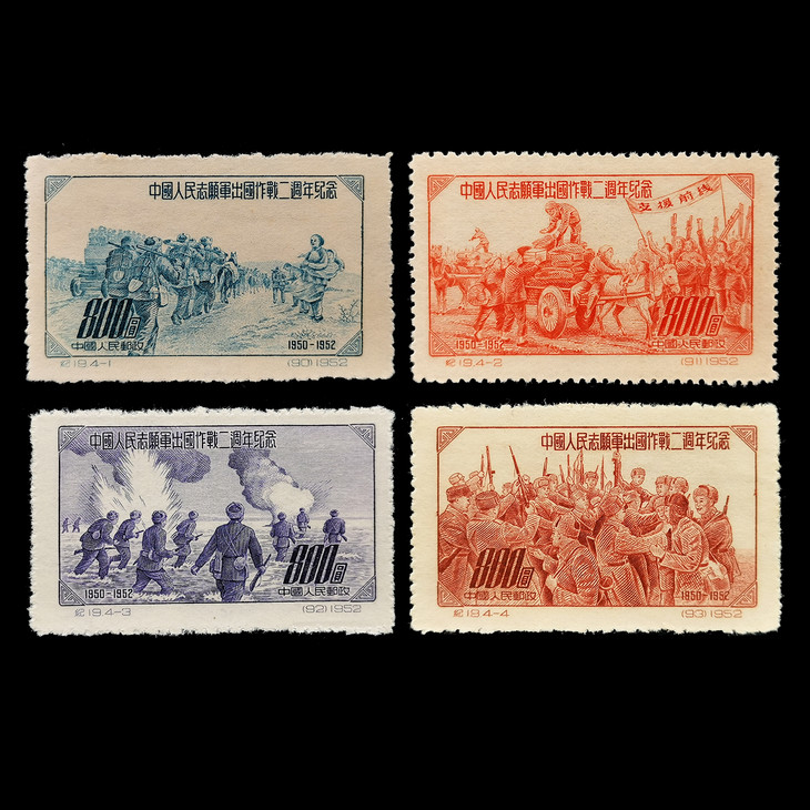 1952年11月15日,为了纪念中国人民志愿军赴朝作战2周年,中华人民共和国邮电部发行一套《中国人民志愿军出国作战二周年纪念》纪念邮票,全套4枚。