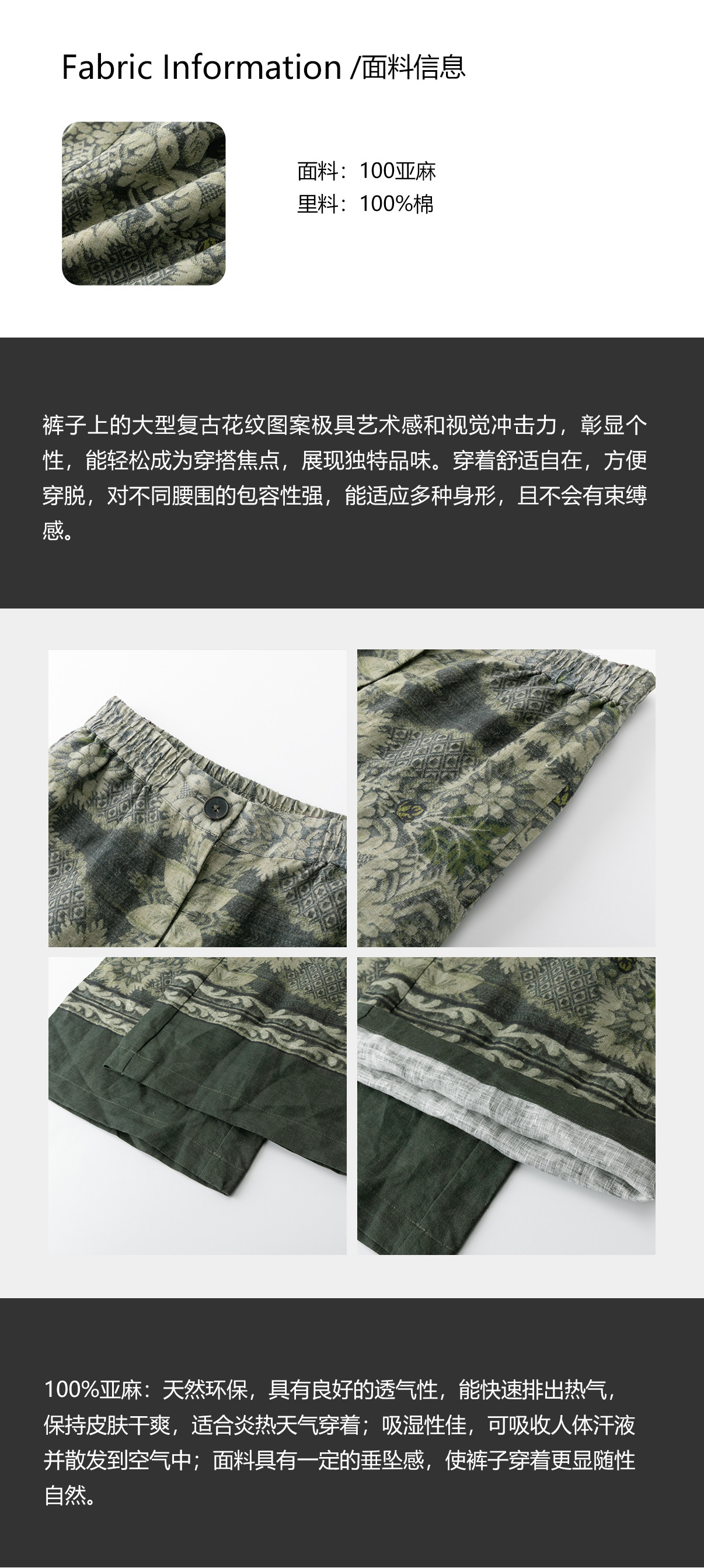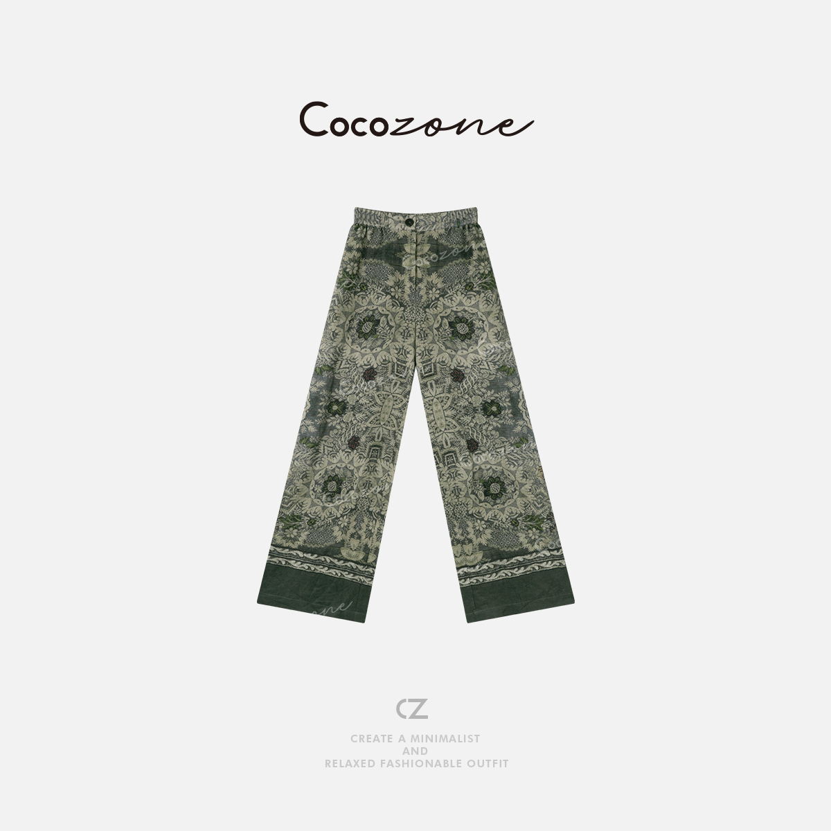 COCO ZONE 刘一一 【100亚麻】印花慵懒风直筒女休闲裤CD2A0769