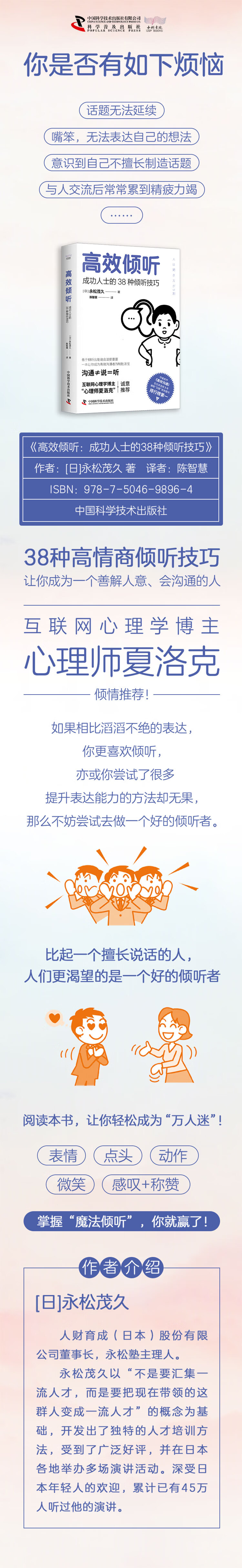 实在不善于表达也并无大碍。不用去改变,也不用勉强自己说好话,你只需认真倾听即可。掌握本书介绍的38种倾听技巧,你就能成为一名难能可贵的倾听者。