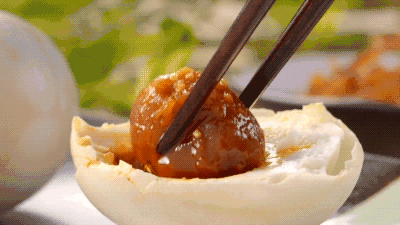 “高邮咸蛋的特点是质细而油多。蛋白柔嫩……筷子头一扎下去,吱——红油就冒出来了。高邮咸蛋的黄是通红的。”