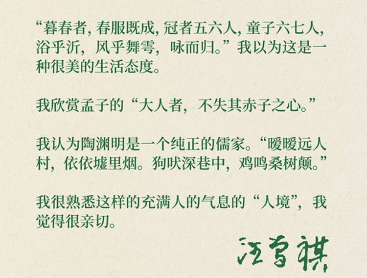 汪老爷子曾言:“我希望我的作品能有益于世道人心,我希望使人的感情得到滋润,让人觉得生活是美好的。”